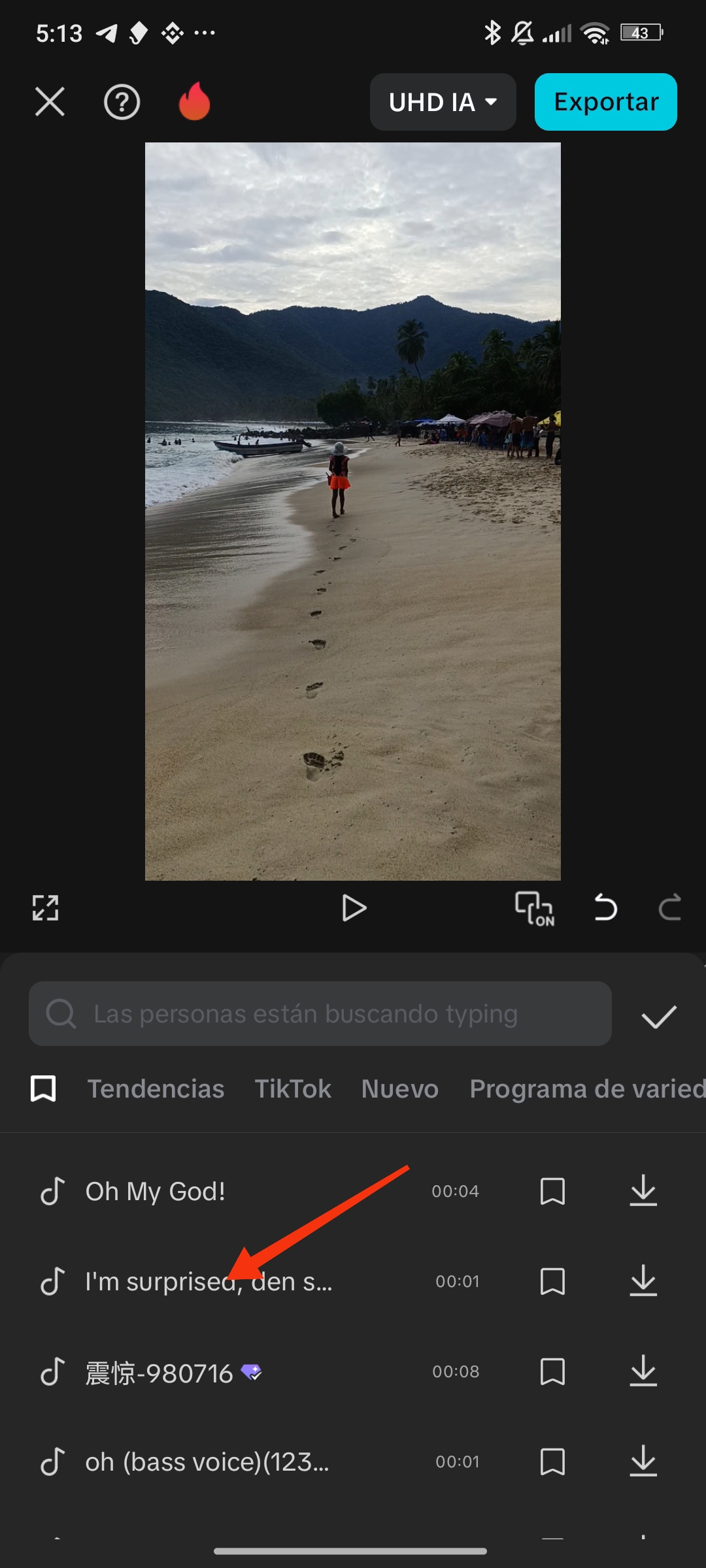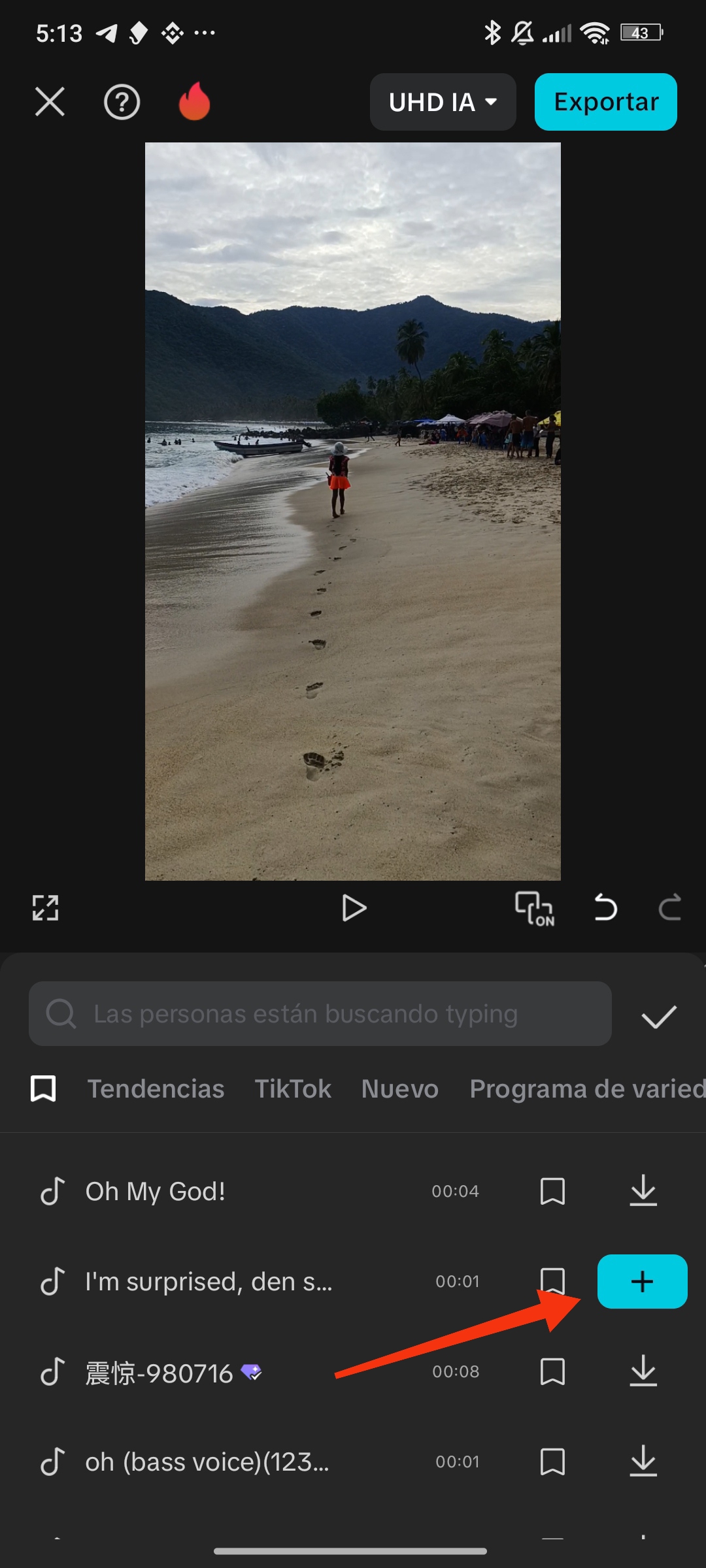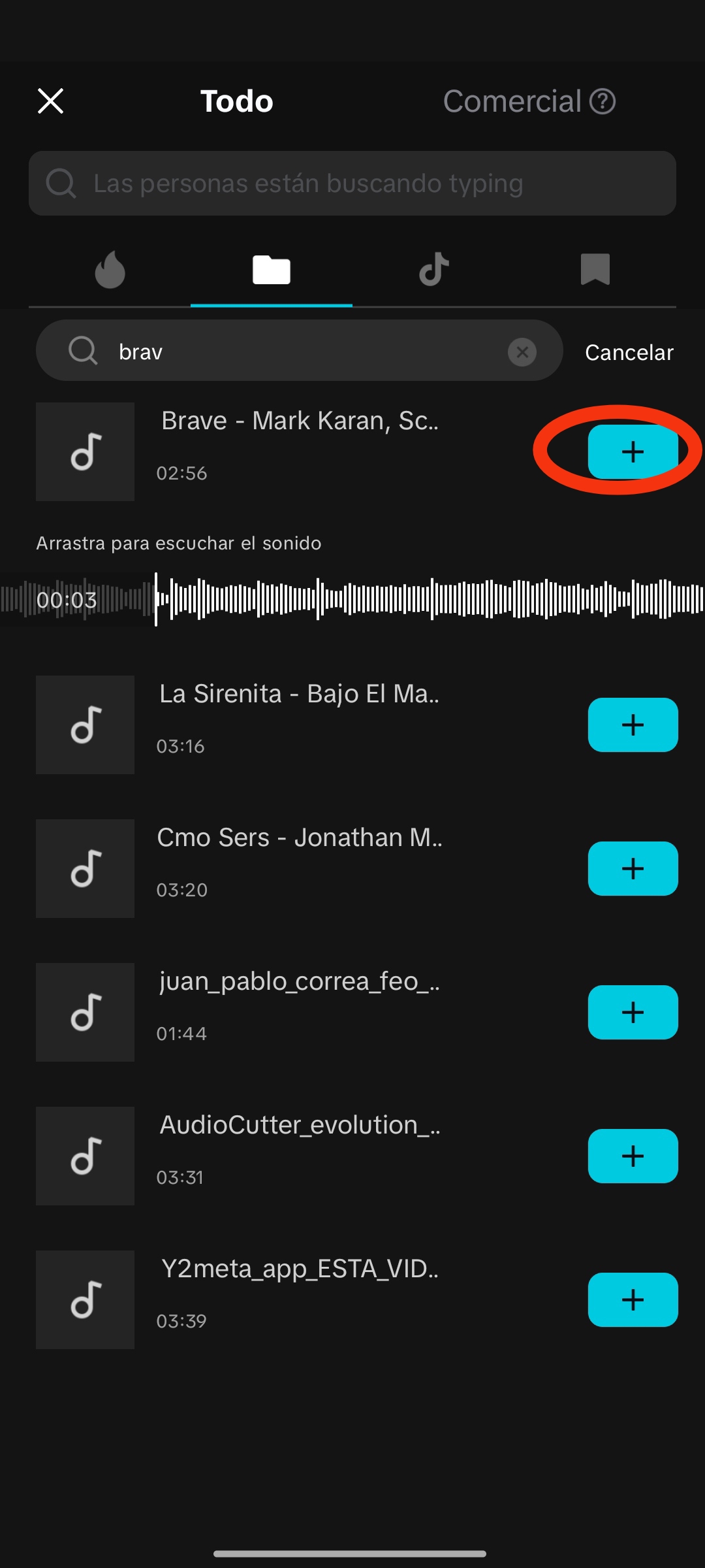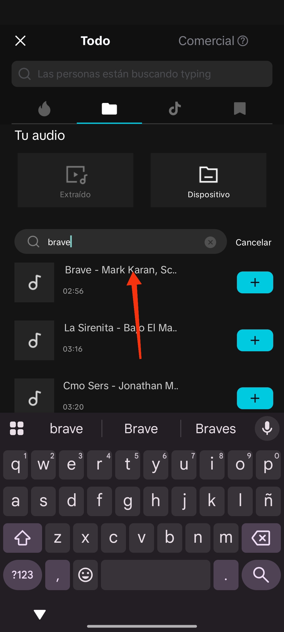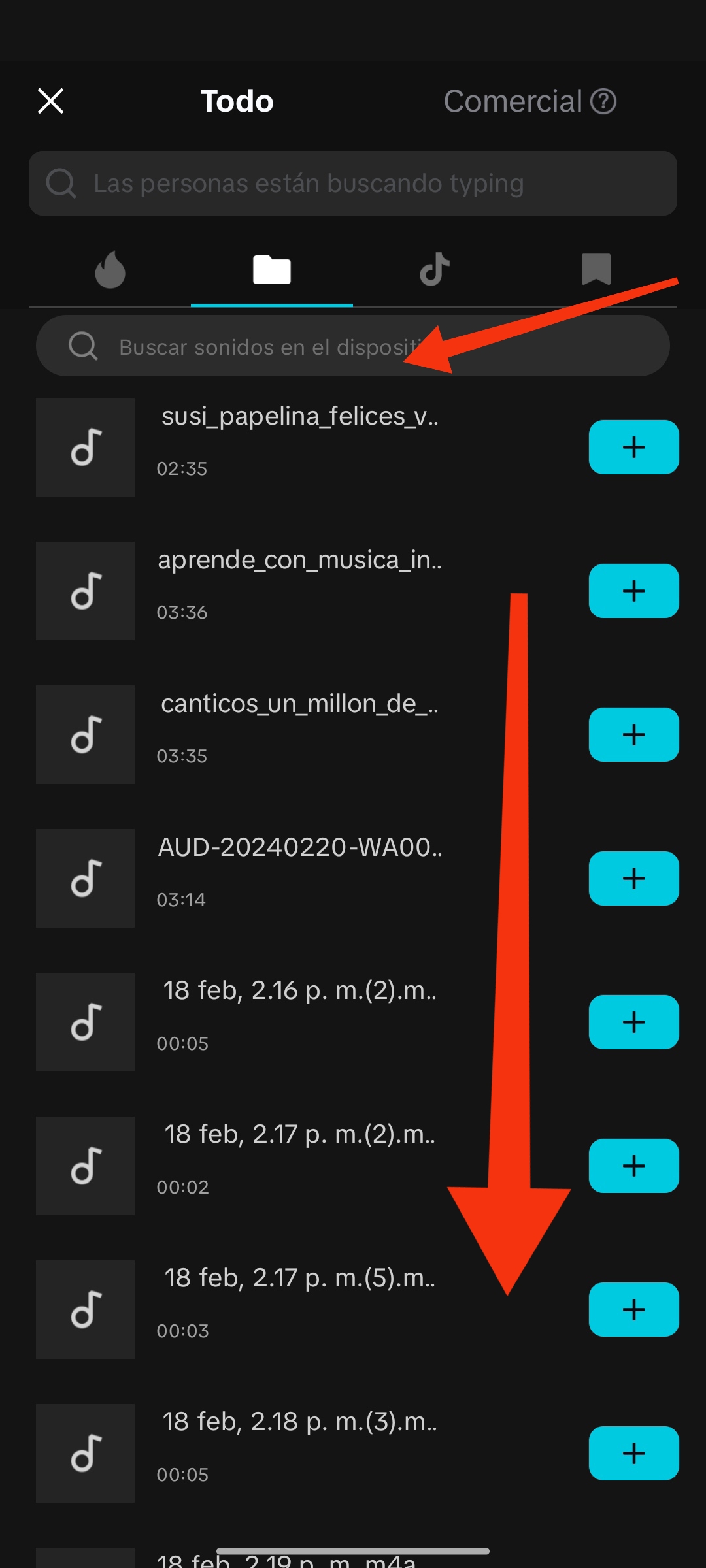 Al dar clic en Dispositivo, automáticamente nos aparecen las músicas y audios guardados en el teléfono. Podemos deslizar hacia abajo para buscar o simplemente usar la herramienta de búsqueda para facilitar, para confirmar que ese es el audio que queremos le hacemos clic en el nombre de audio y se reproduce, para agregar solo debemos darle al botón de mas y sale en nuestra linea de tiempo.