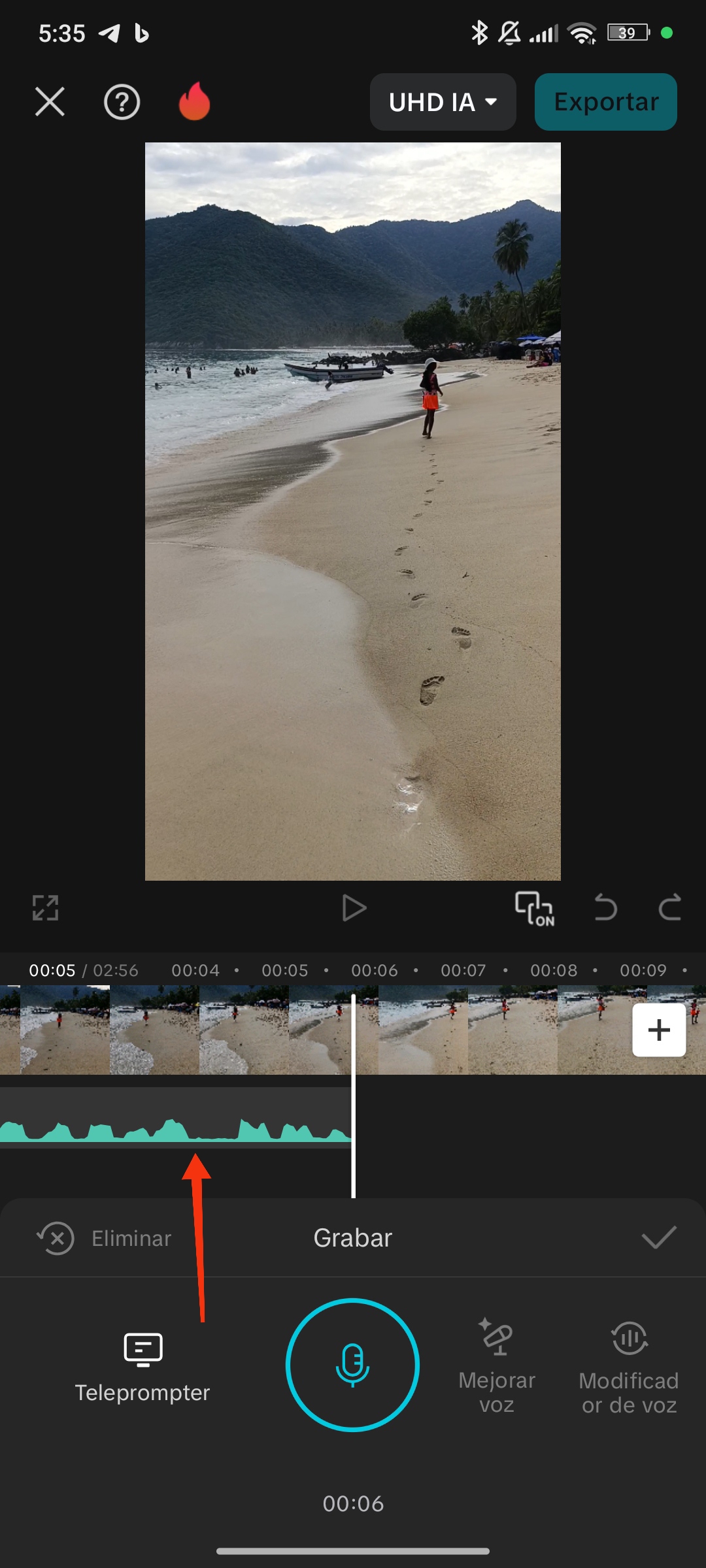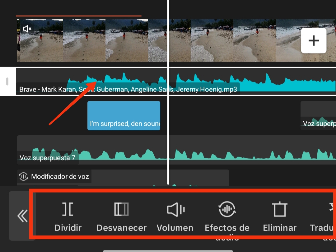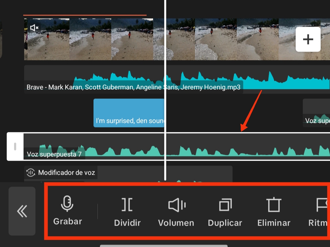 Al hacer clic en uno de los audios, se nos abre una nueva menu con los íconos de dividir, volumen, duplicar, eliminar, velocidad y herramientas pro, como mejorar voz, aislar voz y reducir ruidos.