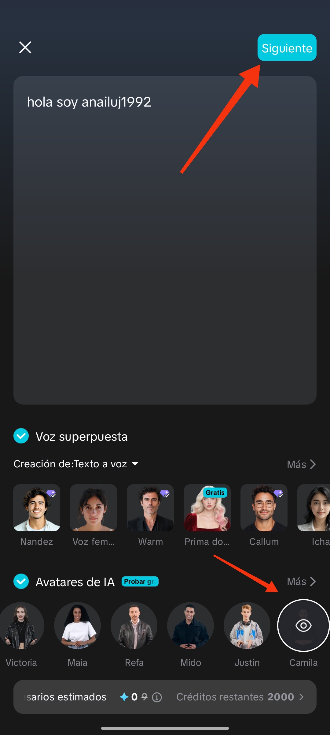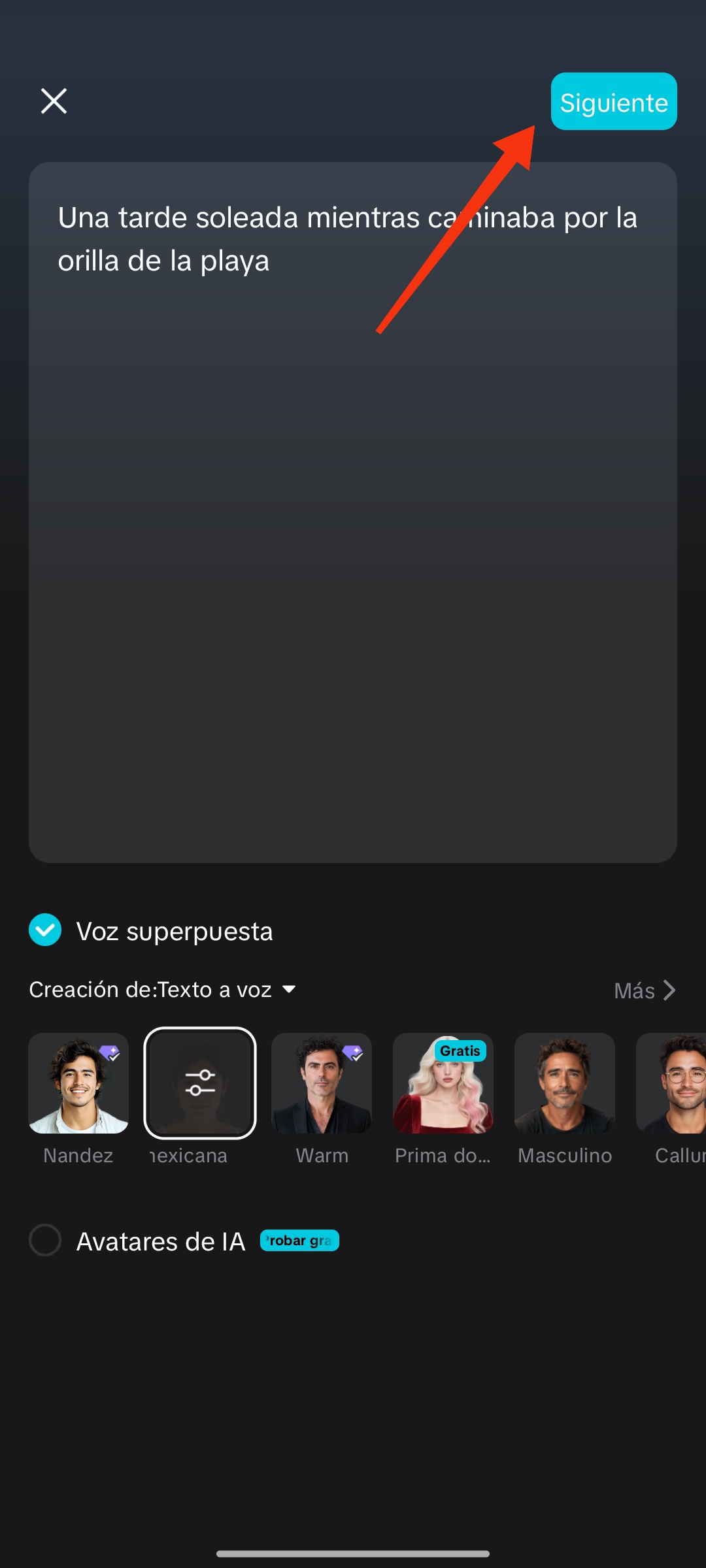 | Clic avatar IA | Seleccionar avatar y clic en siguiente | Avatar superpuesto |