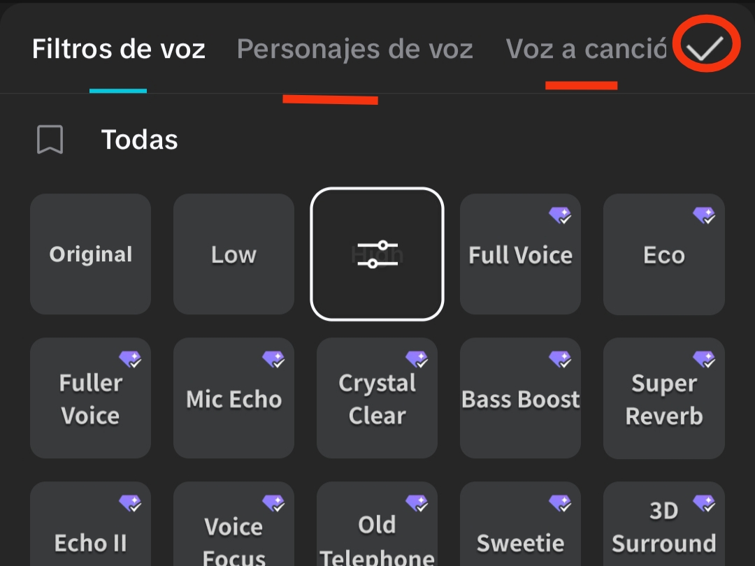 En el modificador de voz, podemos cambiarla totalmente; por ejemplo, nuestra voz podría sonar como una ardilla. Buscas las opciones disponibles y si te gusta alguna le das al icono ✅
