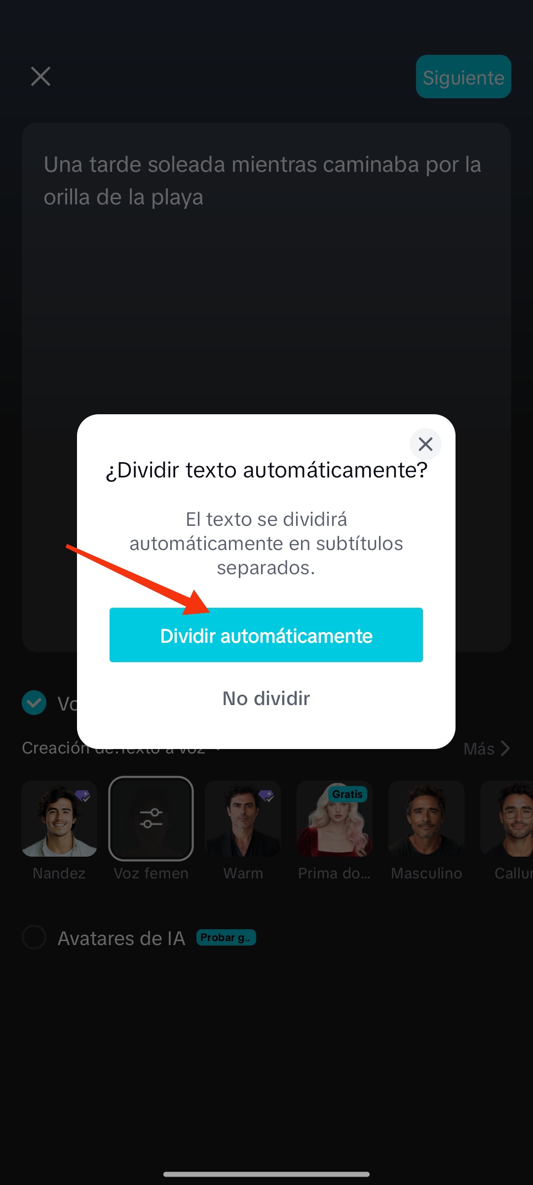 | Escribir texto y Clic en hecho | Seleccionar la voz y clic siguiente | dividir automáticamente |