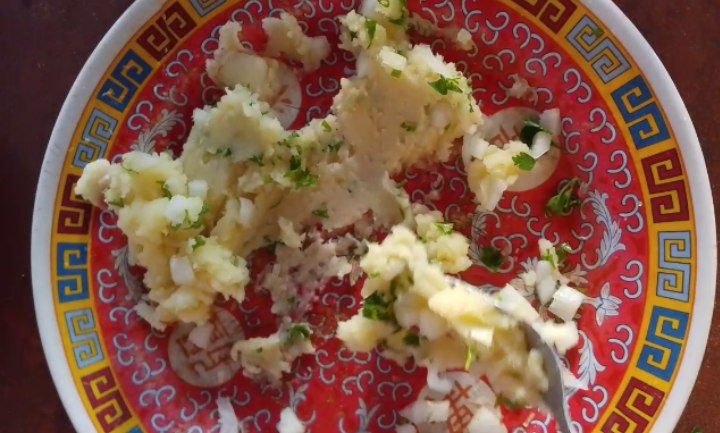 Paso 5: Una vez listas, retire la concha y aplaste así caliente; añada cebolla y perejil.