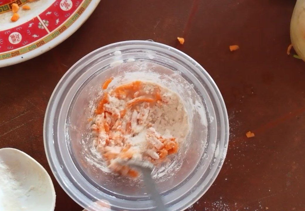 Paso 2: Luego, en un envase, añadí sal, azúcar, harina de trigo y agua hasta formar una buena mezcla.