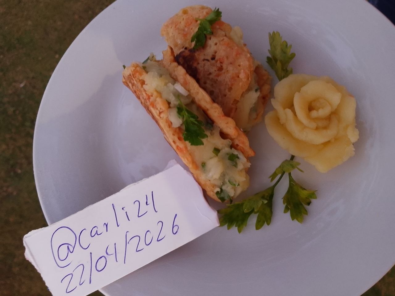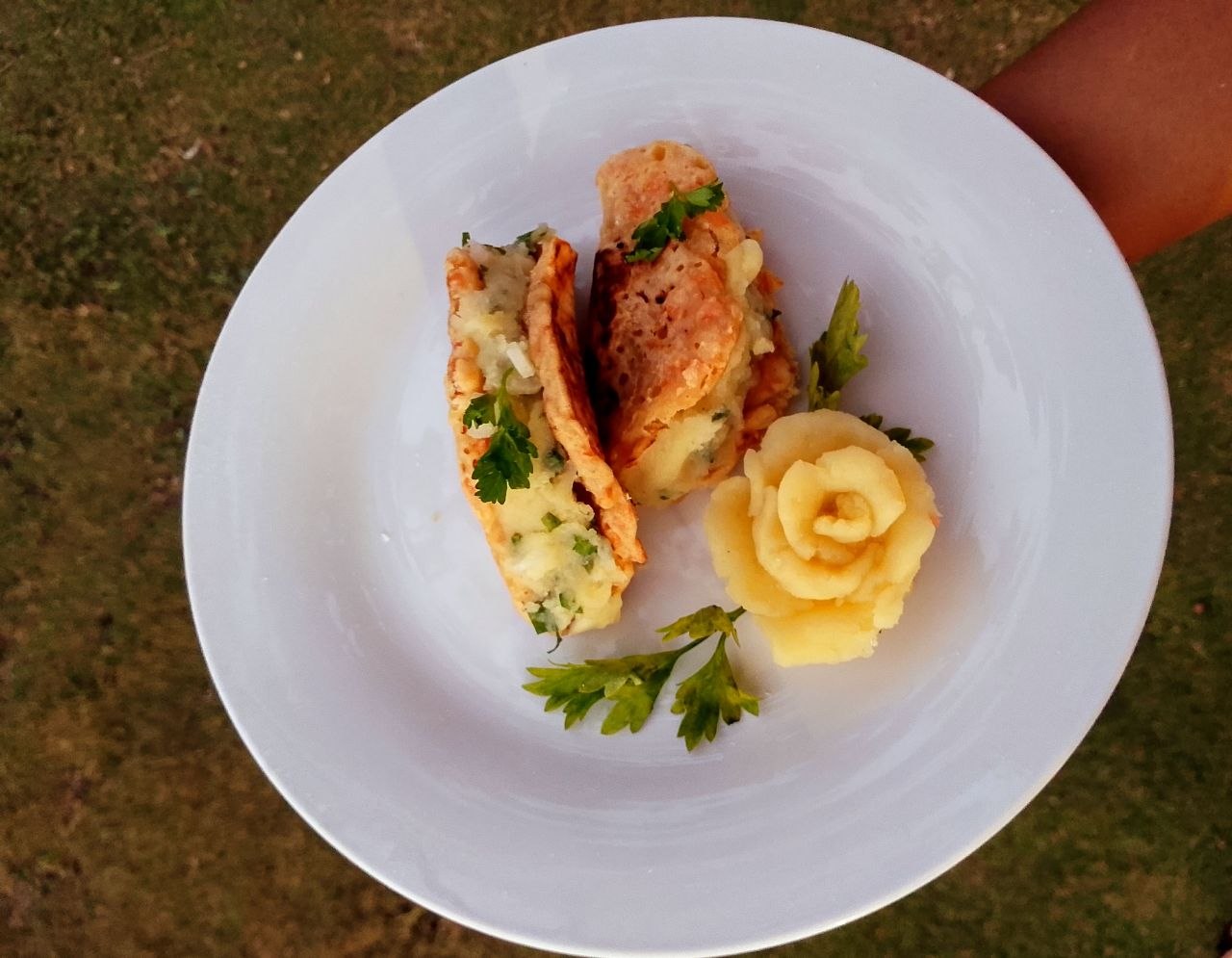 Paso 6: Después, solo toco la parte que a mí más me gusta, emplatar; para esto, realicé una rosa con puré de papa sin condimentar y adorné con ramitas de perejil.