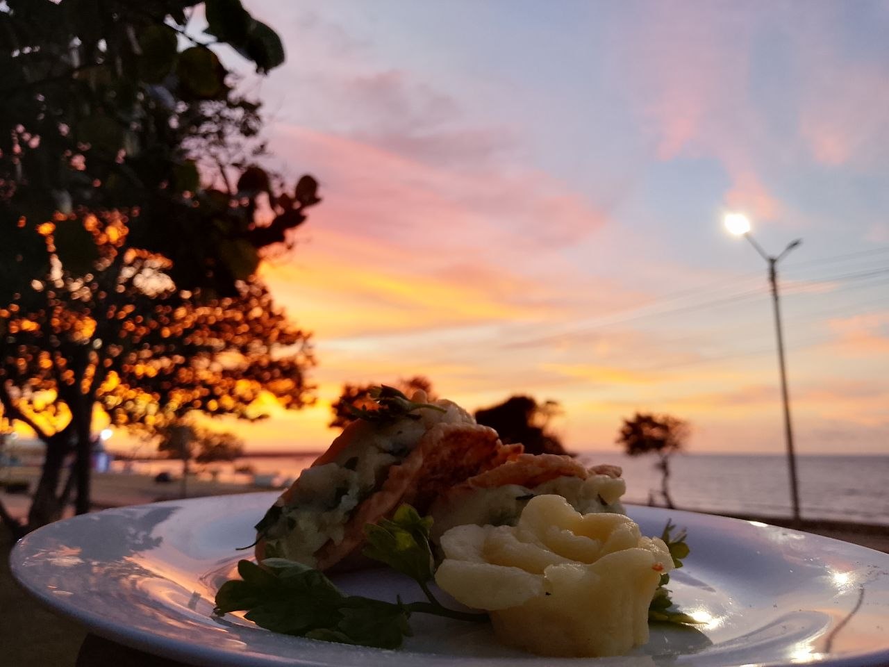 ¡Disfrute de este rico platillo muy saludable! ¡En una plaza con vista al mar! ¡Y lo mejor de todo esto fue el atardecer! ¡Simplemente hermoso!