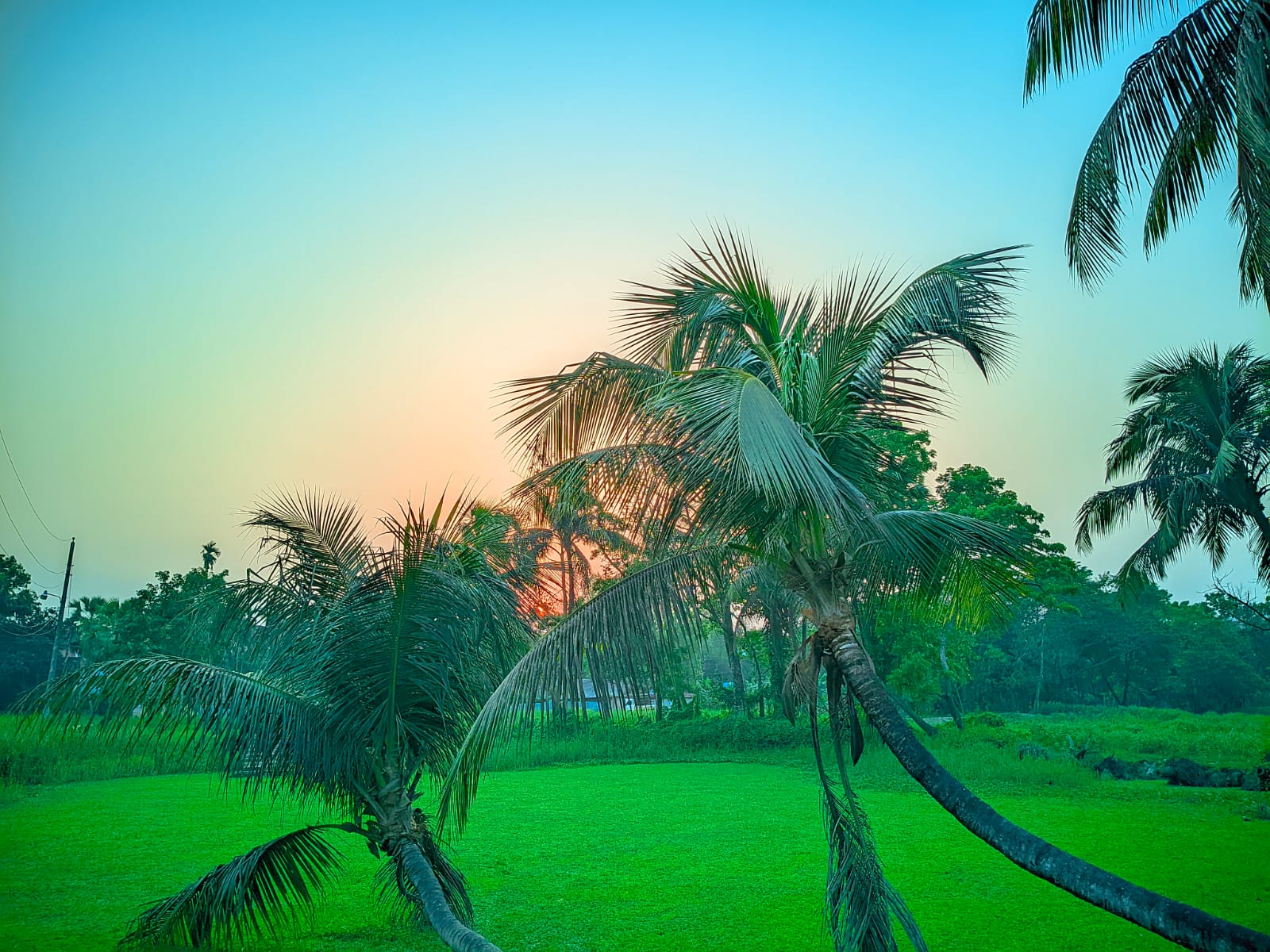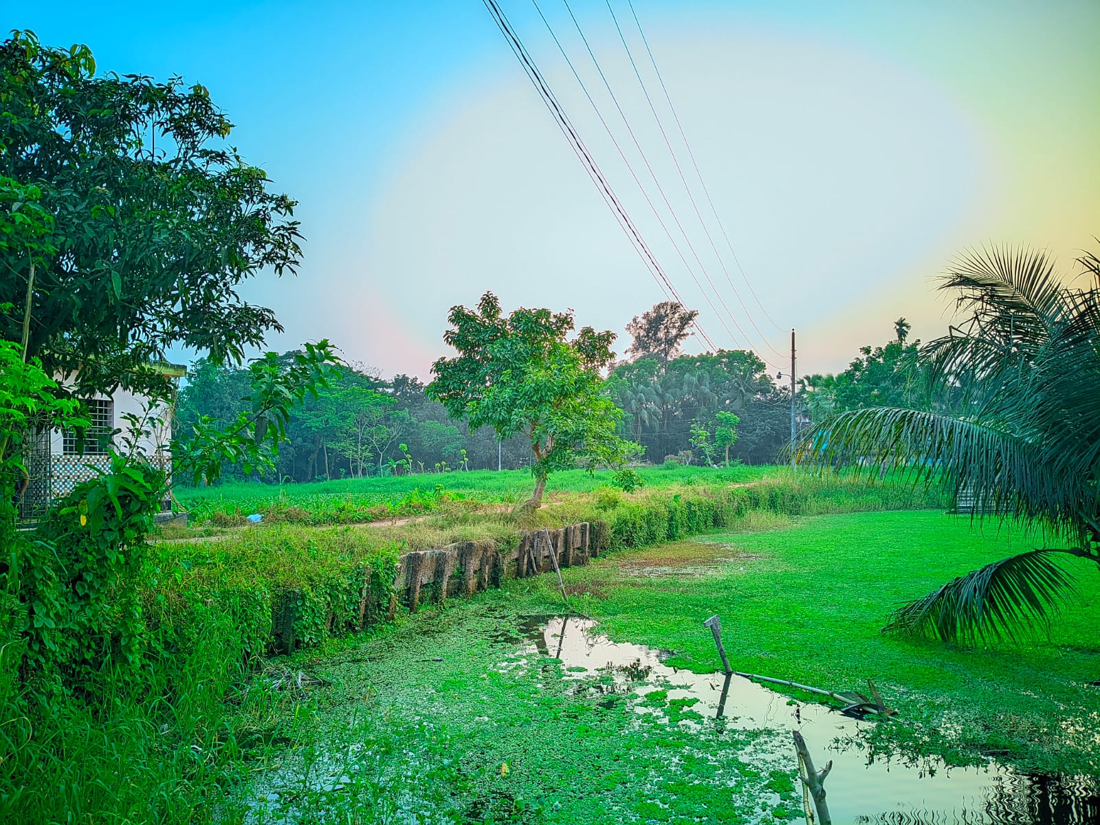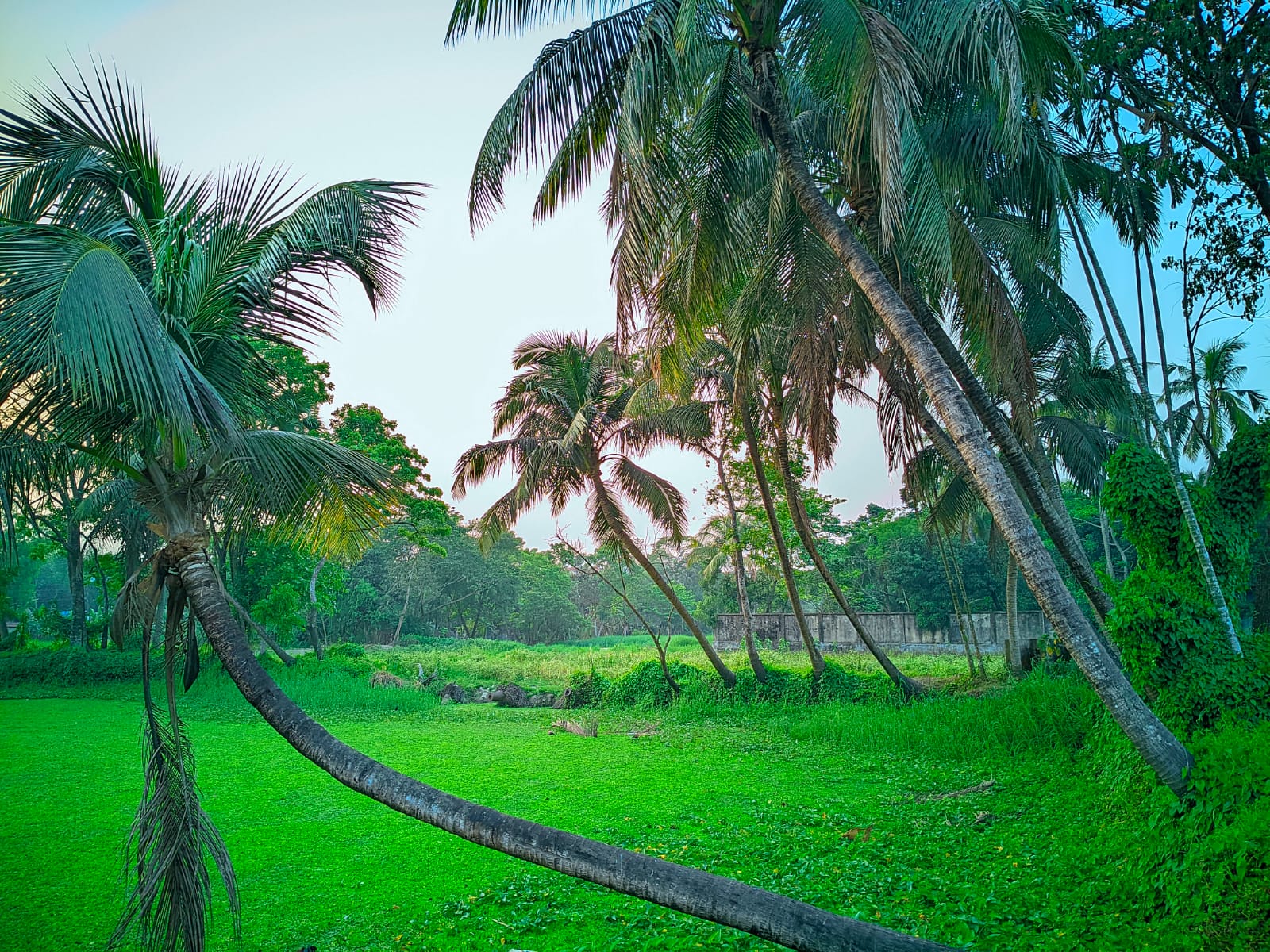 Me encantó esta escena y tomé estas fotografías al atardecer, lo que la hace aún más interesante. Es realmente asombroso contemplar la puesta de sol en medio de la exuberante naturaleza. Al pasar junto a un estanque, vi muchas palmeras en la orilla. Tomé una foto allí. Una de ellas se inclina hacia el estanque y parece que va a caer. Cuéntenme en los comentarios qué les pareció mi fotografía de los paisajes naturales del pueblo y de este diverso país.