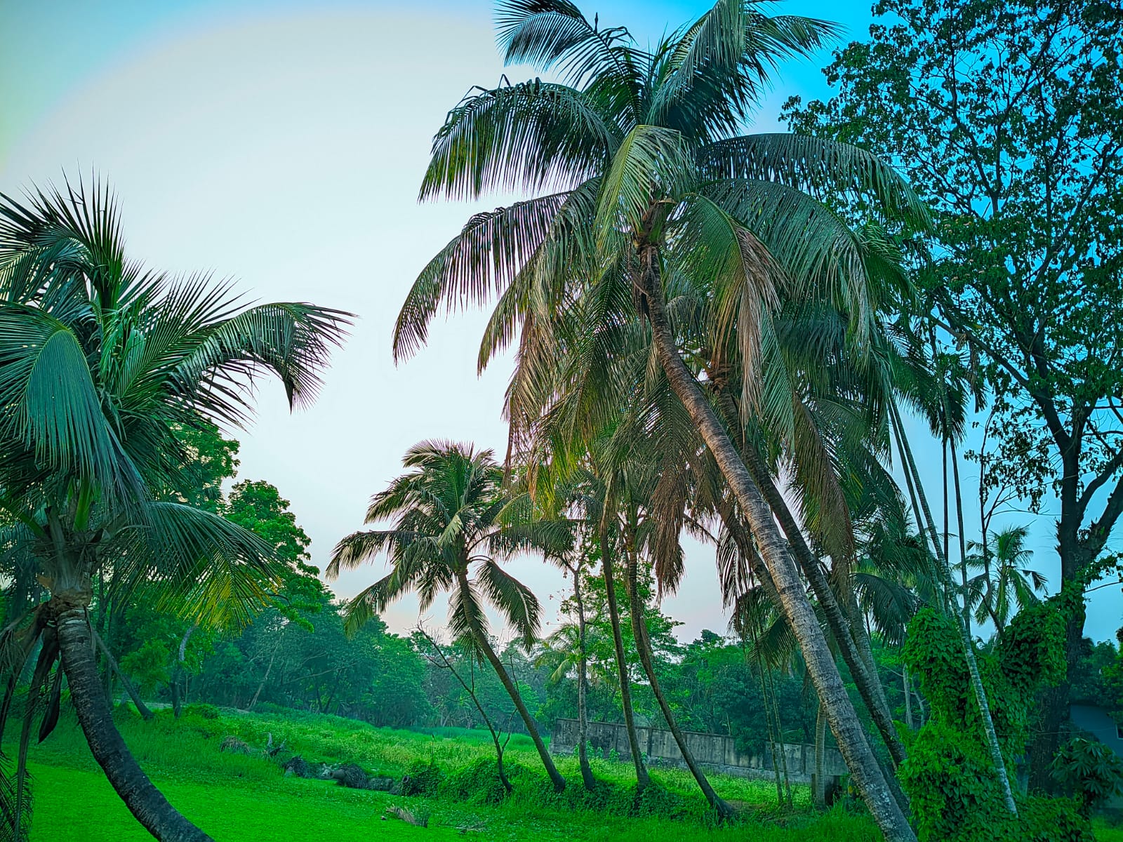 Queridos amigos, hoy les traigo algunas fotografías de la naturaleza del pueblo, y me gustan mucho. Si ven estas fotos, se darán cuenta de que hay una naturaleza verde y exuberante, árboles y un cielo azul precioso. Hay mucha vegetación, grande y pequeña, y santuarios. Me gusta especialmente ver el cocotero. He estado en un lugar donde hay muchos cocoteros hermosos y un estanque.