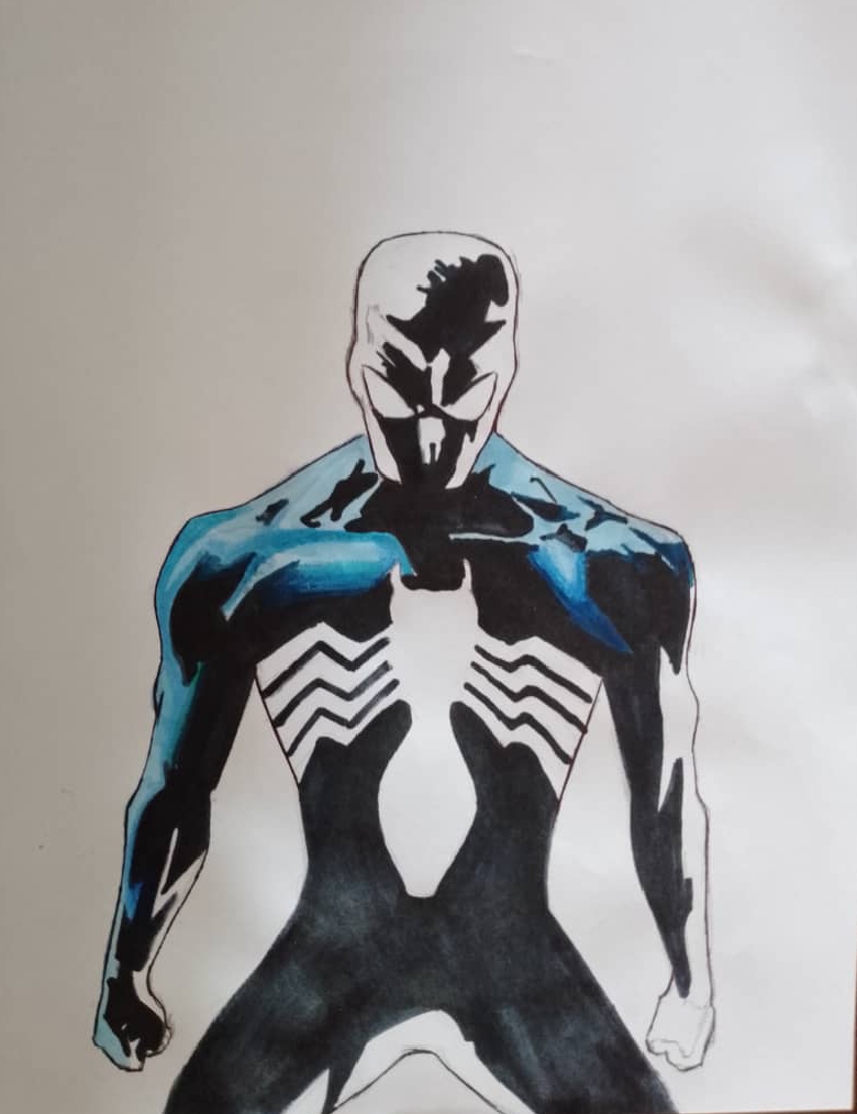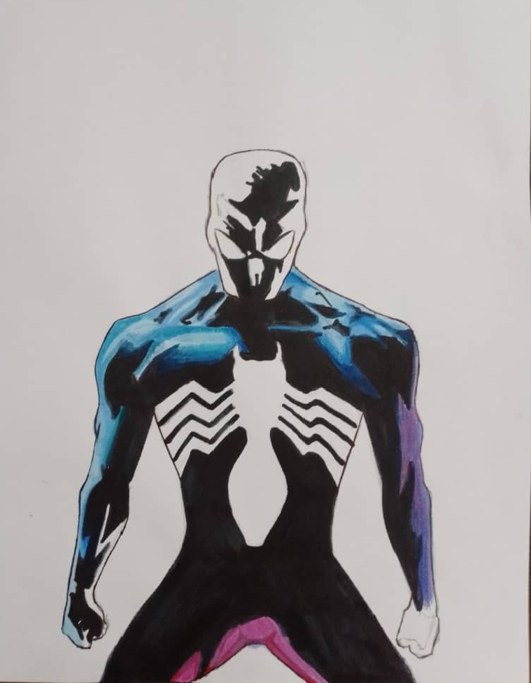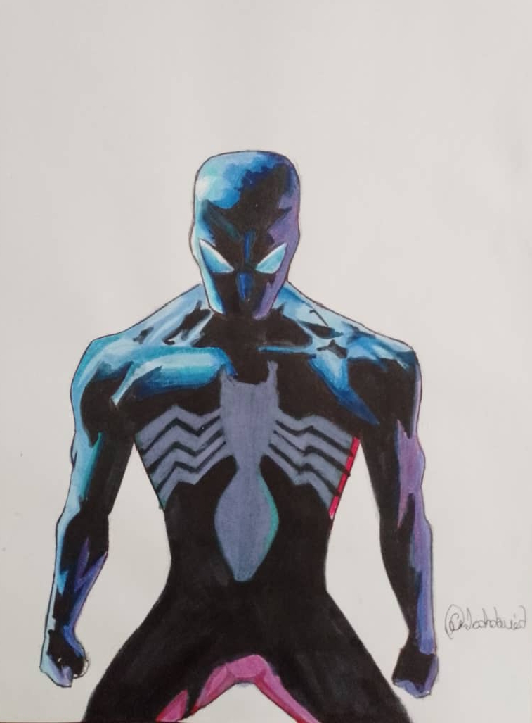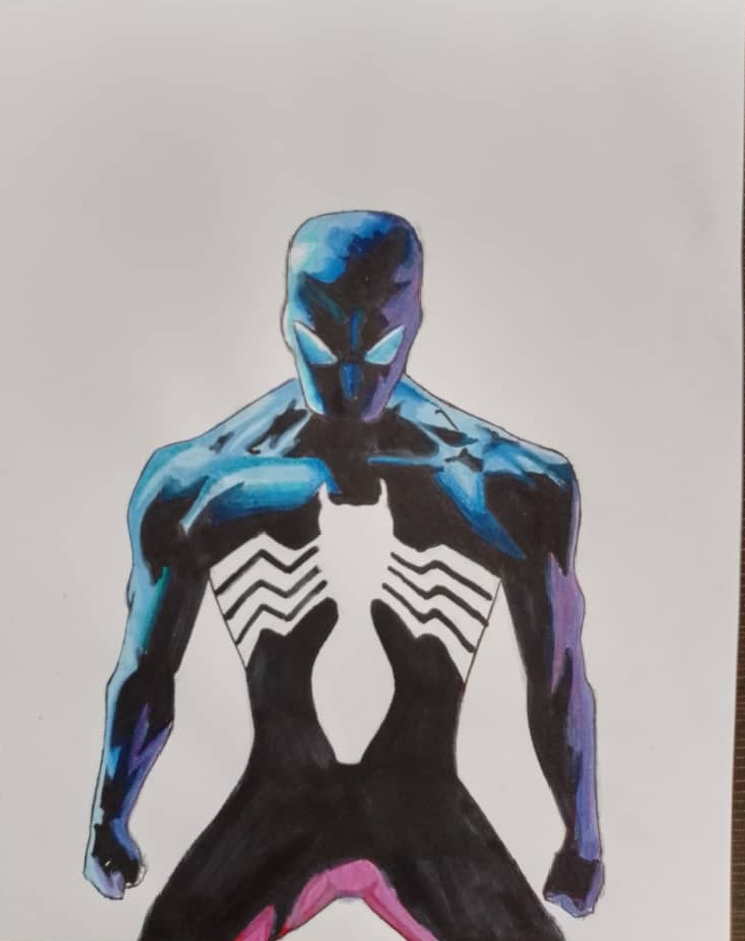 Las otras zonas las coloree con tonos azules y violetas degradando y difuminando para lograr zonas de luz y así dar volumen, brillo y dar una apariencia de una superficie de latex o cuero que simula el traje del Simbionte.