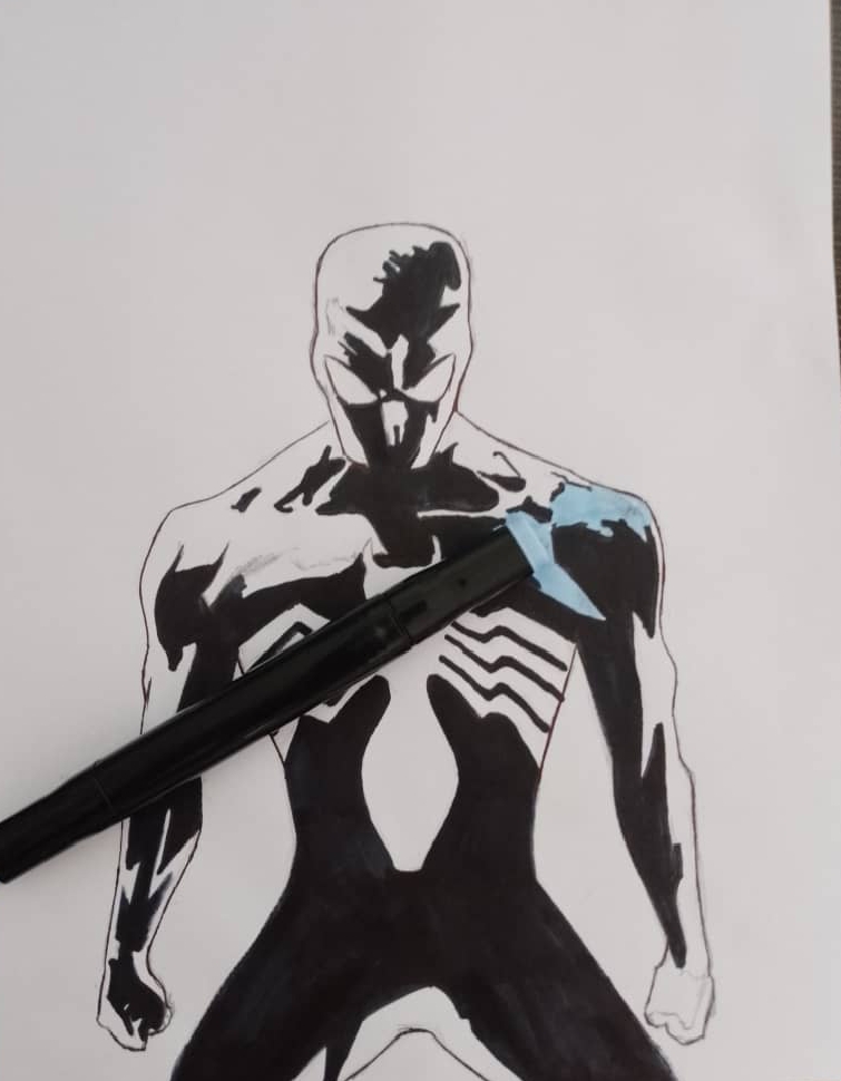 Hacer el coloreado parece bastante sencillo ya que es un traje negro, pero no lo es tanto ya que para poder mostrar la musculatura se necesita usar otros colores que hagan contraste para que no quede como una sombra o se vea como un dibujo plano.