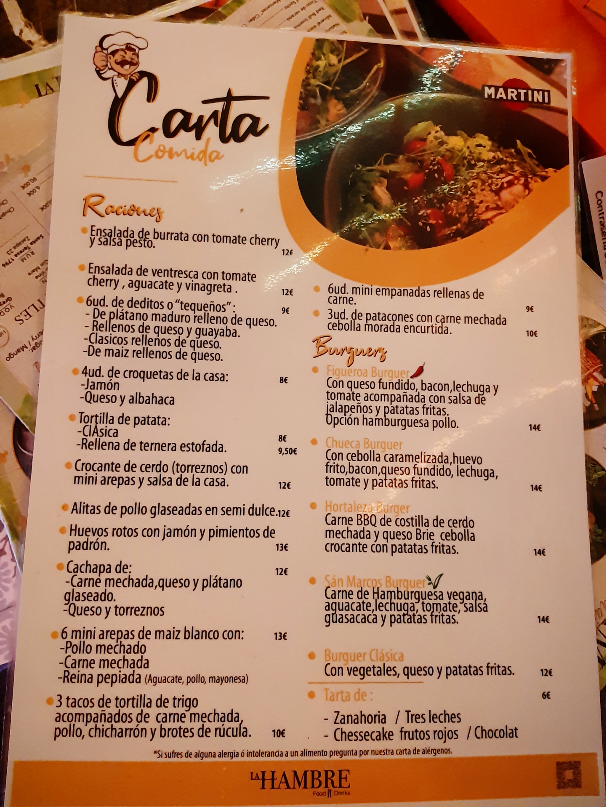 La carta menú de La Hambre muestra una fusión caribeña y española con un toque Colombiano/Venezolano, con platos como cachapas, tequeños, arepas y postres como tres leches.