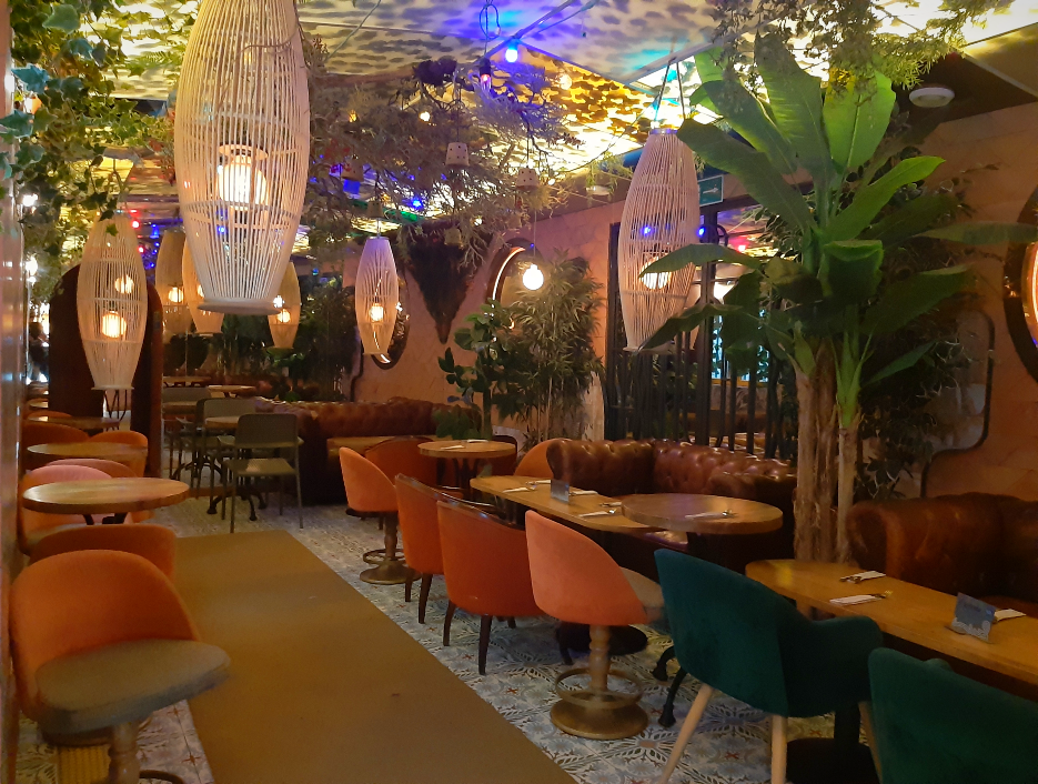 Al entrar, te encuentras con una atmósfera única que mezcla estilos tropicales y de jardín secreto.