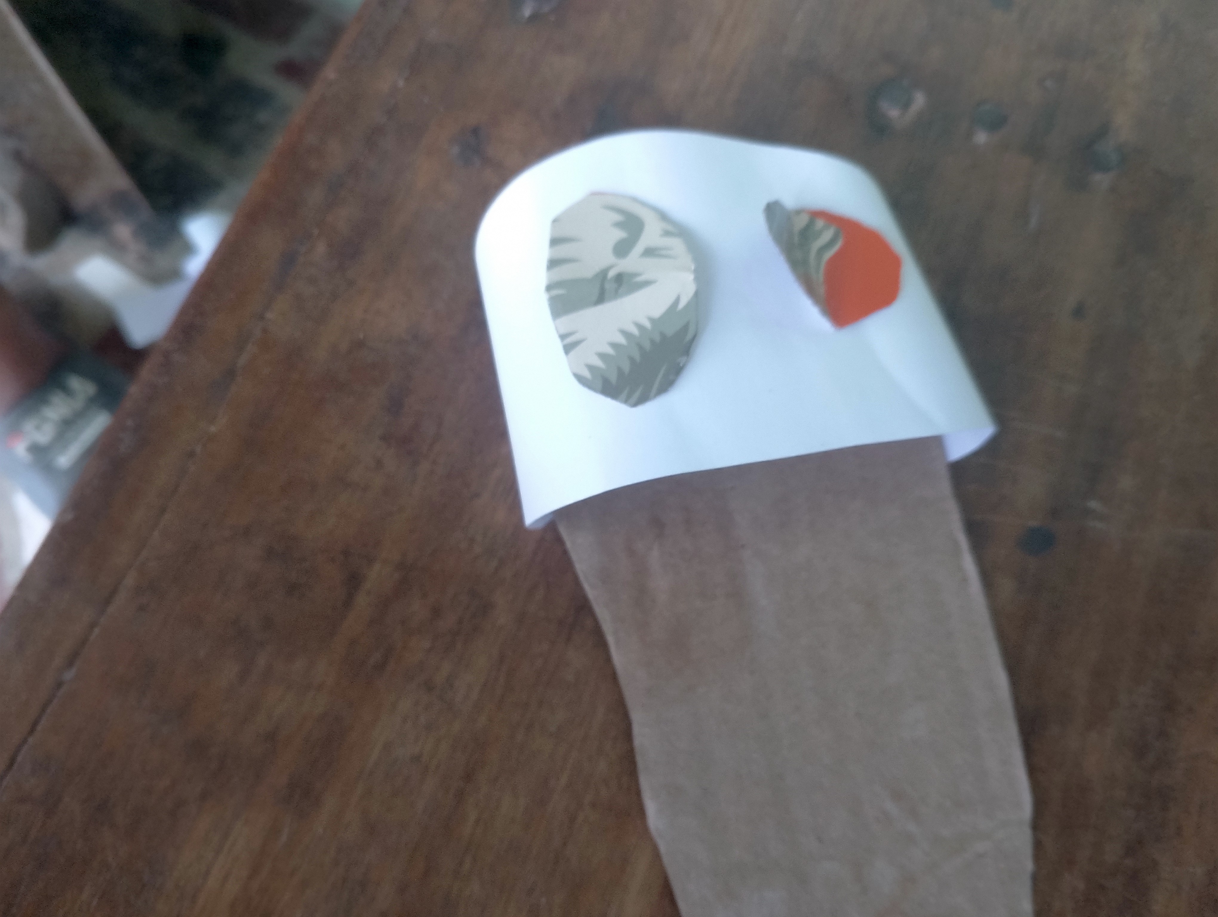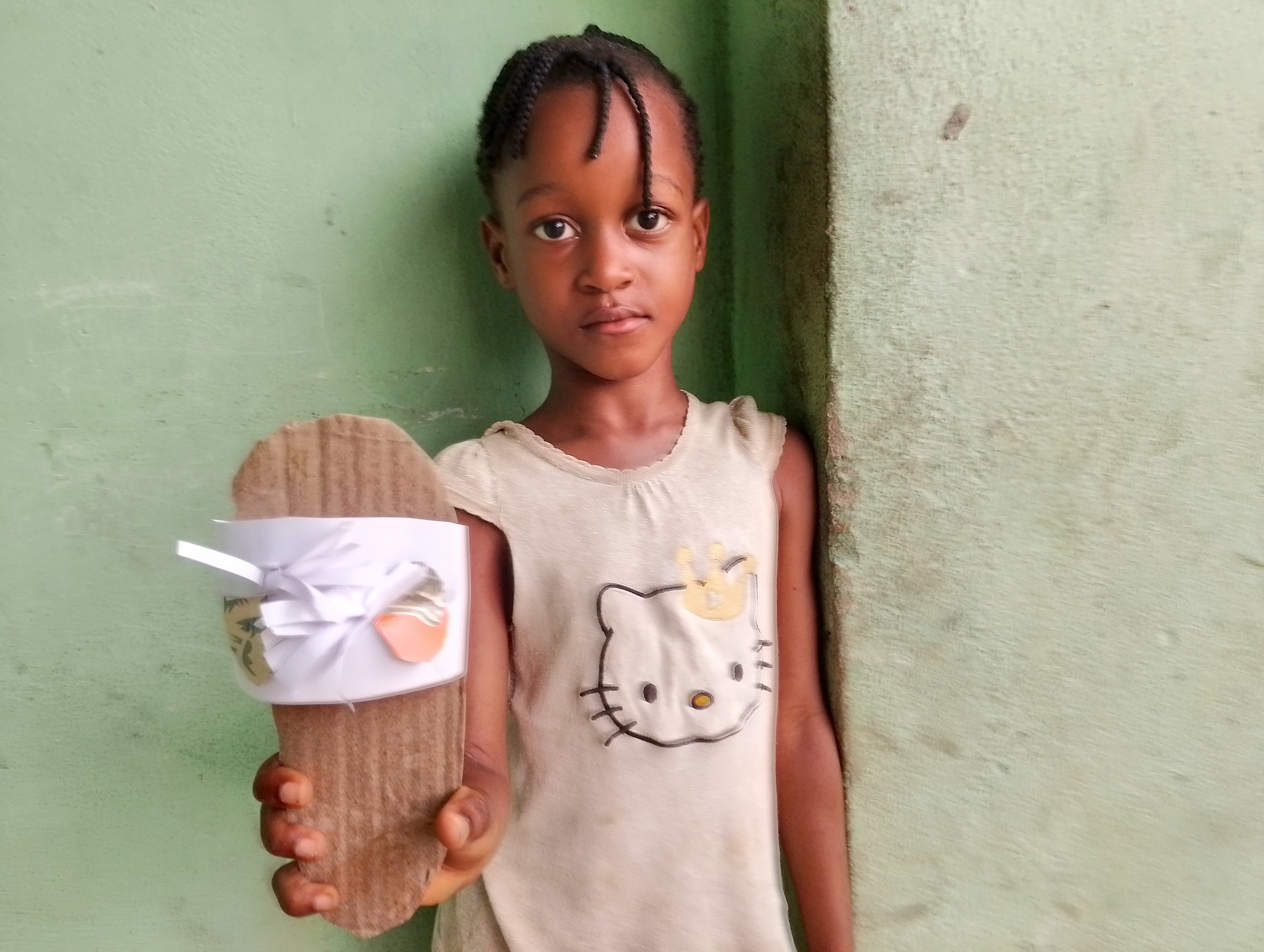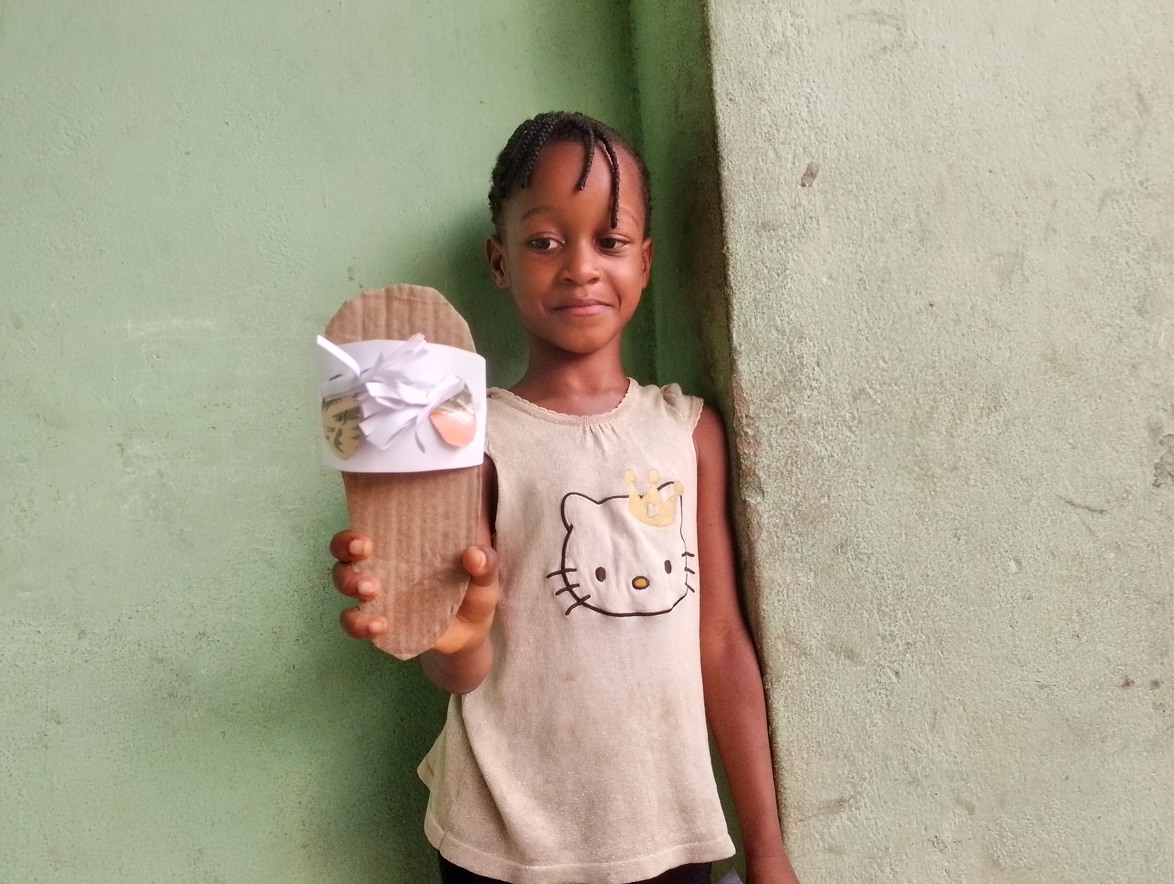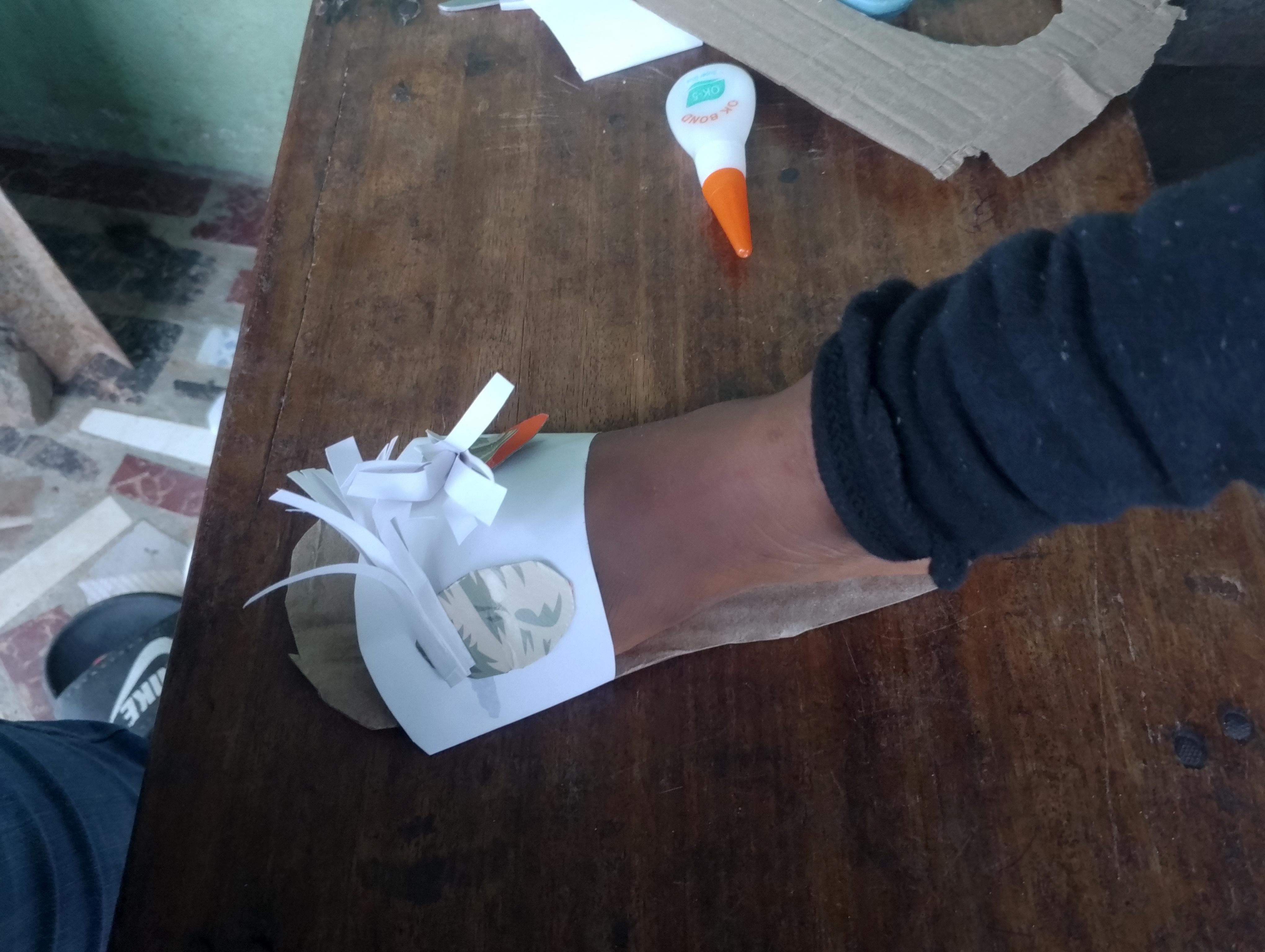 I helped measure her feet before cutting the carton , she cut the white paper after then she opened the gum and place the white paper over the carton, I helped her to cut the fancy into tiny size while she folded the fancy and placed it on the slippers. It was a simple process of which other children can do .