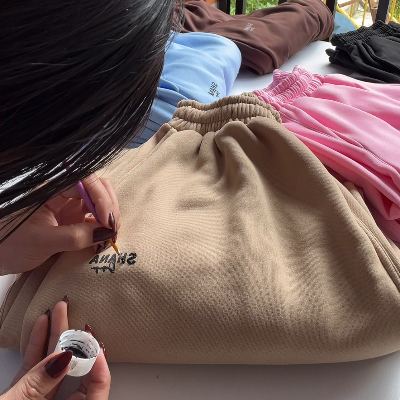 Aunque eran bastantes, entre los baggys y los conjuntos, sentí que los pinté rapído, bueno los hice casi todos en un día y dejé unos pocos para el siguente día, los que llevaban el logo en color blanco son los que me dieron más trabajo porque llevan más capas de pintura, pero realmente estuve trabajando tranquila en mi mesa improvisada, y parada así que no me dolió demasiado la espalda. Siento que cuando uno trabaja parada como que rinde más que sentada jaja. En este caso fue así.