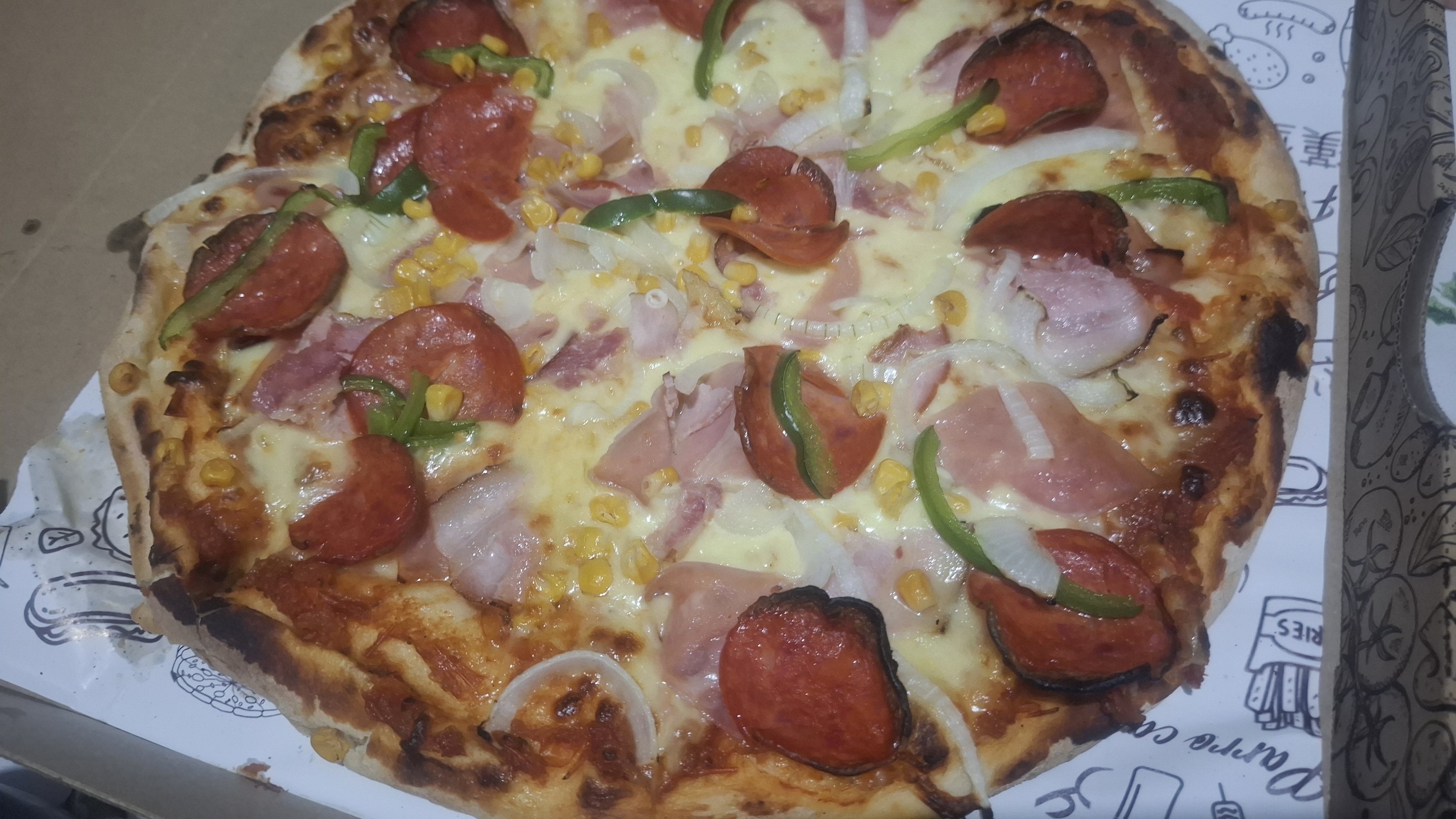 Ya en la noche no me correspondia cocinar porque era noche de cocina de rei pero el pícaro solo pidió una pizza a delivery, no puedo negar que estaba deliciosa jajaja y la disfrutamos, además tenía tiempo sin comer pizza.