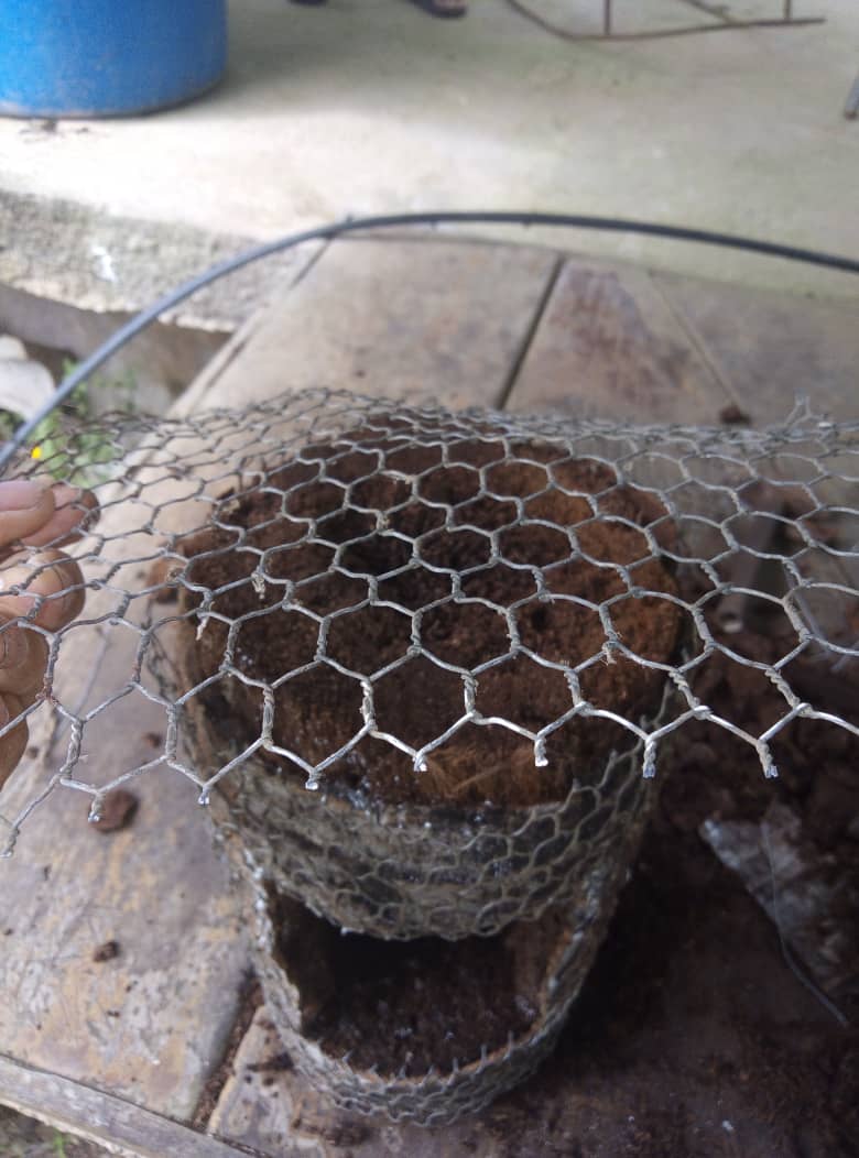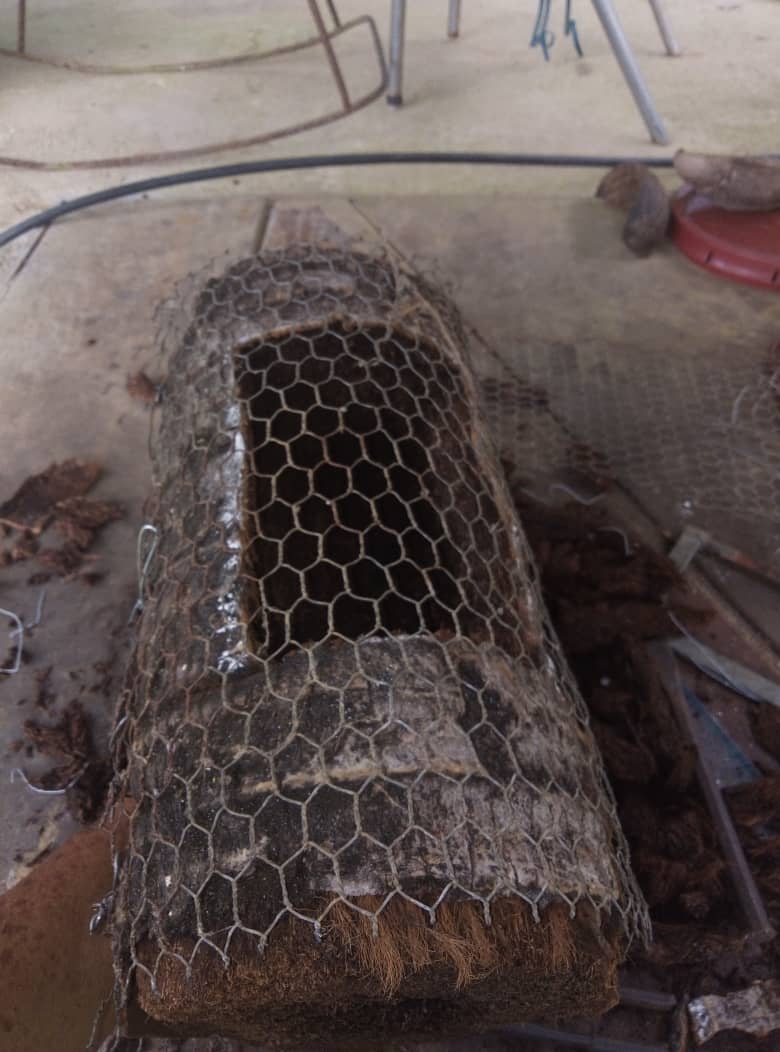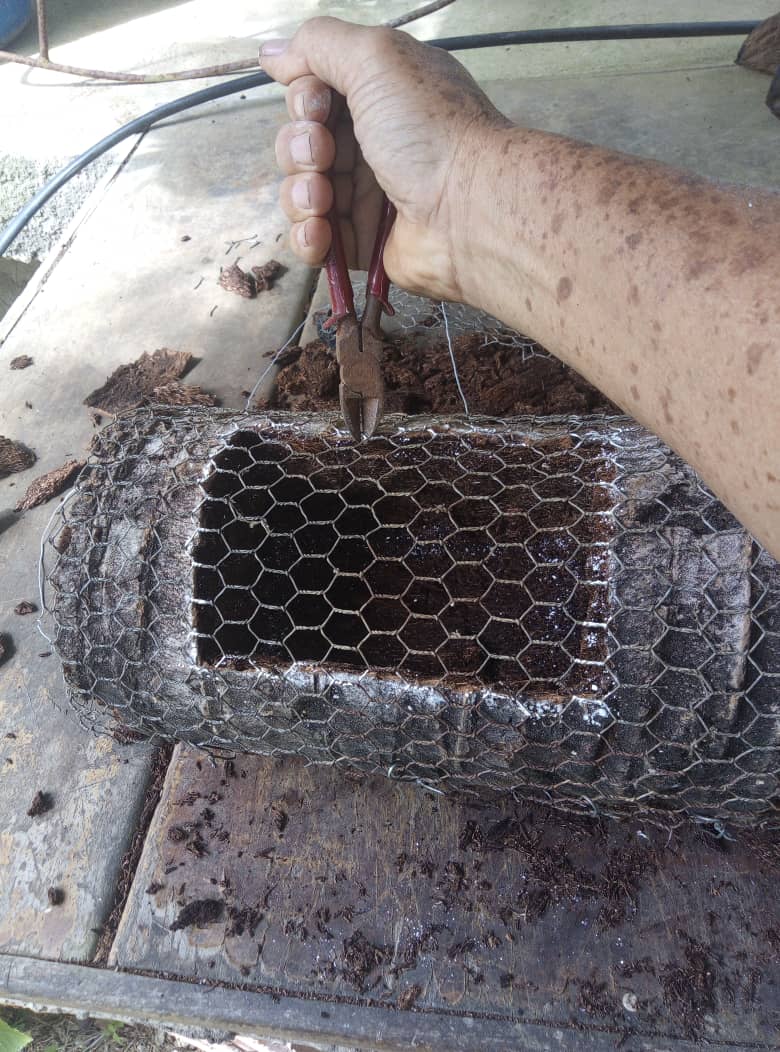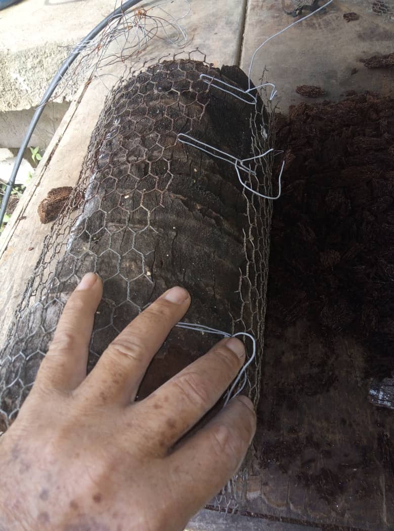 Una vez excavado el hueco donde voy a plantar la mata, cubrí todo el tronco con una malla fina de metal, e incluso el hueco excavado con el fin de fortalecer toda la estructura del macetero.