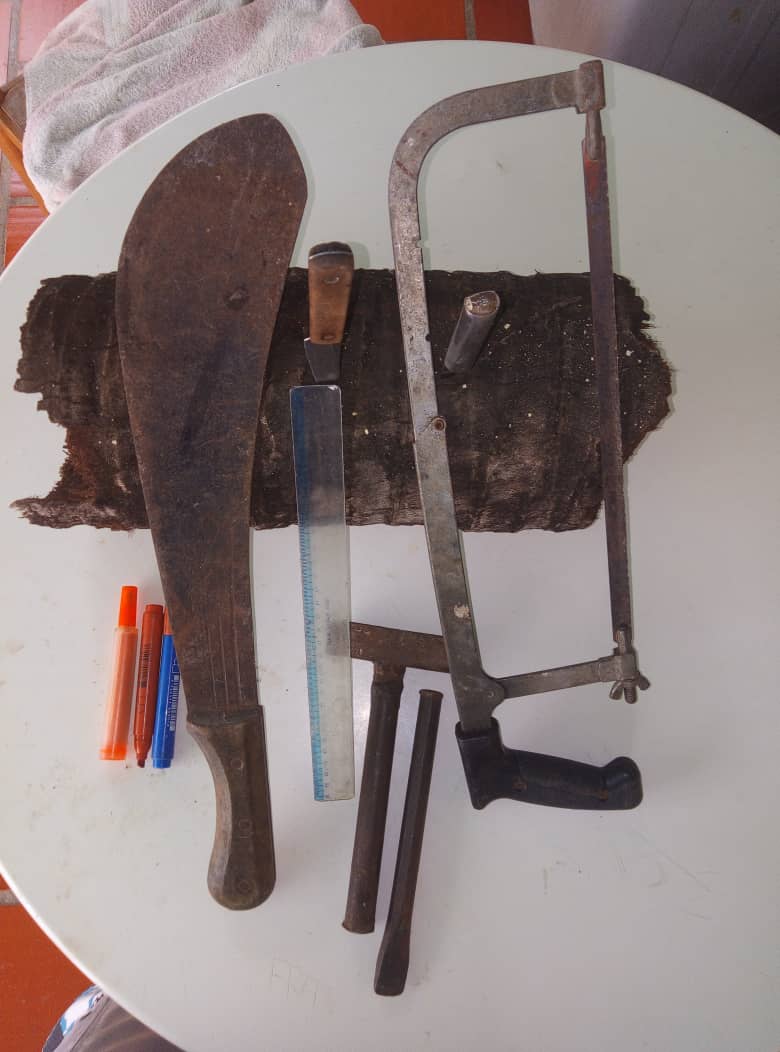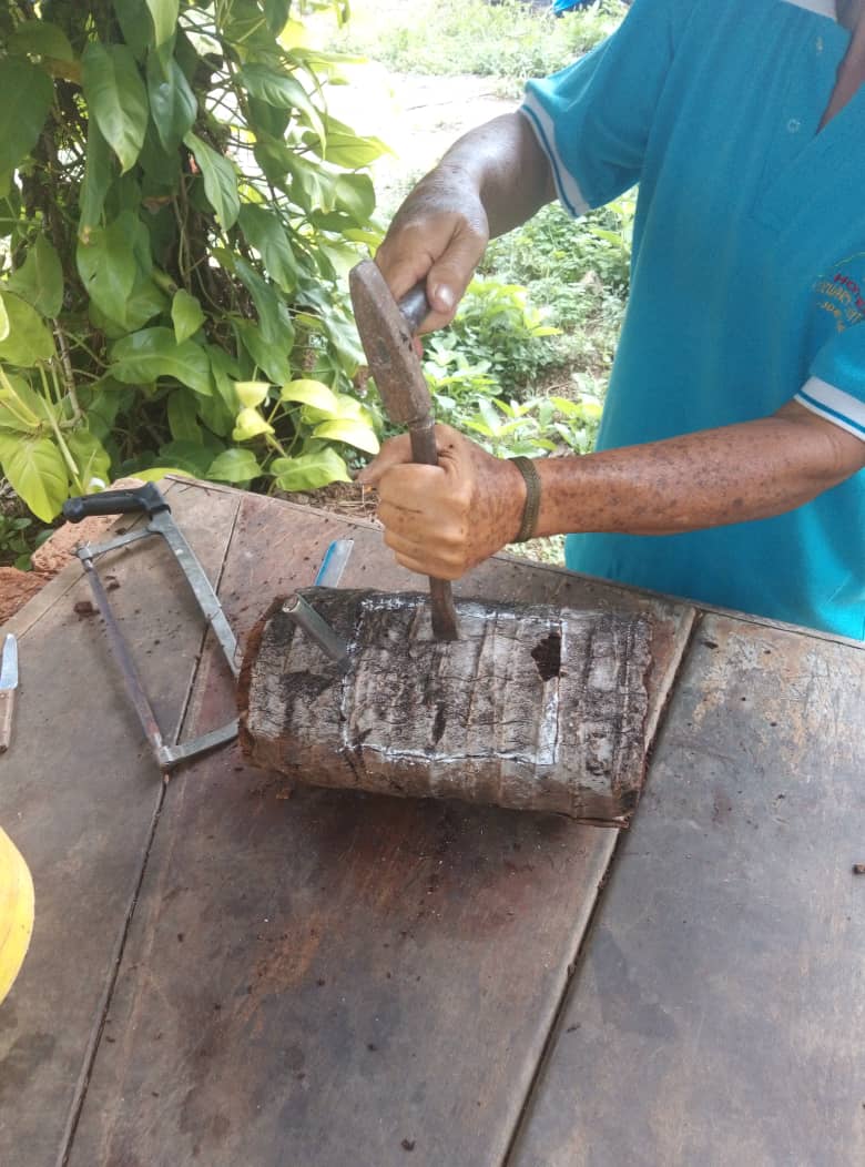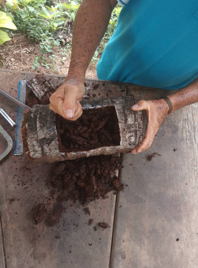Lo primero que hice fue cortar con la ayuda de un machete y un serrucho de un tronco largo 35 cm, luego a este pedazo le corte los extremos para ponerlo parejo.
