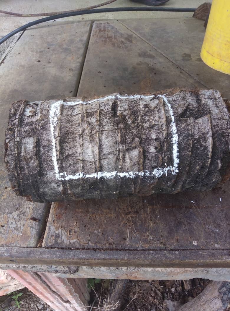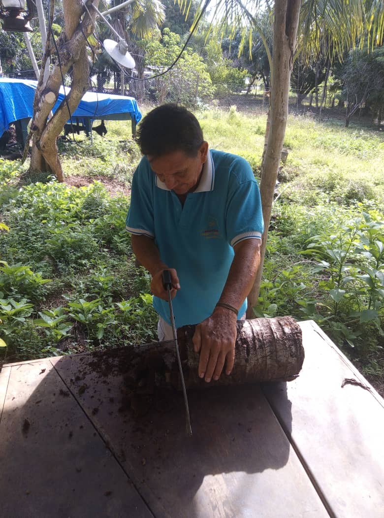 Seguidamente en el centro del tronco medí y marque un cuadro de 20 cm de largo y 12 de ancho para hacerle el hueco donde va a ir plantada la mata, mientras hacía esto mi esposa está replanteando otras matas, que están muy juntas.