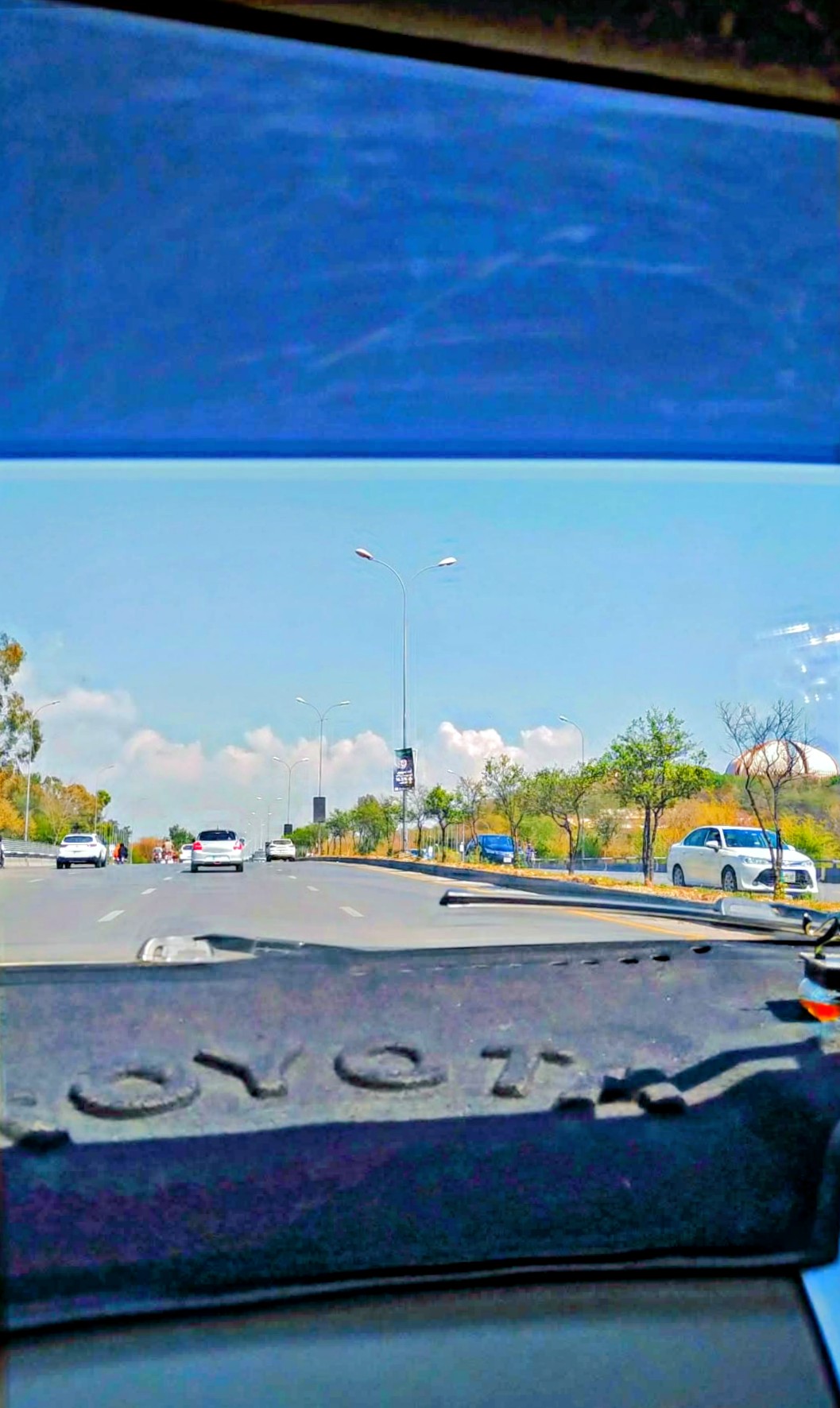 Después de arreglarme, pedí un taxi y salí hacia su casa. Su casa estaba a unos 45 minutos. Como se puede ver en esta foto, el calor debía ser intenso, porque el sol pegaba tan fuerte que lo sentía incluso dentro del coche.