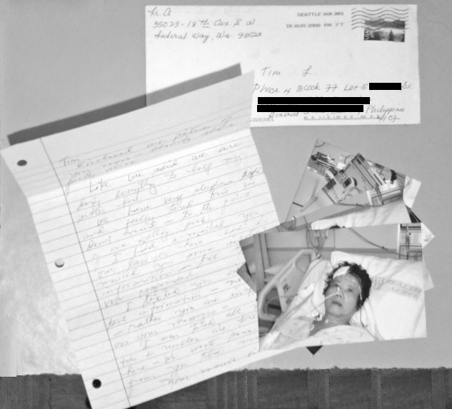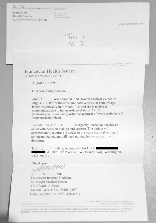 In August 17, 2009, around 2:30-2:40 PM, my wife received a FedEx envelope containing a letter from St. Joseph Medical Center. It narrated the case of my mother, her condition, and an instruction for me to process my emergency travel to the United States.
