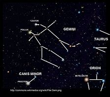 Was original described by Ptolemy and is Latin for "twins". It is in the 7th right ascension at a +20 degree declination in the NQ2 quadrant. The two most notable stars in this constellation are Pollux and Castor A, named after the Roman mythology of the same name. Pollux is an evolved star 34 light years away from the sun while as Castor A is comprised of 3 binary pairs of 6 stars and appear paler than Pollux. The Gemini constellation appears overhead in the months of January and February and the sun can be seen in it from the end of June to the end of July.