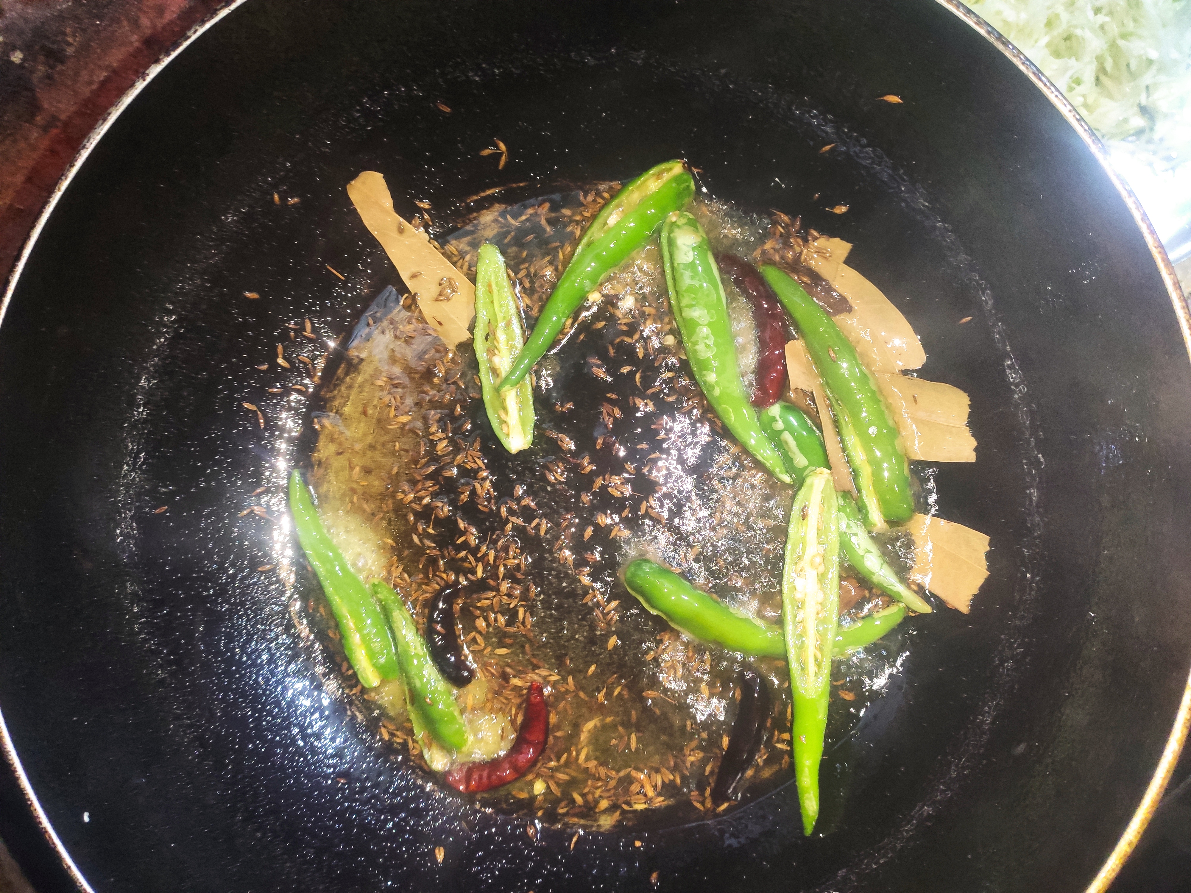 ১: শুরুতে কড়াই তে তেল গরম করে জিরা,শুকনা মরিচ,কাঁচামরিচ, তেজপাতা ও কালো এলাচ দিব।