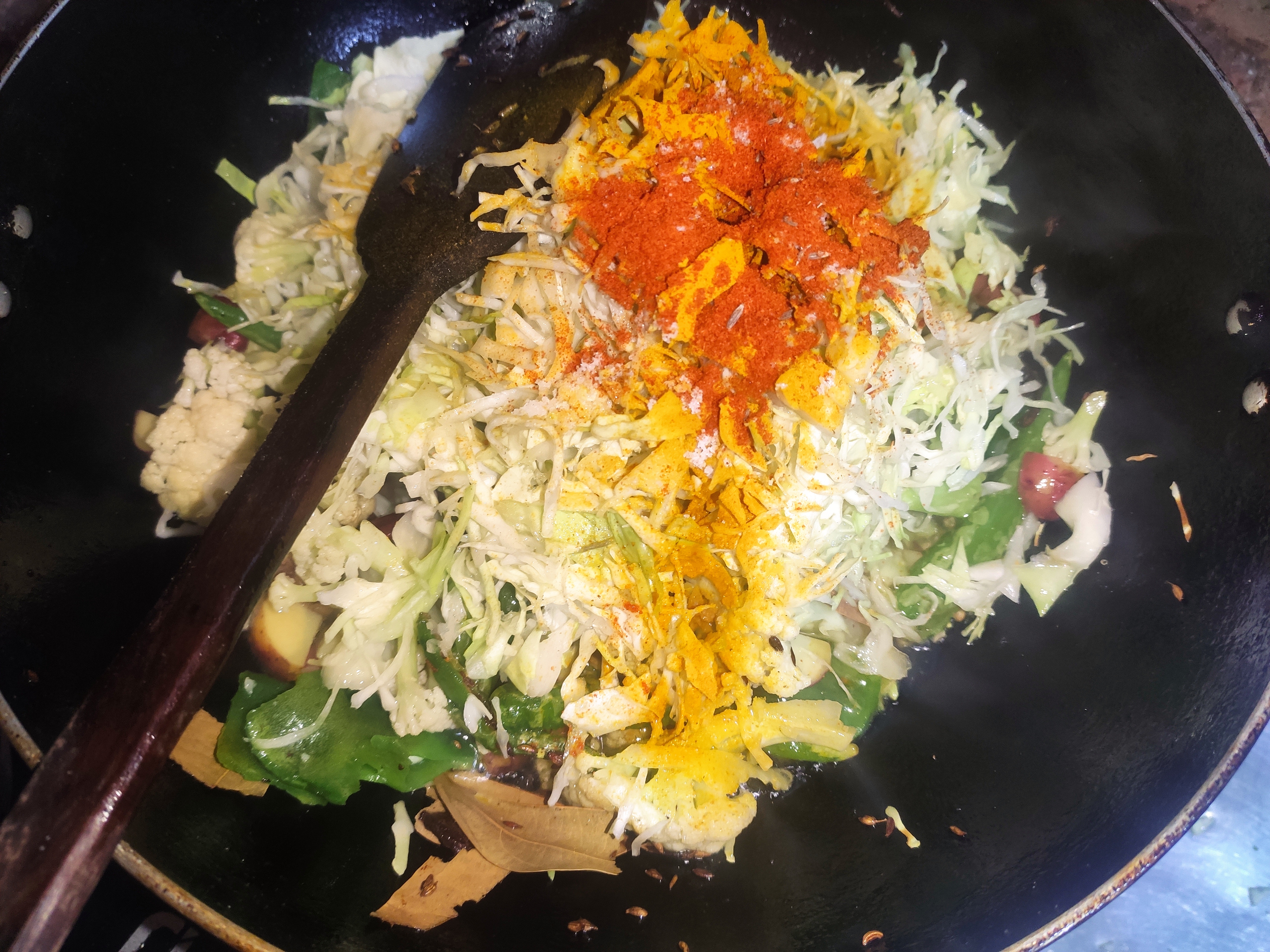 ৩: এখন বাঁধা কপি, হলুদ গুঁড়া লবন ও ঝালের গুঁড়ো দিয়ে দিতে হবে ও ভালো করে ভাজতে হবে।