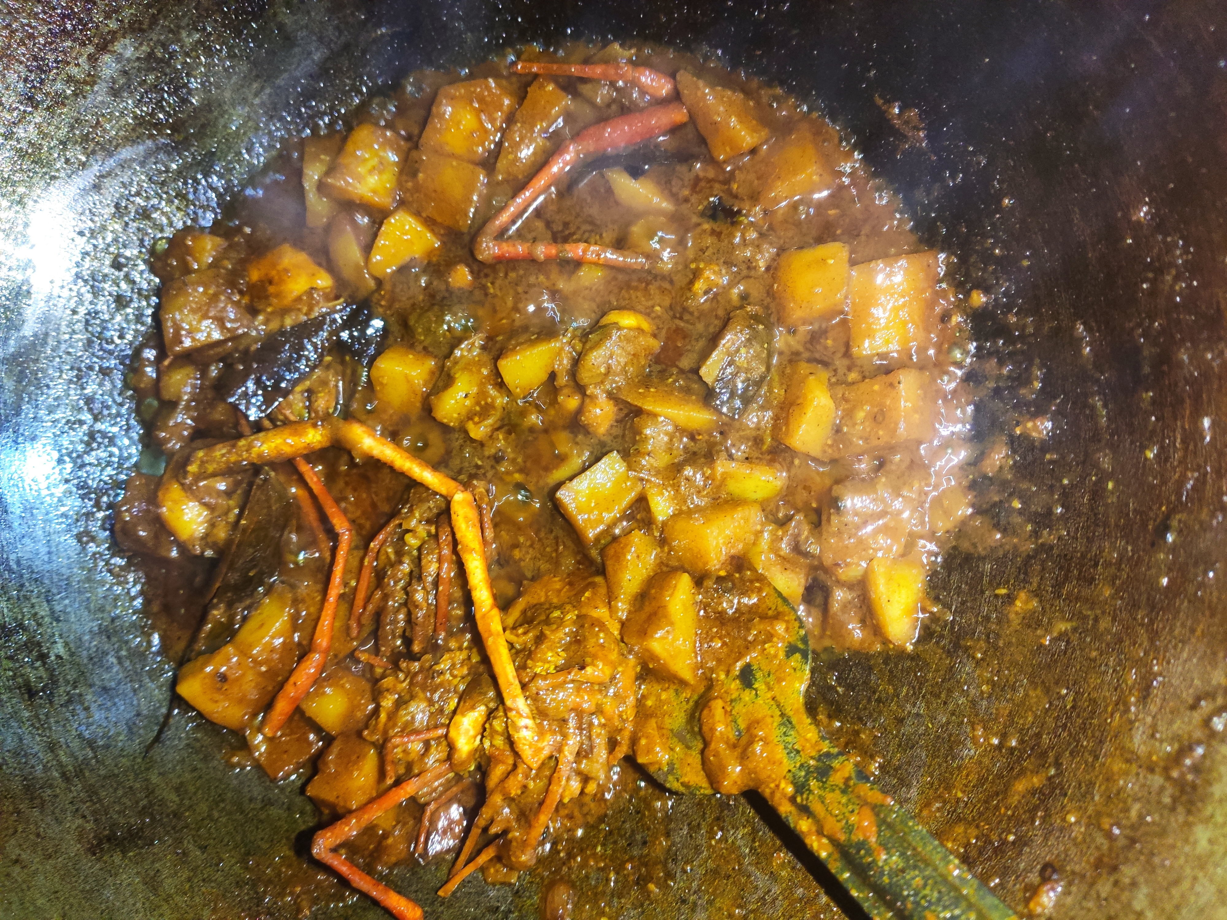 ৫: এবারে জিরা বাঁটা ও ঝালের গুঁড়ো দিয়ে সাথে সামান্য পানি যোগ করে কাষাতে হবে।
