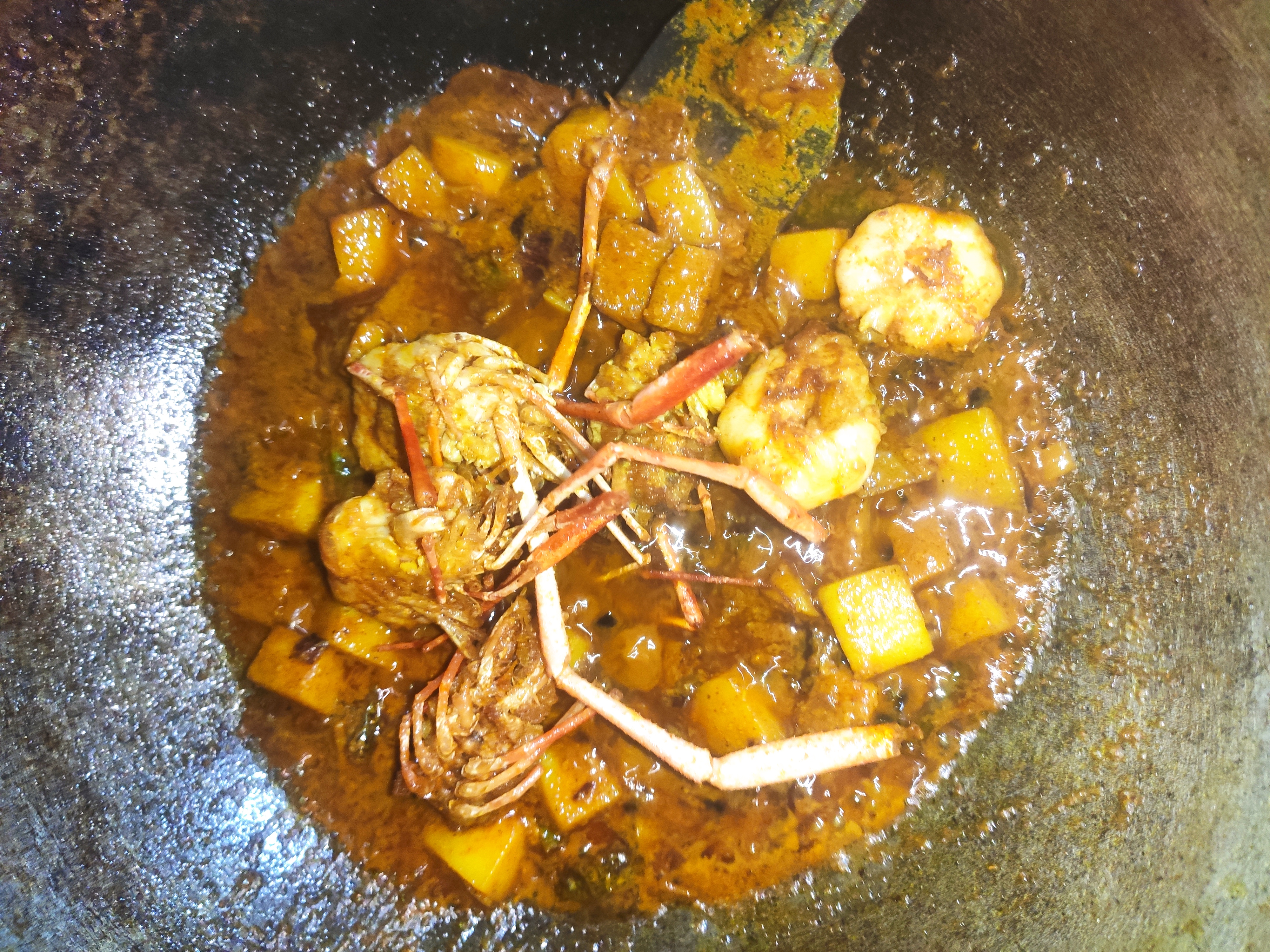 ৬: কষানো হয়ে গেলে এবার ভেজে রাখা চিংড়ি মাছ গুলো দিয়ে আবার ও কষাতে হবে।