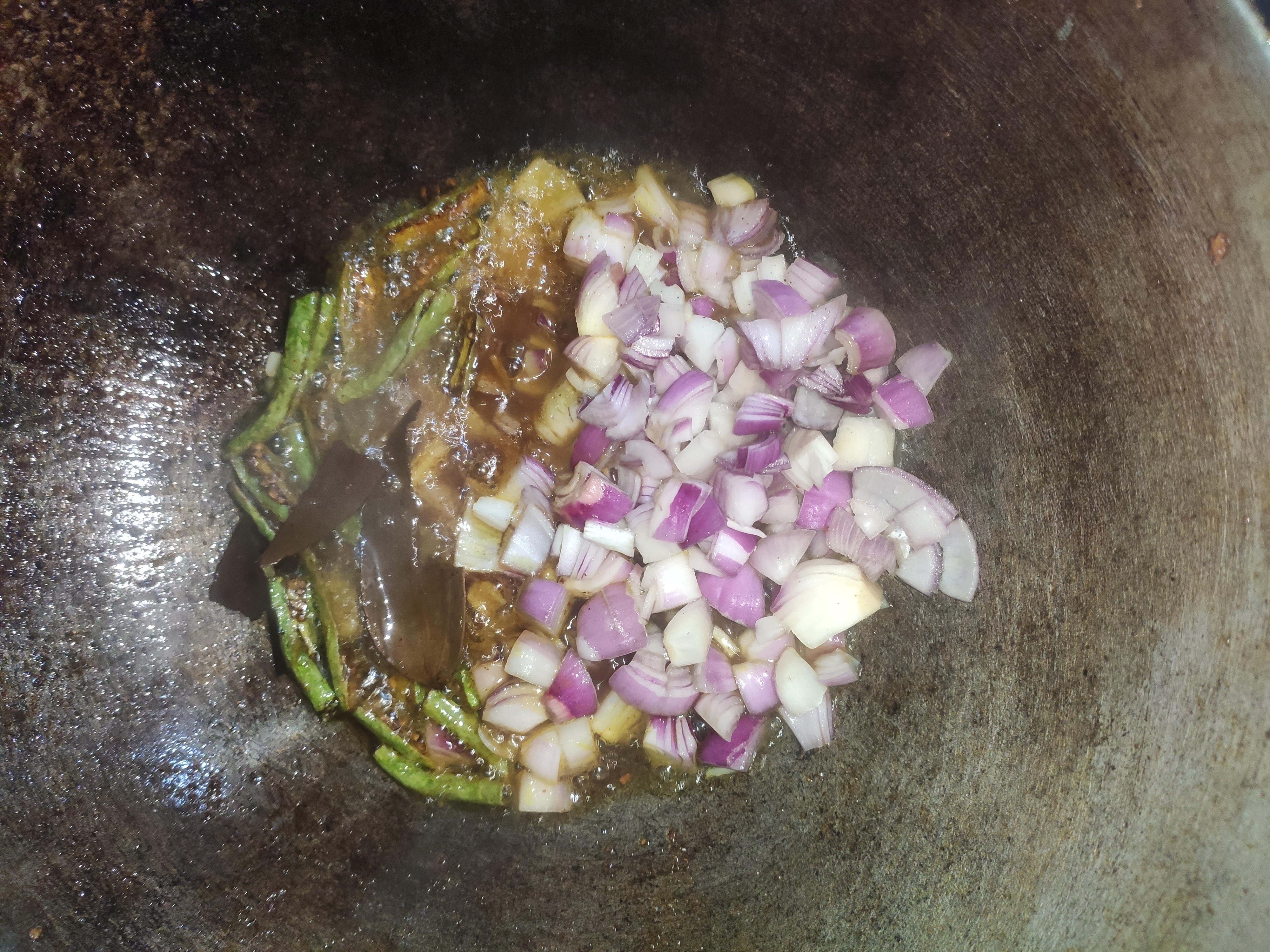 ৩: এবার ঐ তেলে তেজপাতা, কাঁচা মরিচ ও পেঁয়াজ কুচি দিতে হবে ও ভালো করে ভাজতে হবে।