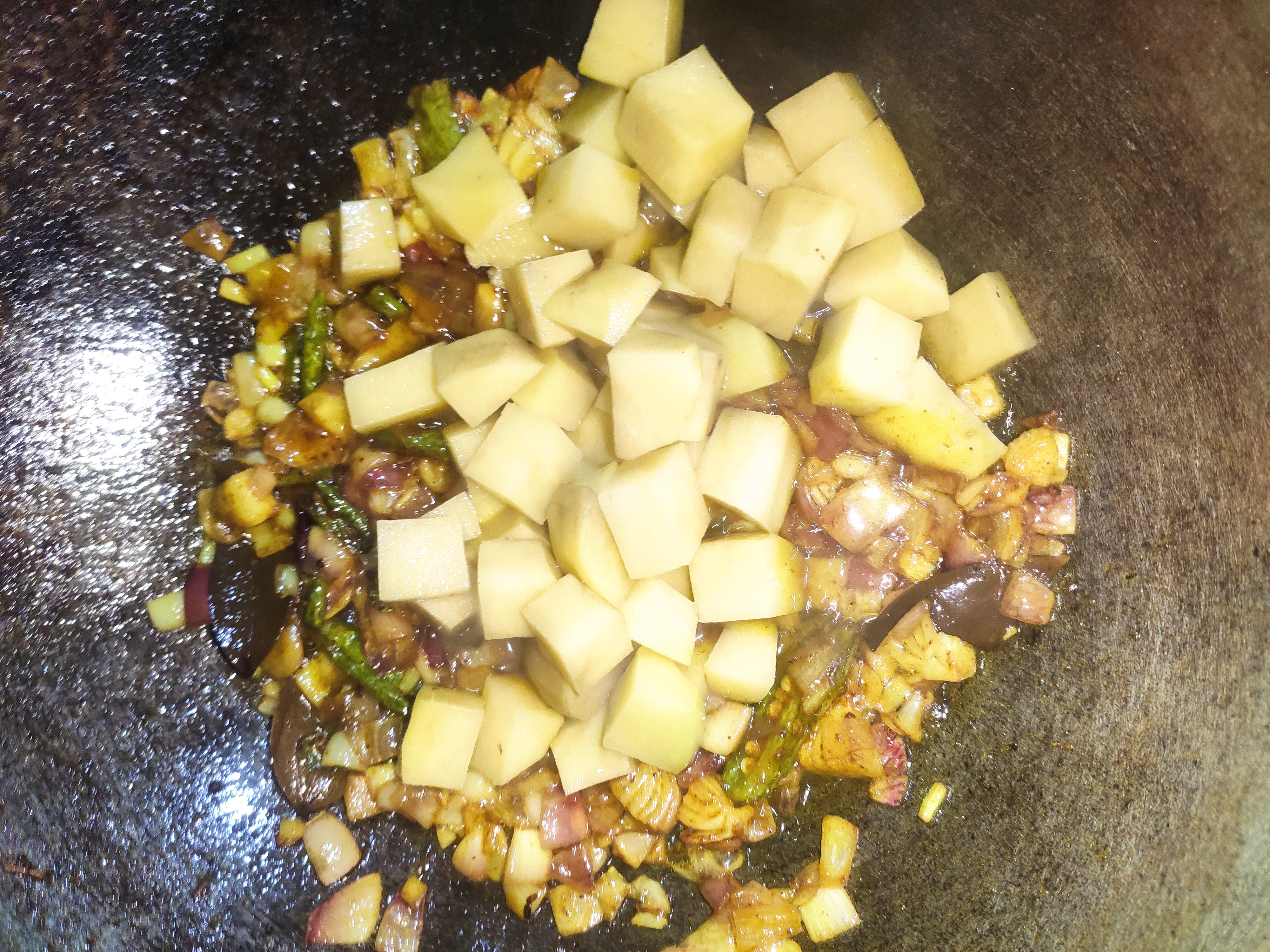 ৪: এখন পরিমাণ মতো হলুদ গুঁড়া ও লবন দিয়ে দিতে হবে ও কেটে রাখা আলু গুলো দিয়ে ভেজে নিতে হবে।