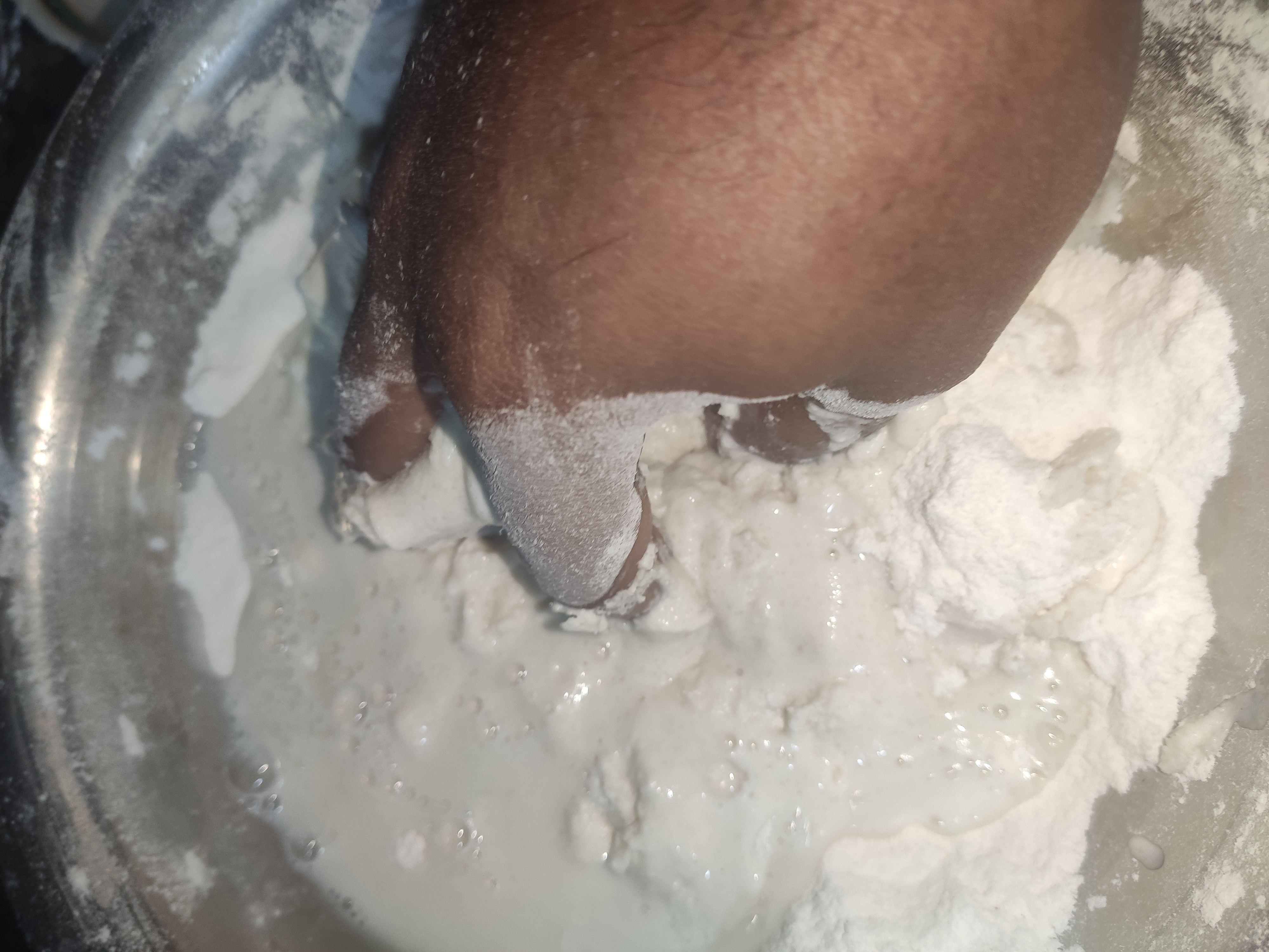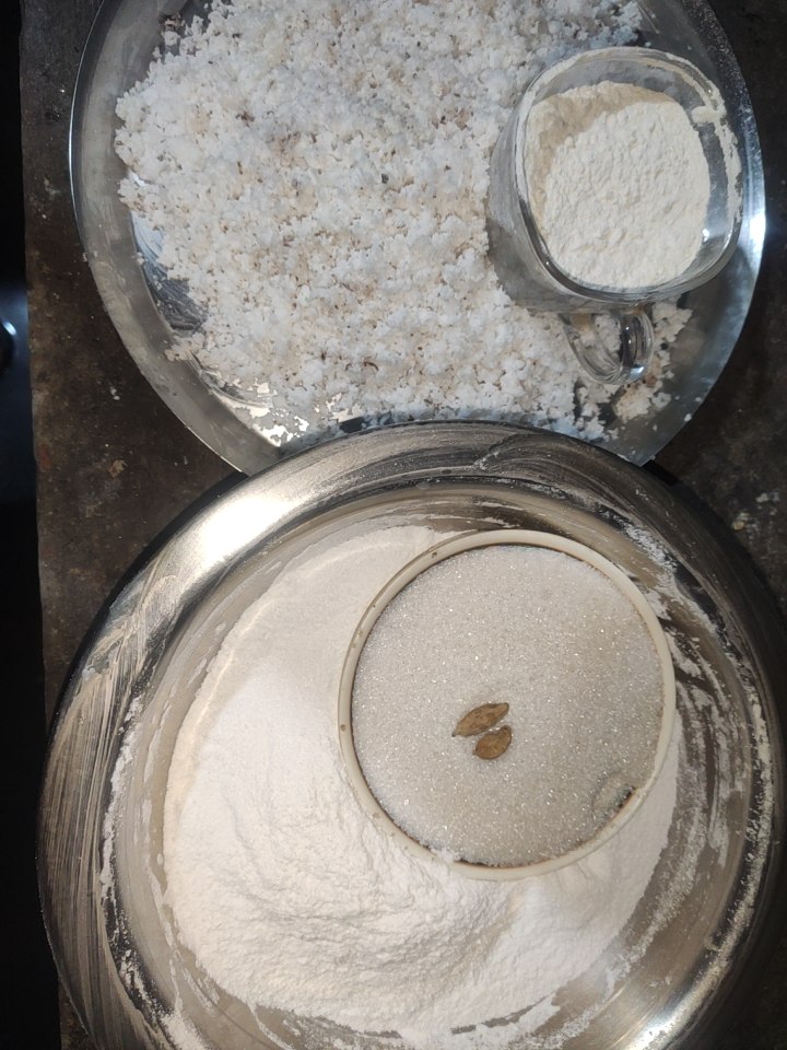 ৫: এখন চালের গুঁড়ো ও ময়দা এবং চিনি মিশিয়ে পানি যোগকরে পাতলা করে নিতে হবে।
