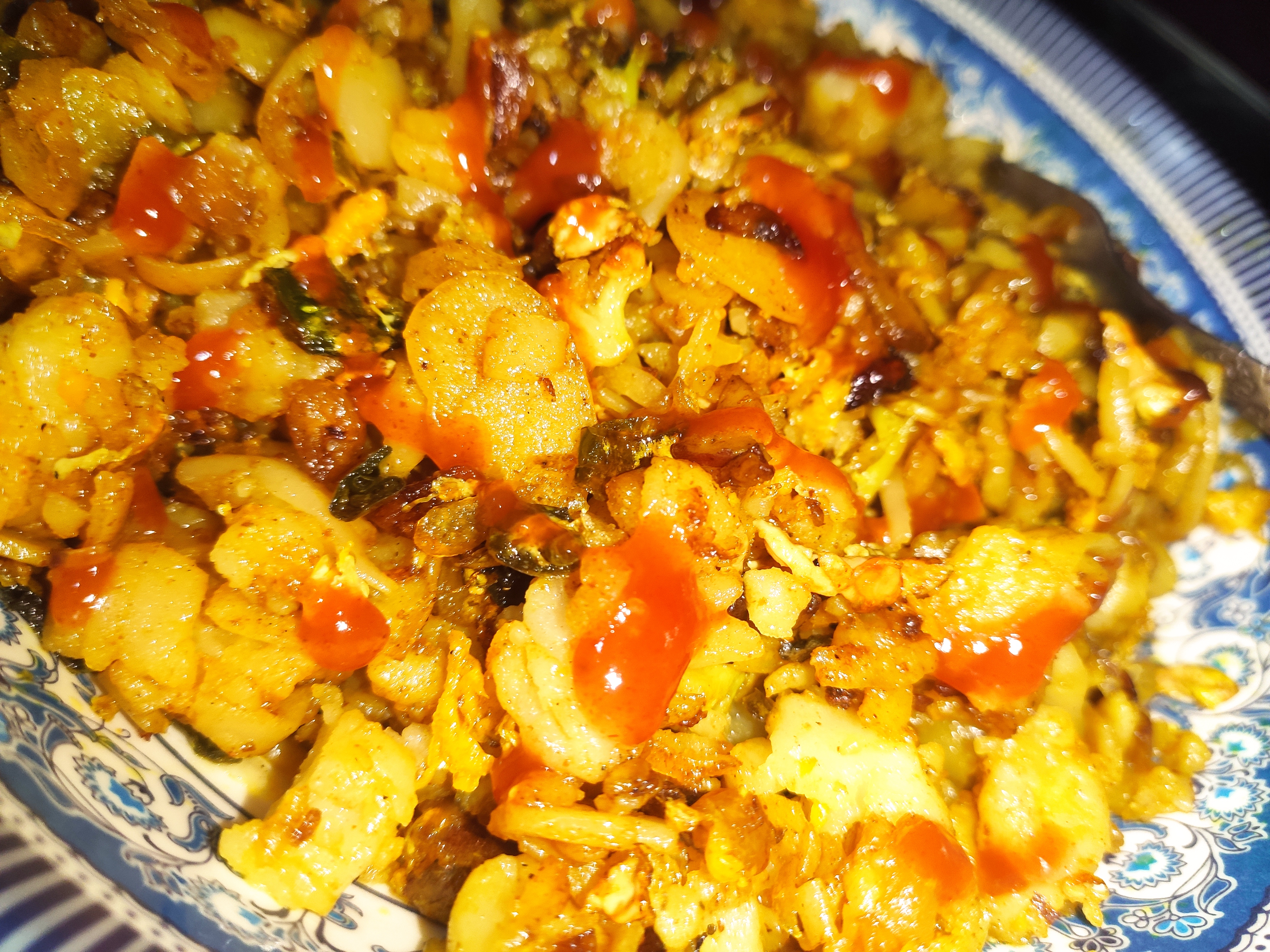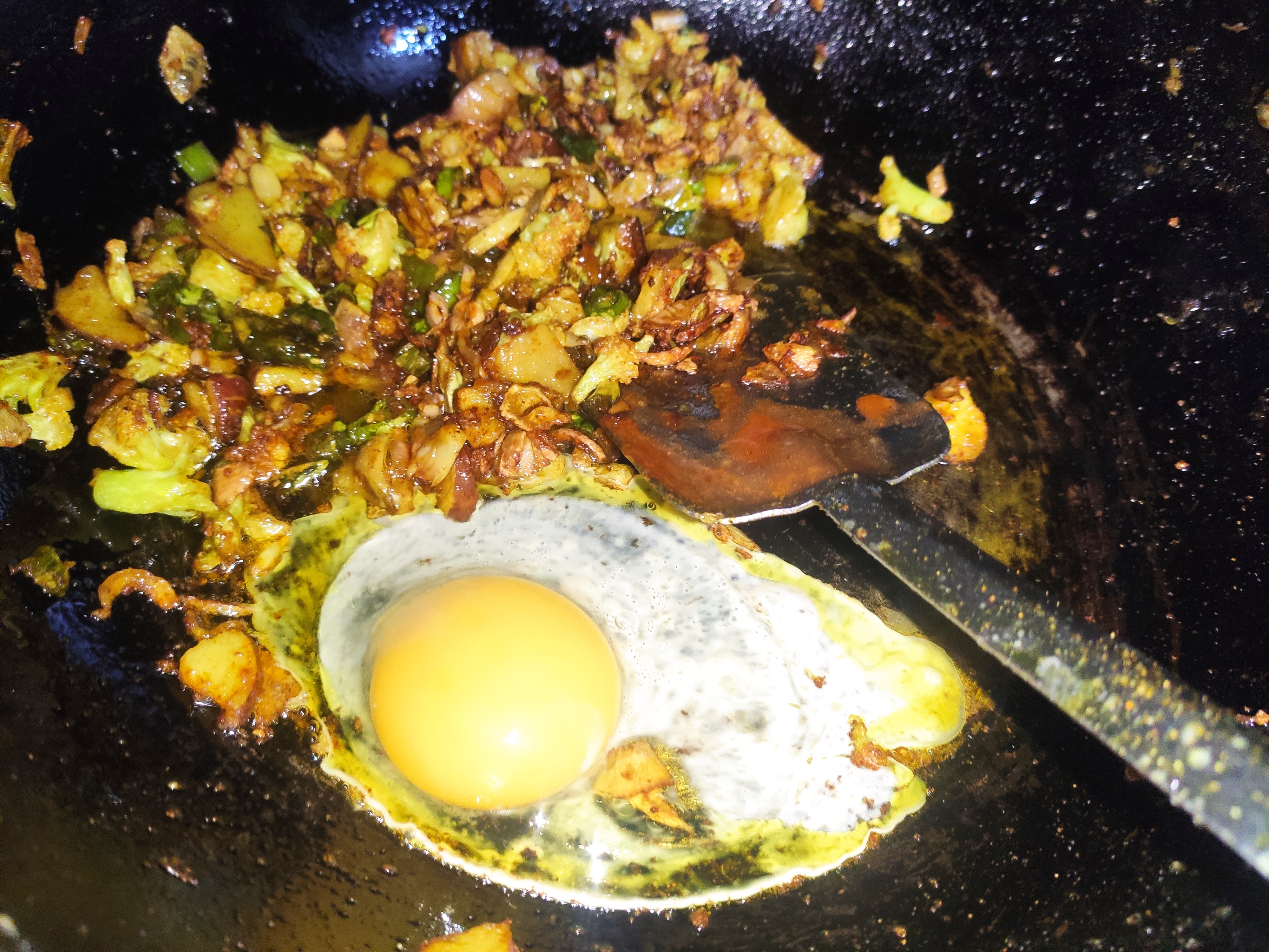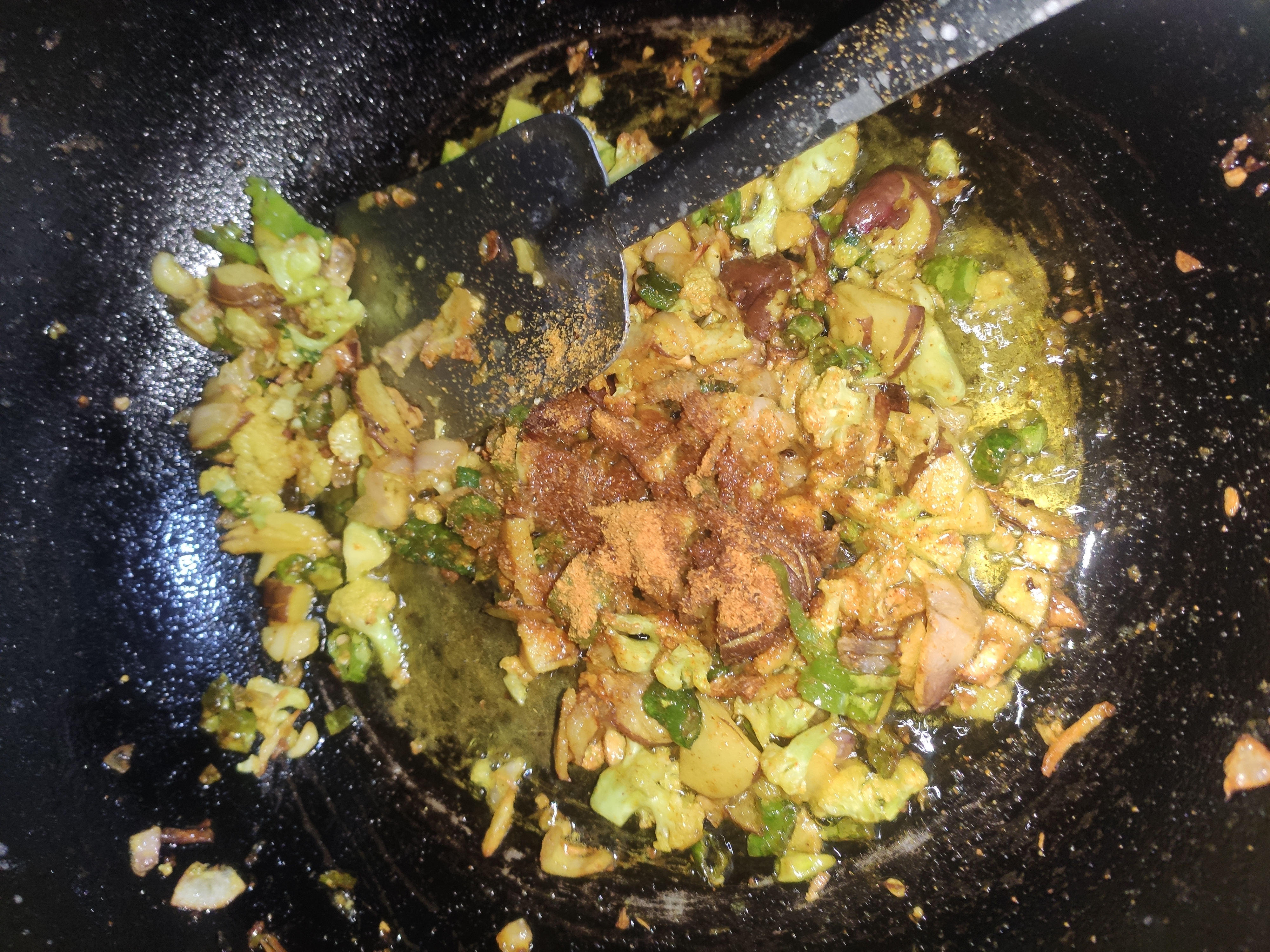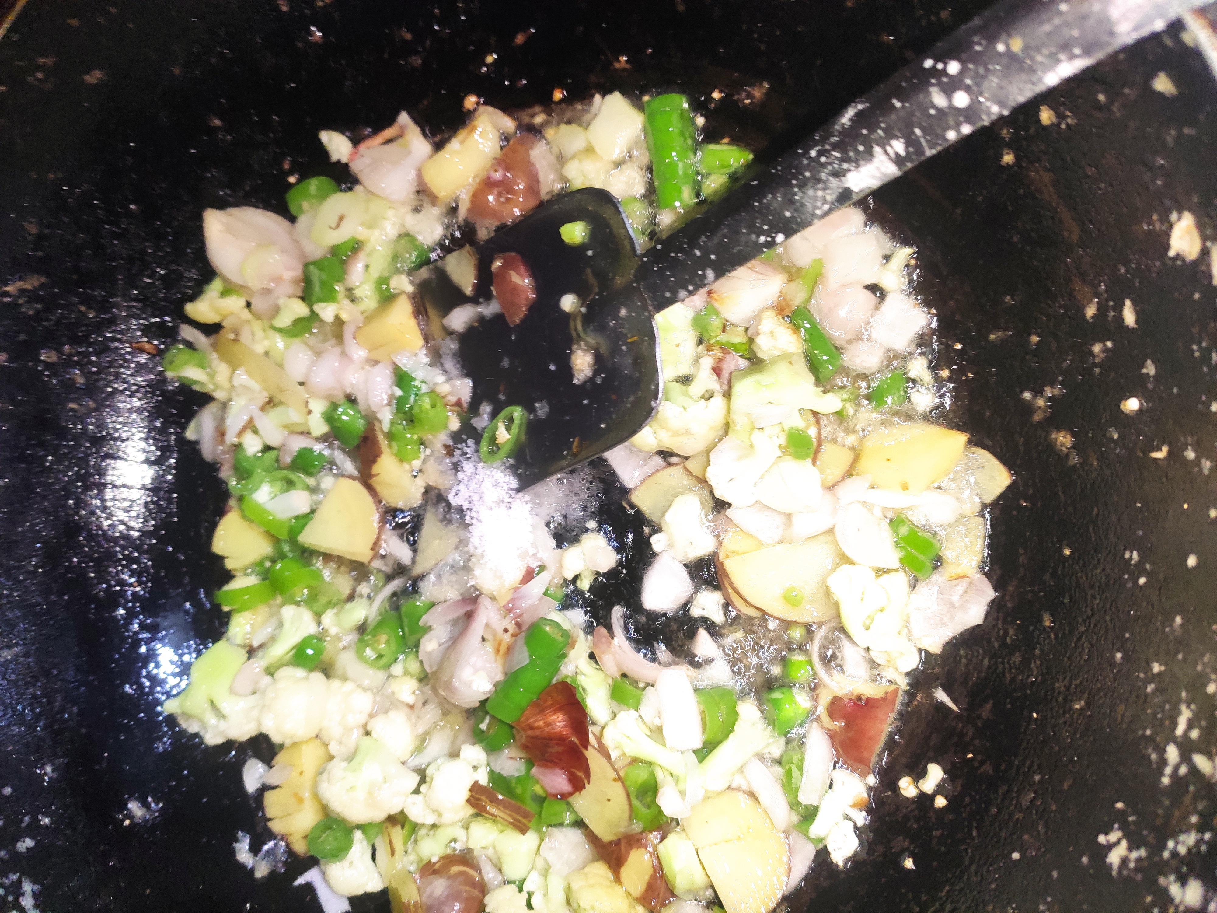 ৩: এখন কড়াই এ তেল গরম করে তাতে কেটে রাখা কাঁচা মরিচ, আলু, ফুলকপি ও পেঁয়াজ কুচি গুলে দিতে হবে ও সামান্য লবন দিয়ে ভেজে নিতে হবে।