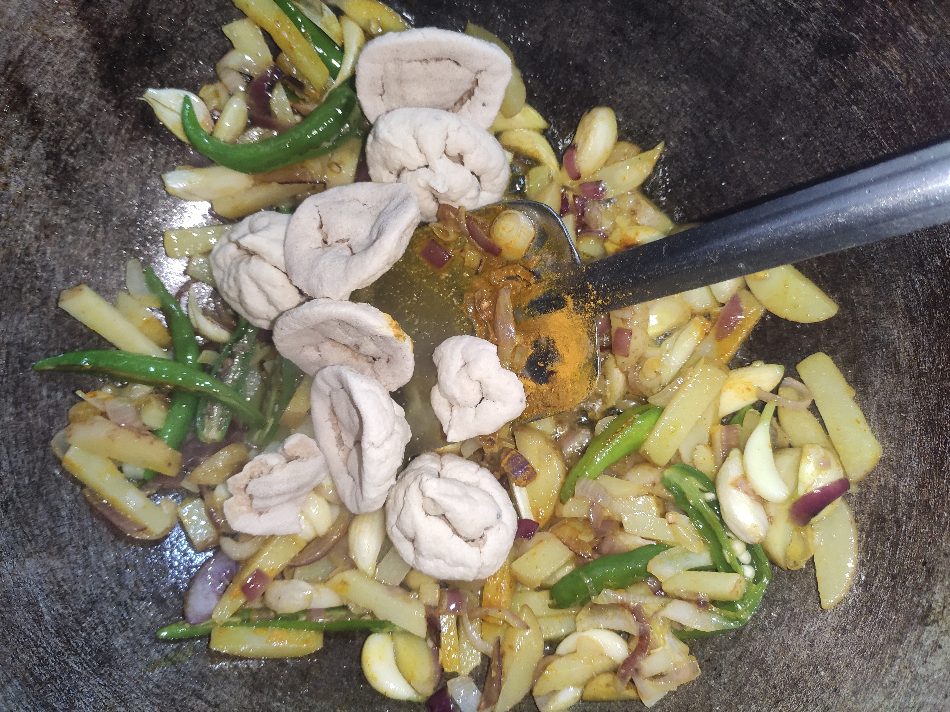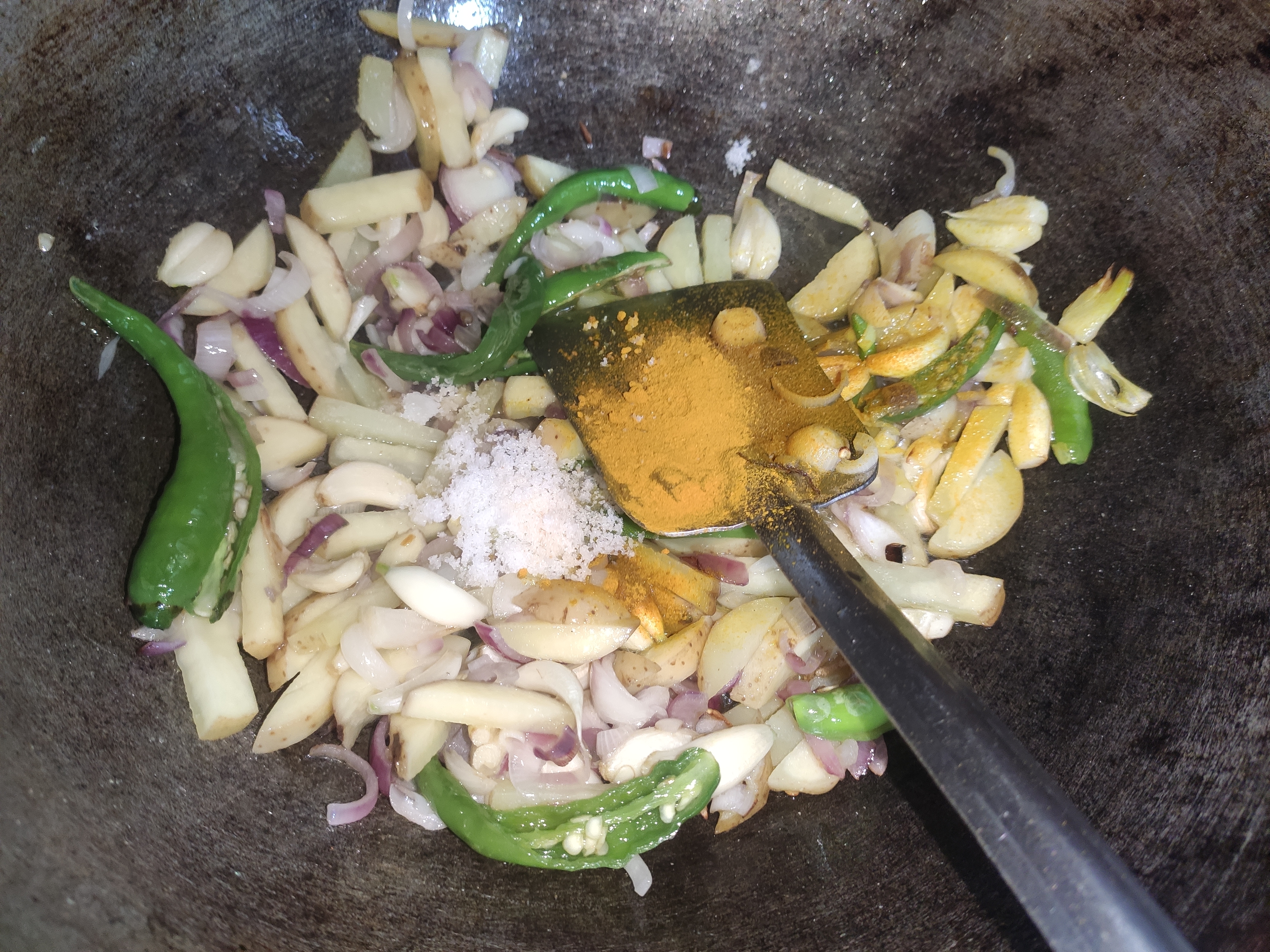 ৩: এখন আলু কুচি ও হলুদের গুঁড়ো স্বাদমতো লবন দিতে হবে।