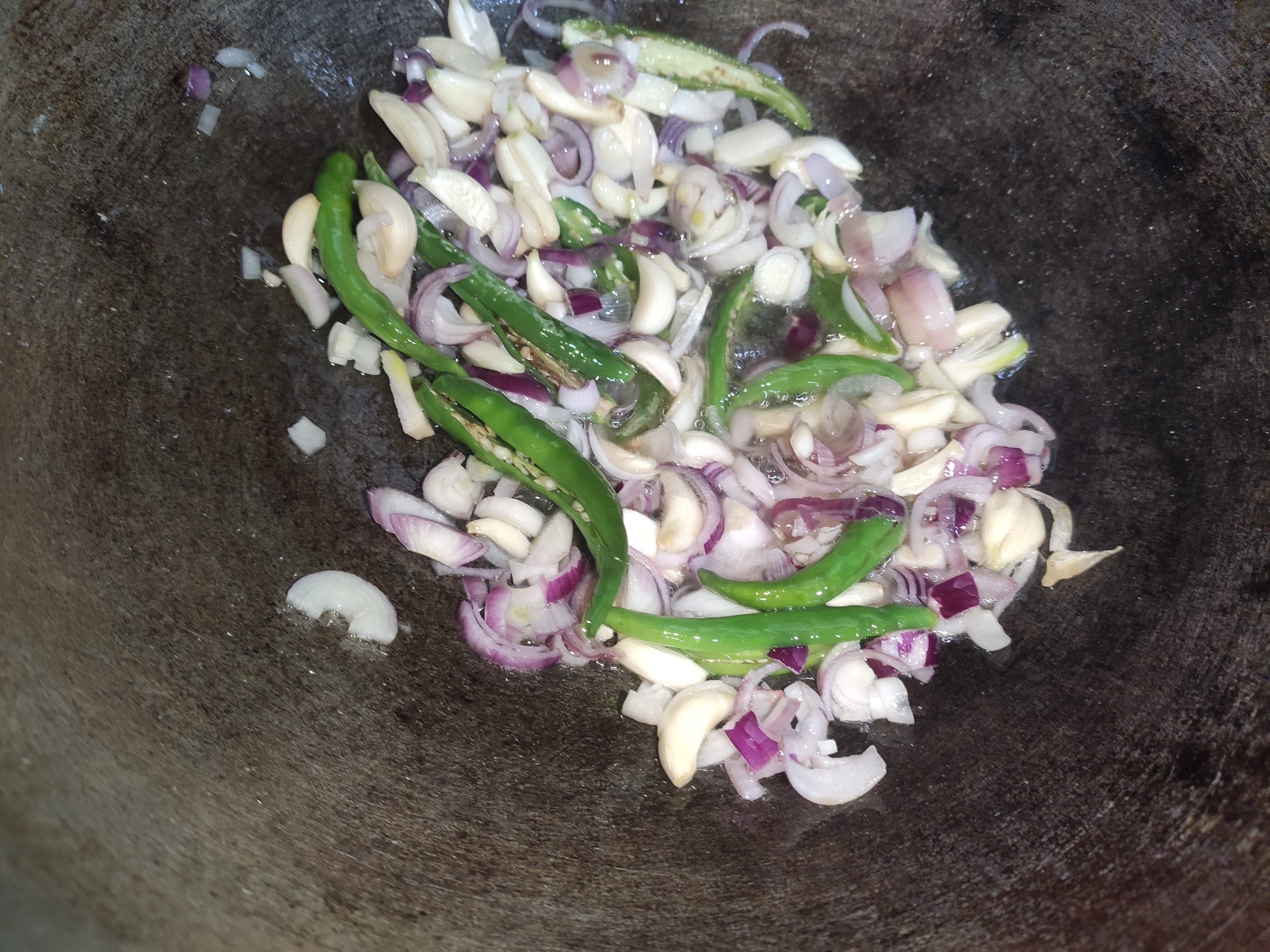 ২: এবার কড়াইতে তেল গরম করে তাতে পেঁয়াজ কুচি, কাঁচামরিচ ও রসুন কুচি দিতে হবে।