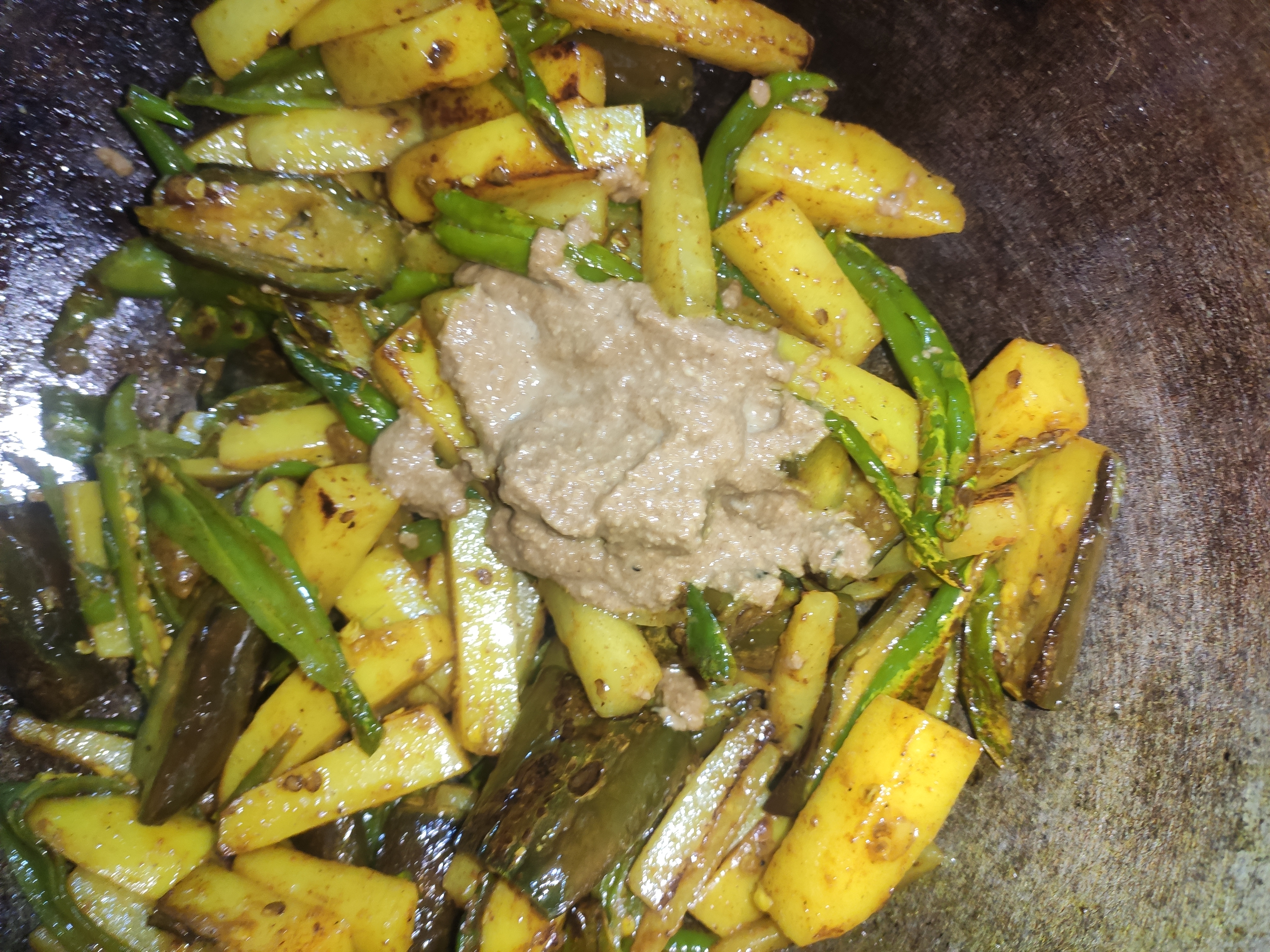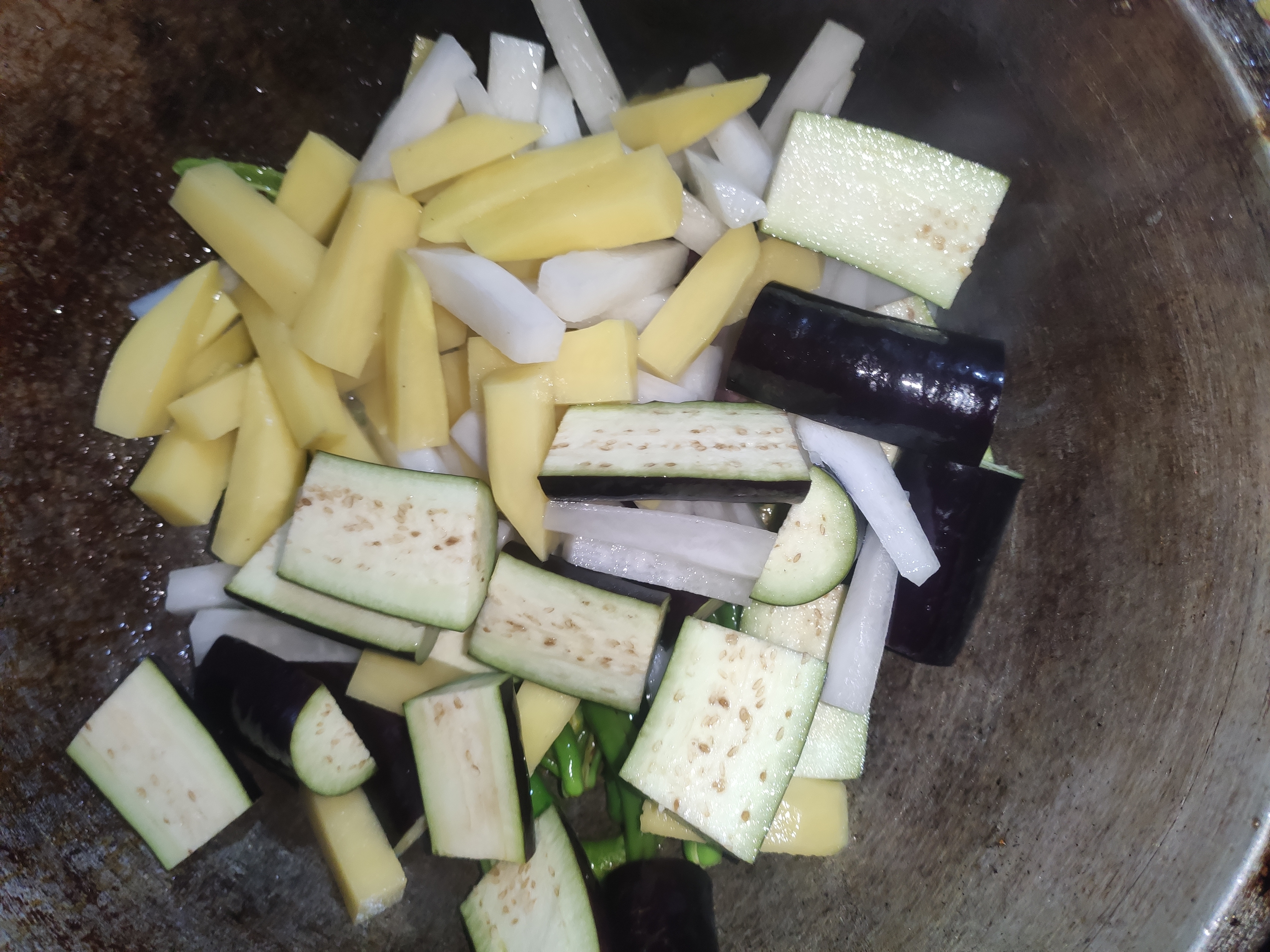 ৩: এখন আলু, বেগুন ও মুলা গুলো দিয়ে দিতে হবে, সাথে হলুদ গুঁড়া ও লবন দিতে হবে ওভাজতে হবে।