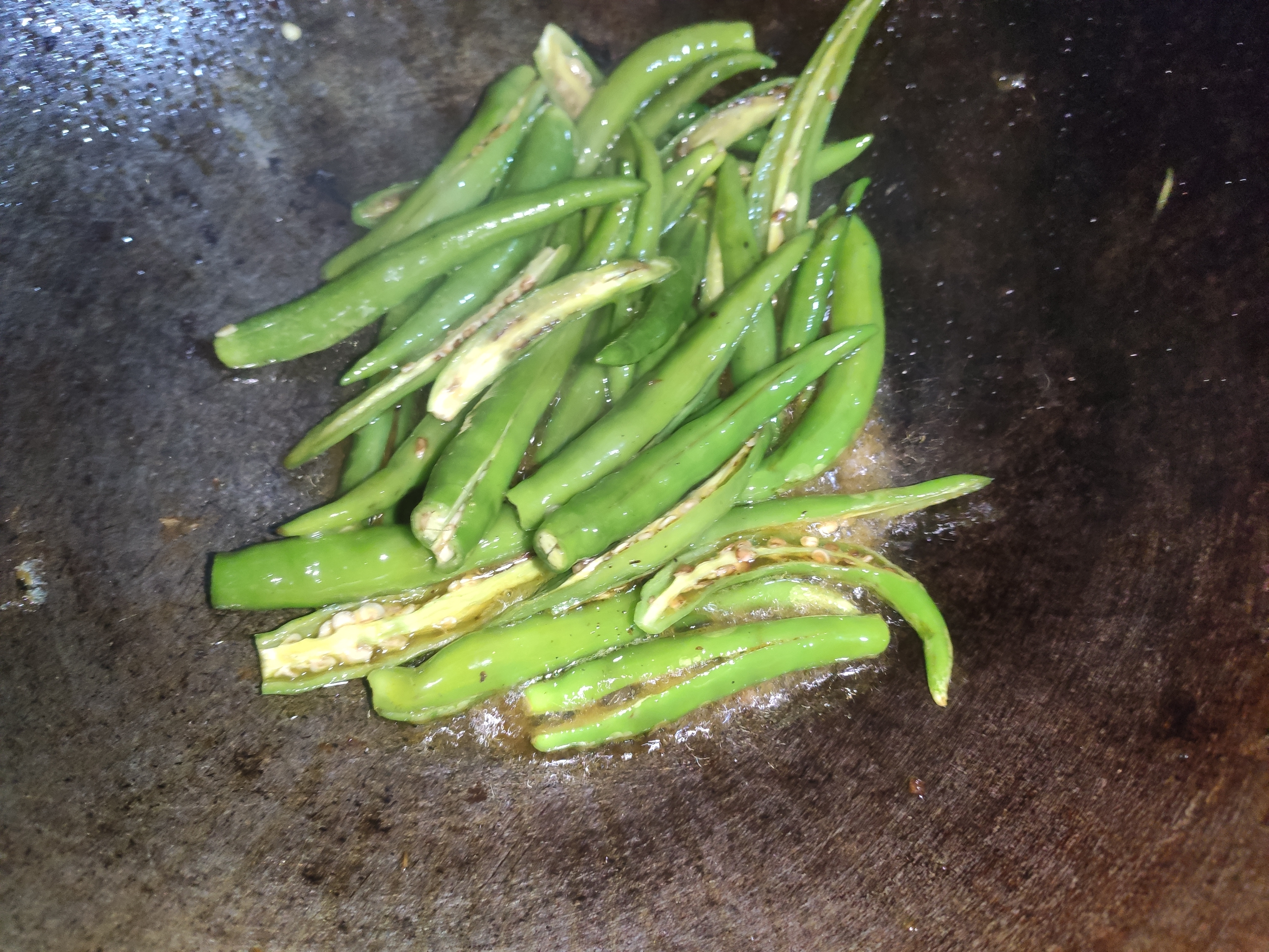 ২: এবার ঐ তেলে কাঁচা মরিচ গুলো দিয়ে দিতে হবে।