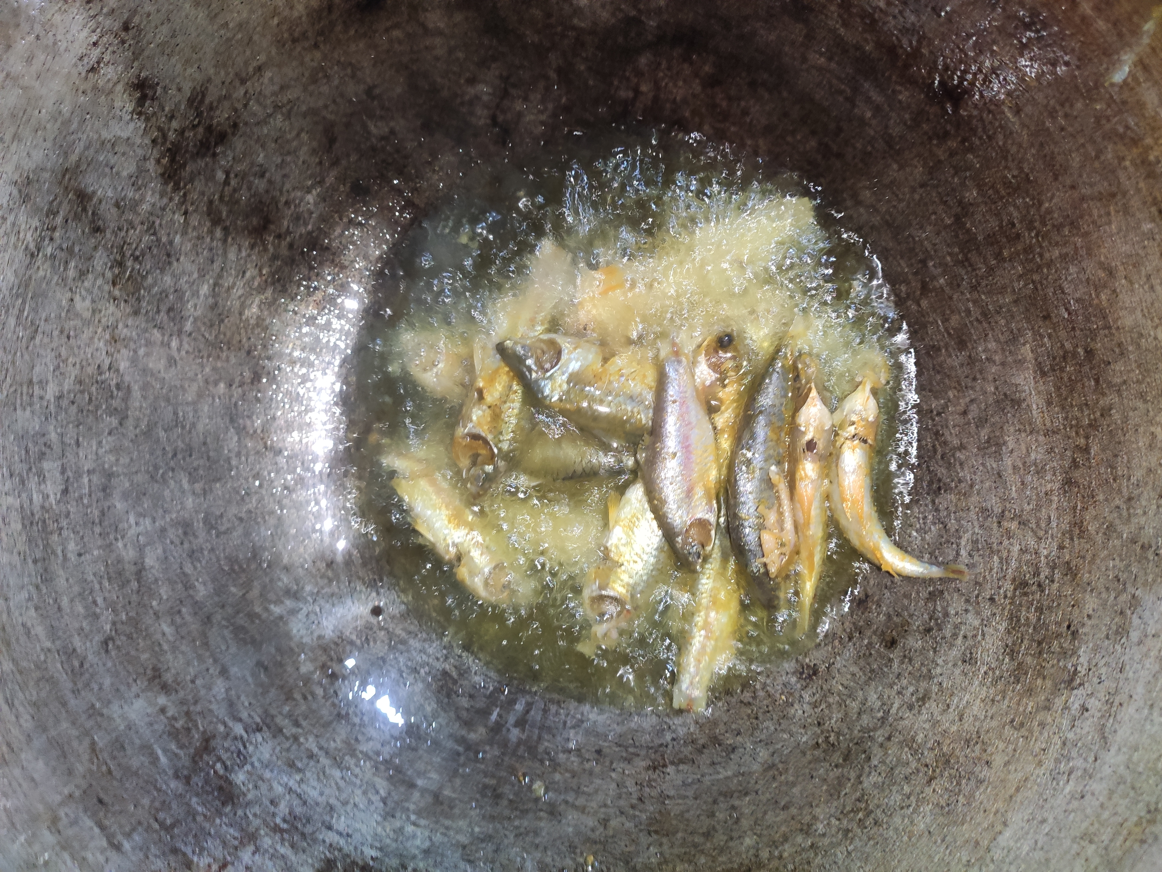 ১: শুরুতে মাছ গুলো হলুদ গুঁড়া ও লবন দিয়ে মাখিয়ে নিতে হবে ও কড়াইতে তেল গরম করে ভেজে নিতে হবে।