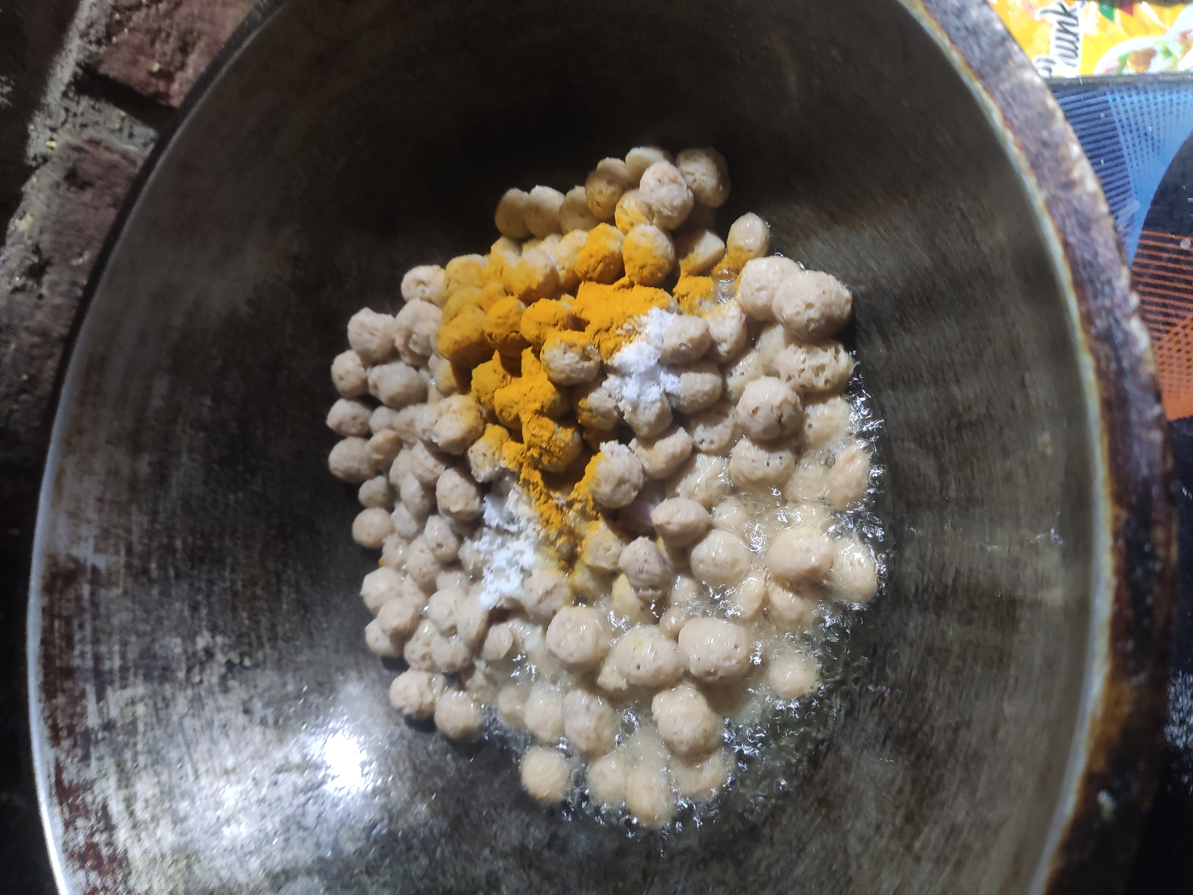 ১:শুরুতে সিদ্ধ করা সয়াবিন গুলো হলুদ ও লবন দিয়ে হালকা ভেজে নিতে হবে।
