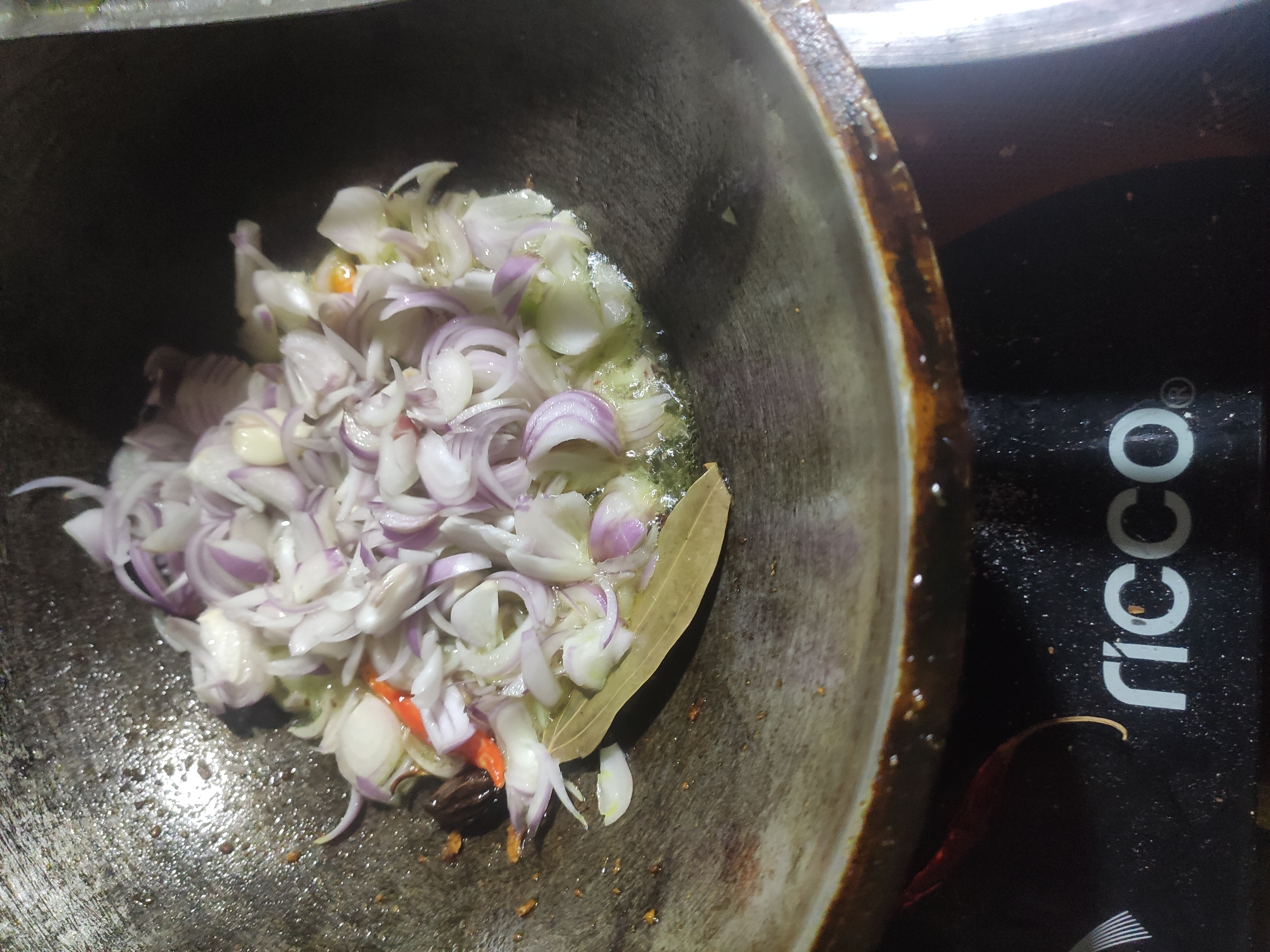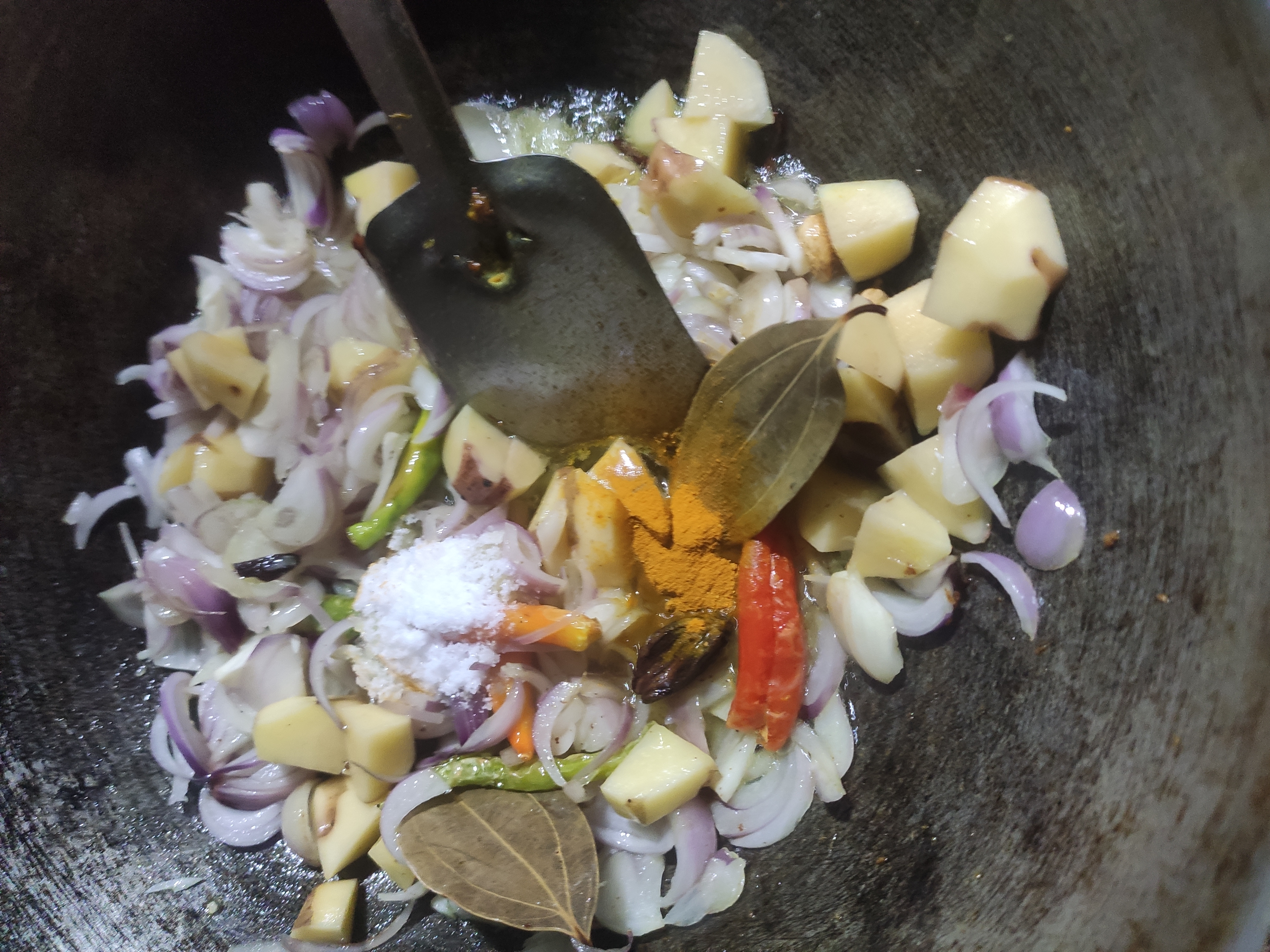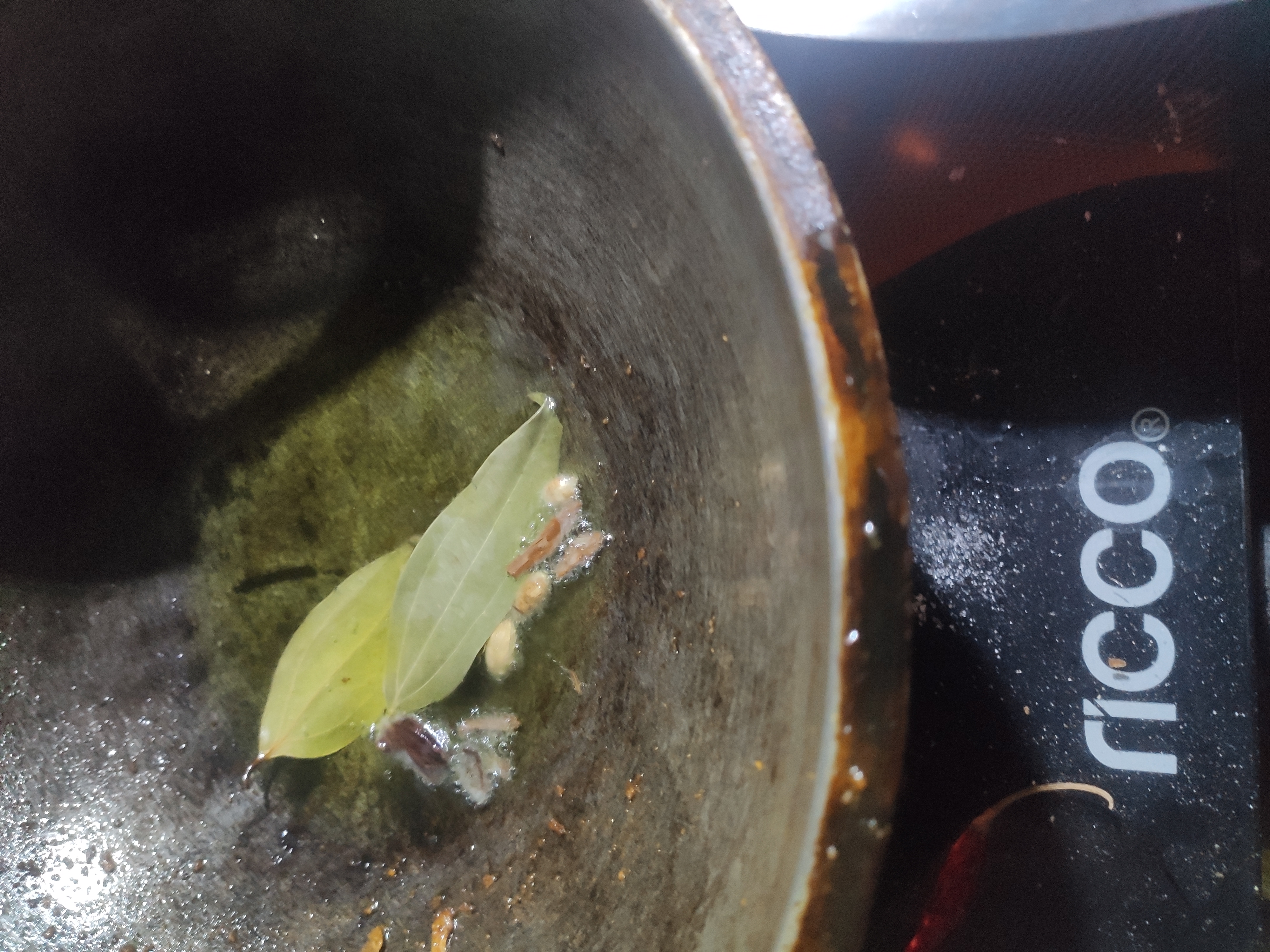 ২: এখন তেলে তেজপাতা, সাদা এলাচ ও দারচিনি দিতে হবে।