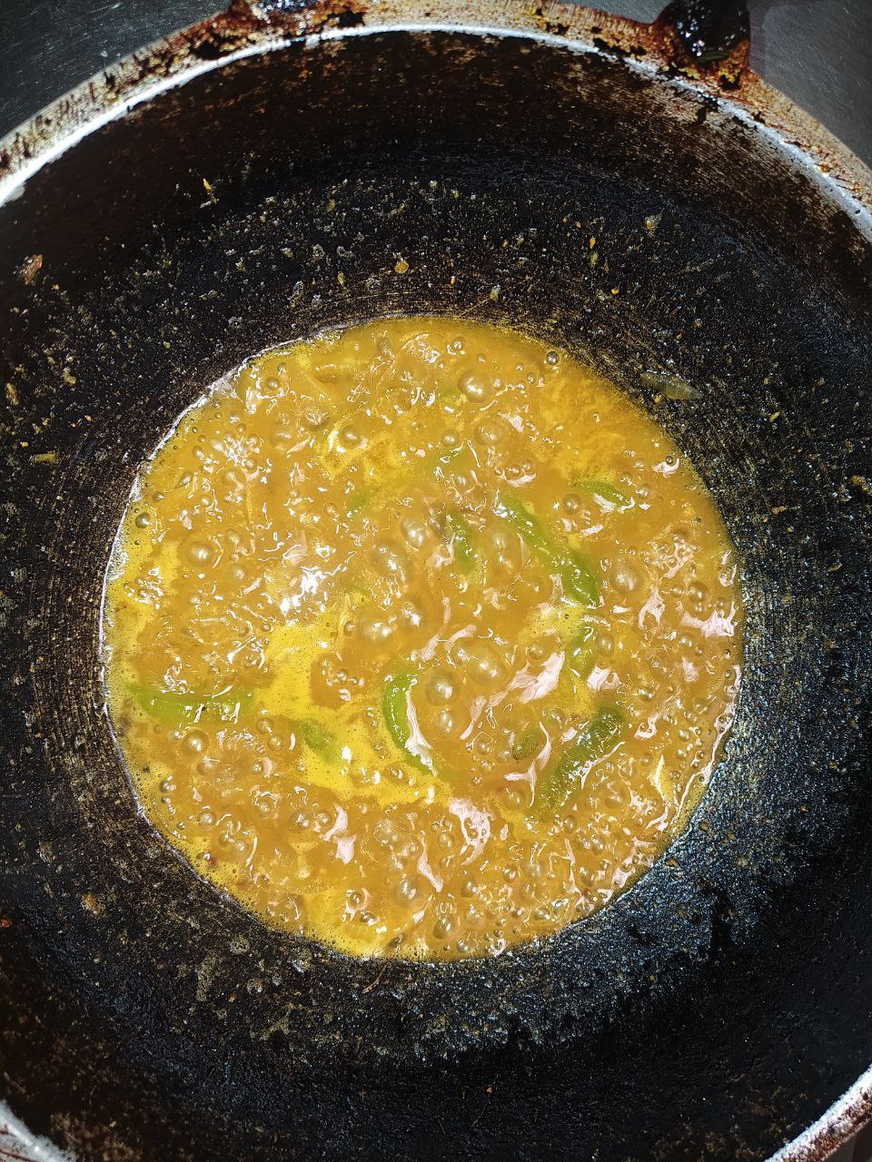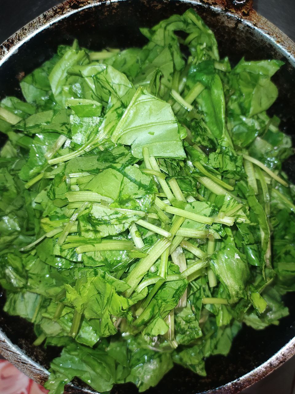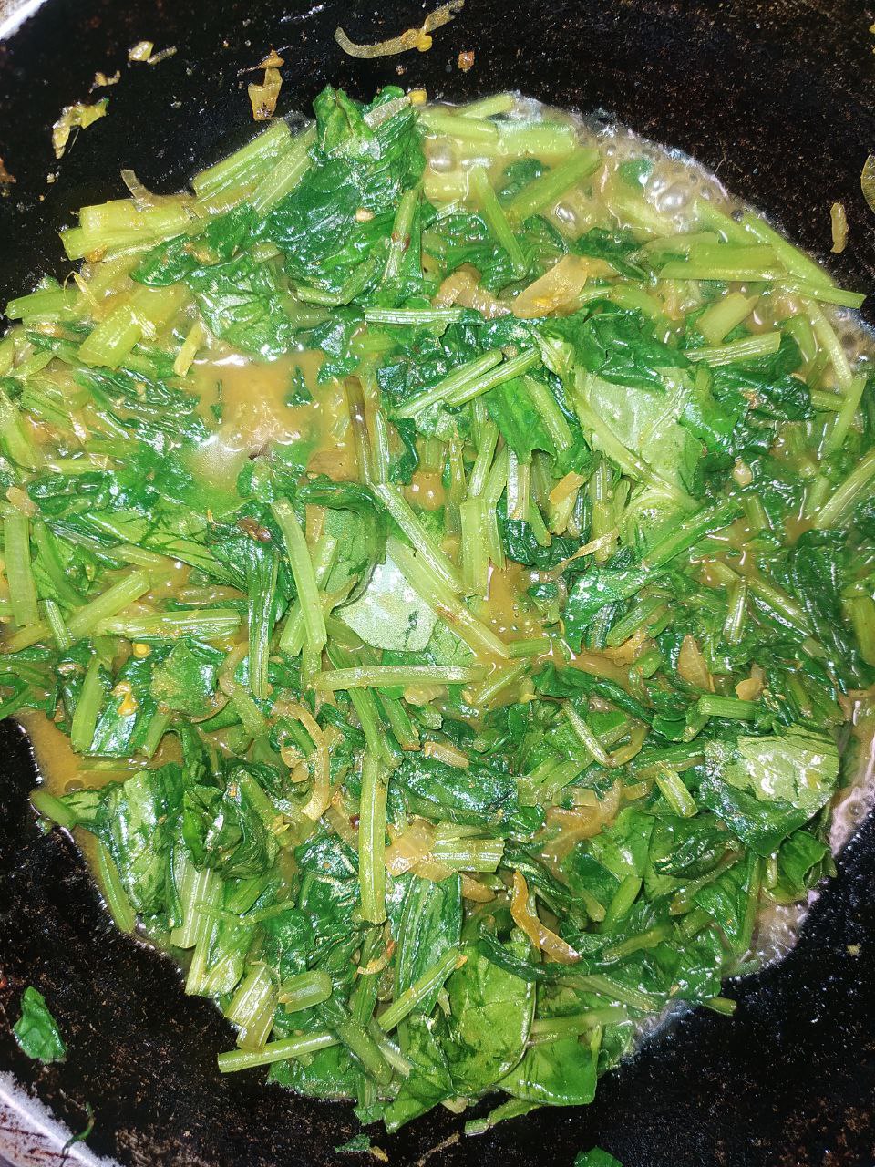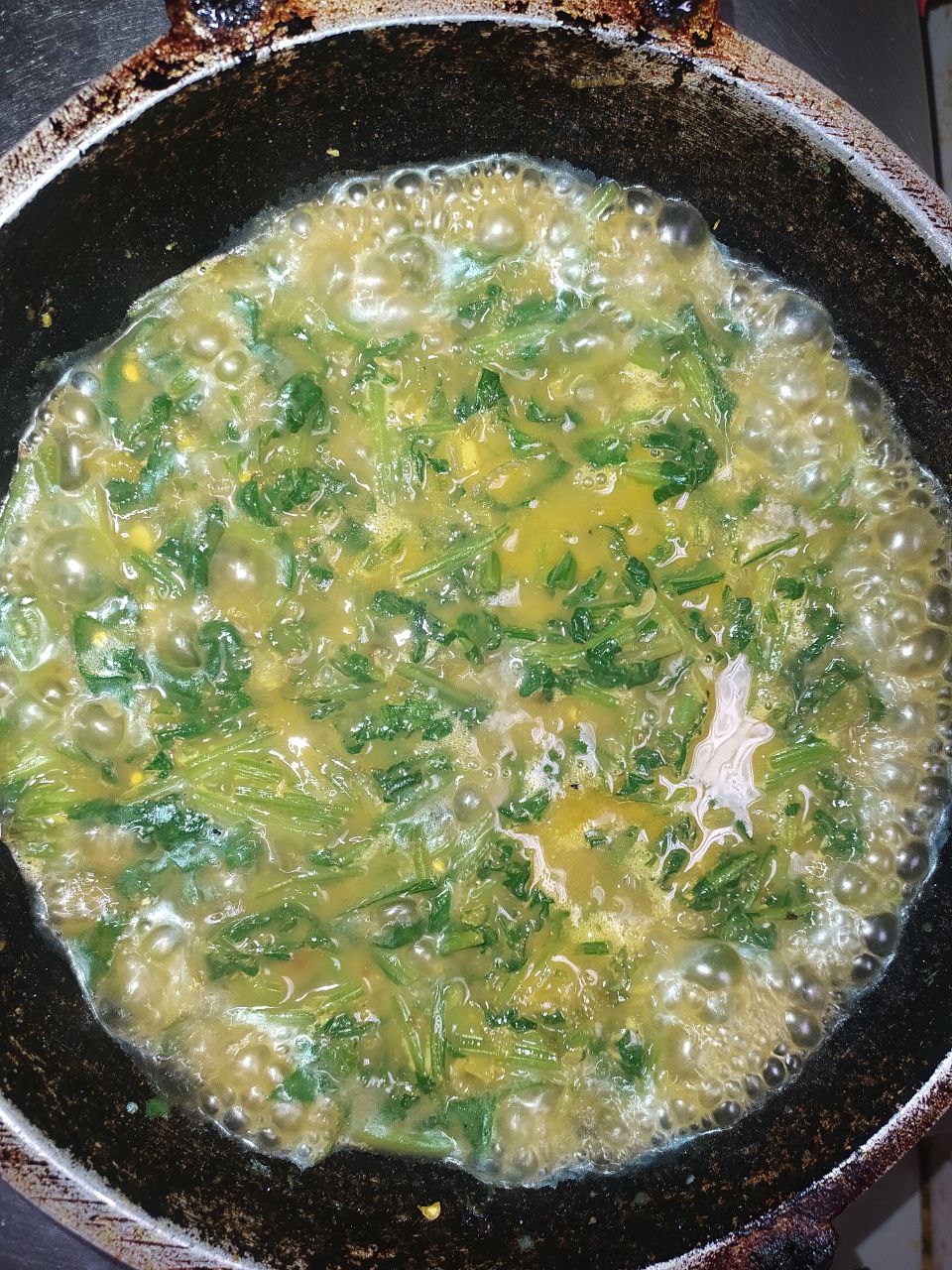 তারপর আবার কড়াইতে তেল দিয়ে কাঁচা মরিচ,জিরা,হলুদ সহ সব মসলা দিয়ে একটু পানি দিয়ে ঝোল করে নিলাম। তারপর কেটে কুচি করে রাখা পালংশাক গুলো কড়াইতে দিয়ে একটি ঢাকনা দিয়ে ঢেকে দিলাম।