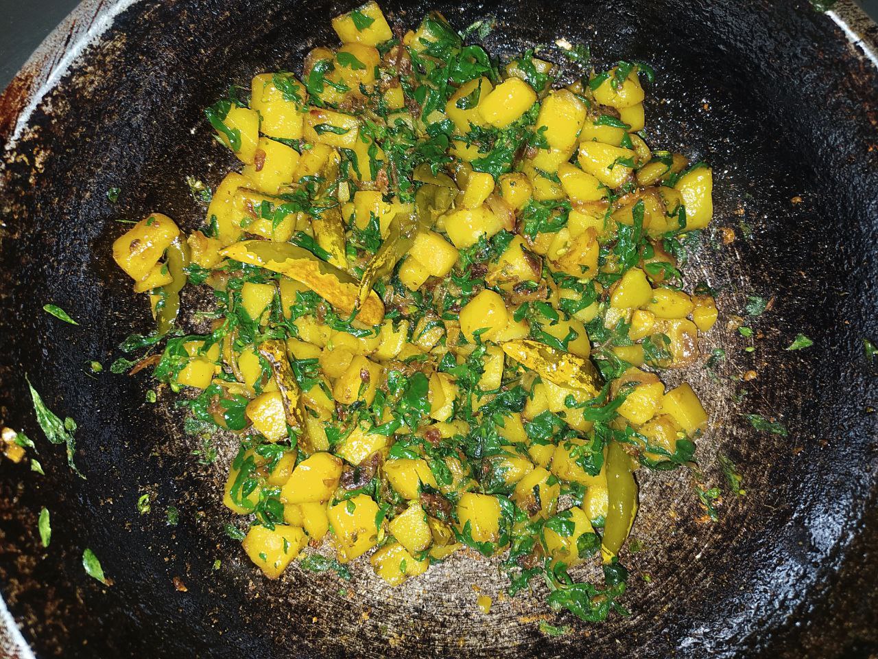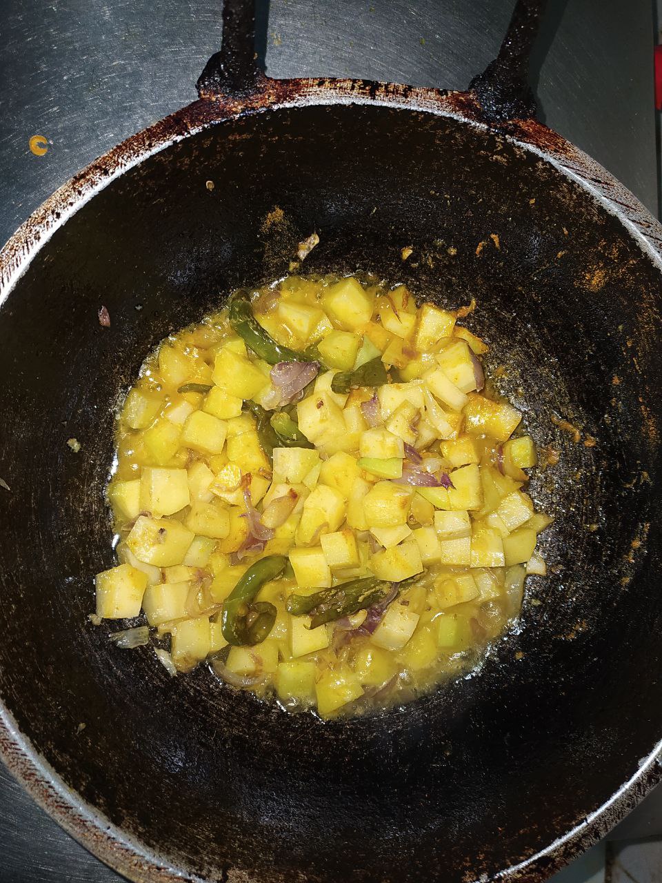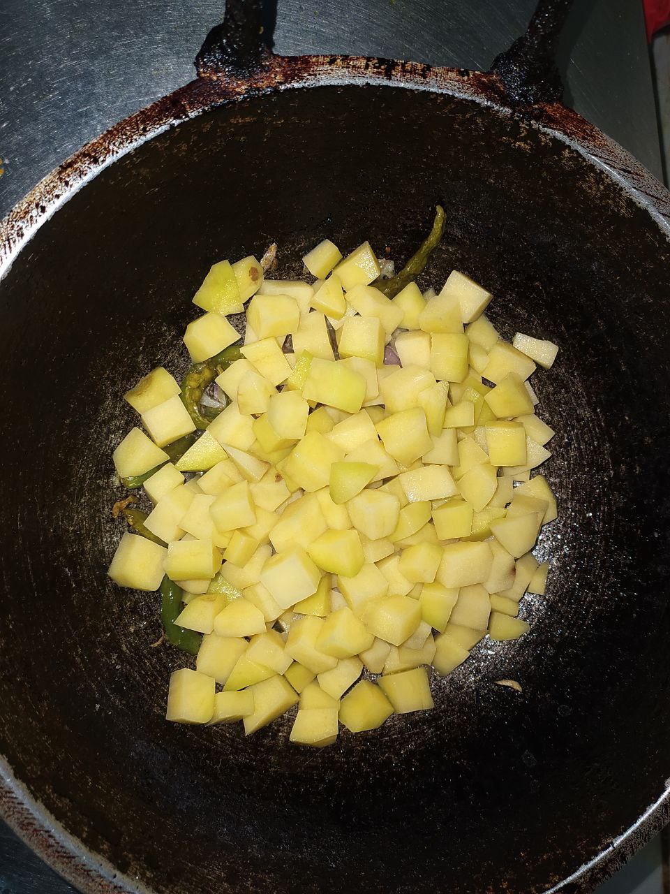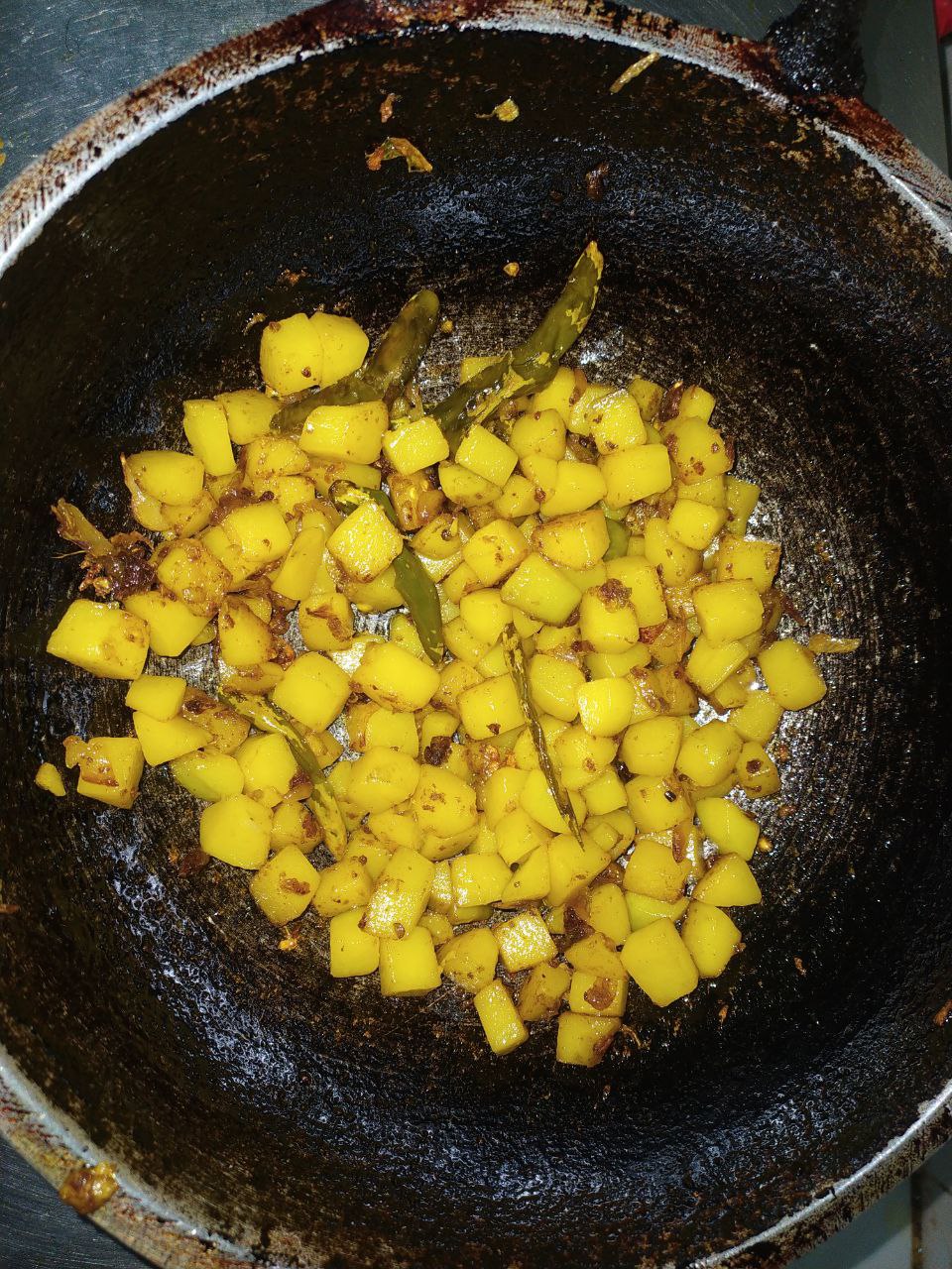 তারপর ছোট ছোট টুকরো করে রাখা আলু গুলো কড়াইতে দিয়ে দিলাম। দশ থেকে পনের মিনিট সময় নিয়ে আলো গুলো সিদ্ধ করে ভাজা ভাজা করে নিলাম।