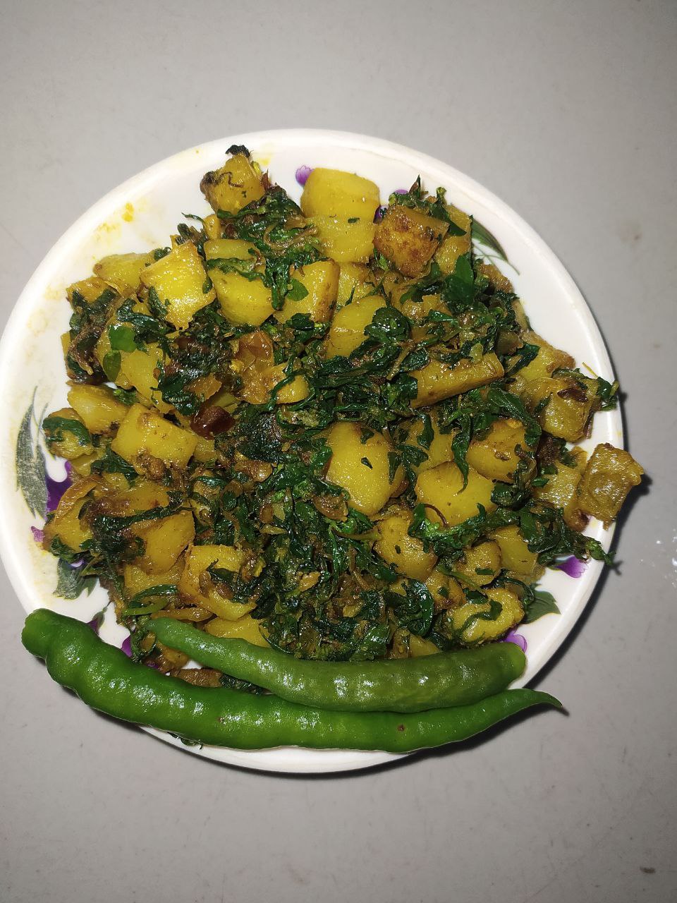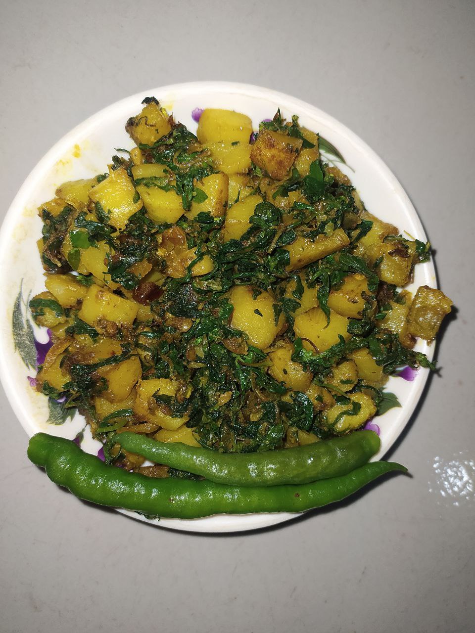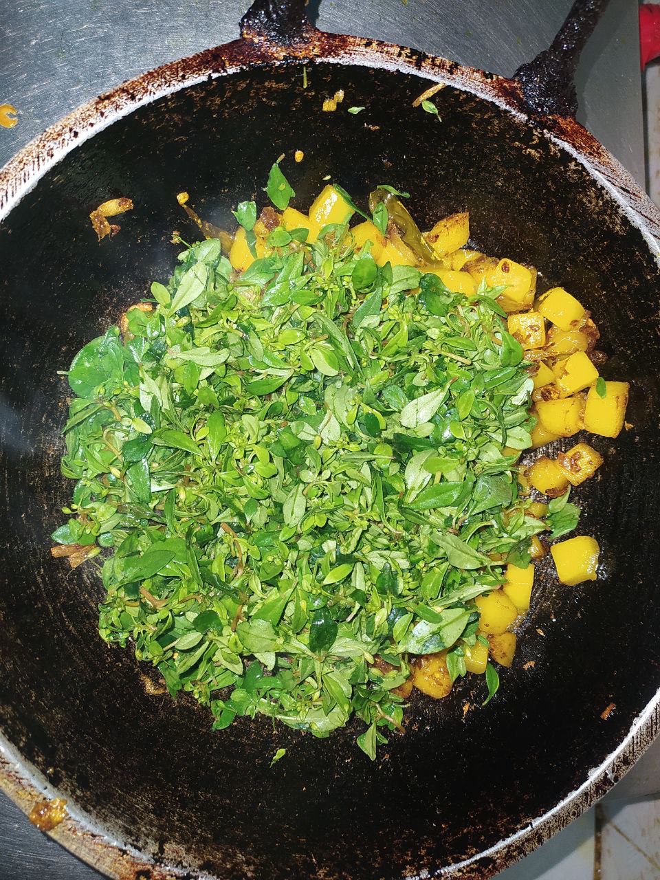 তারপর বেছে রাখা গিমা শাক গুলো আলুর সাথে কড়াইতে দিয়ে দিলাম। গিমা শাক গুলো কড়াইতে দেওয়ার সাথে সাথে মিশে গেছে। এখানে গিমা শাকের তুলনায় আলুর পরিমান বেশি হয়ে গেছে। আলু বেশি দেওয়ার কারনে একটি উপকার হয়েছে,খেতে বেশি তিতা লাগে নাই। পাঁচ মিনিটের মত রান্না করে রেসিপিটা শেষ করে দিলাম।