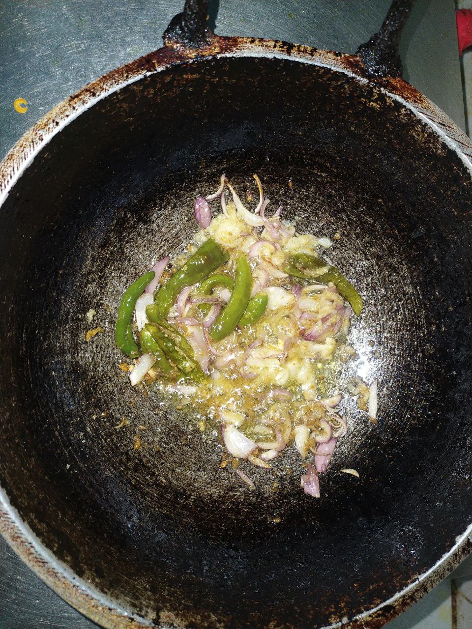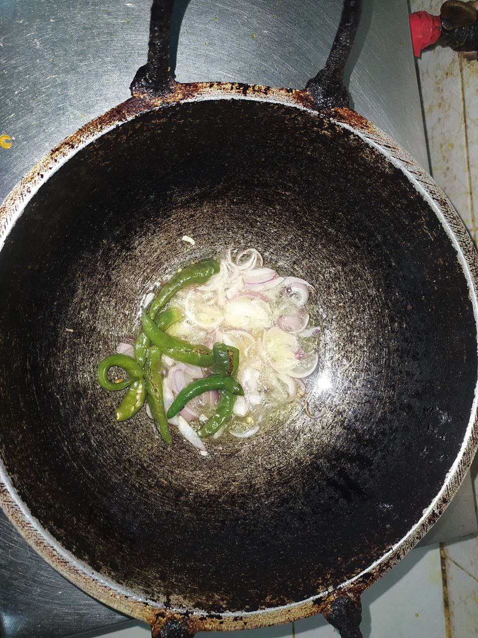 প্রথমে চুলাতে কড়াই বসিয়ে তেল দিয়ে দিলাম। তেলটা গরম হওয়ার পরে পেয়াজ আর কাচঁমরিচ দিয়ে দিলাম।