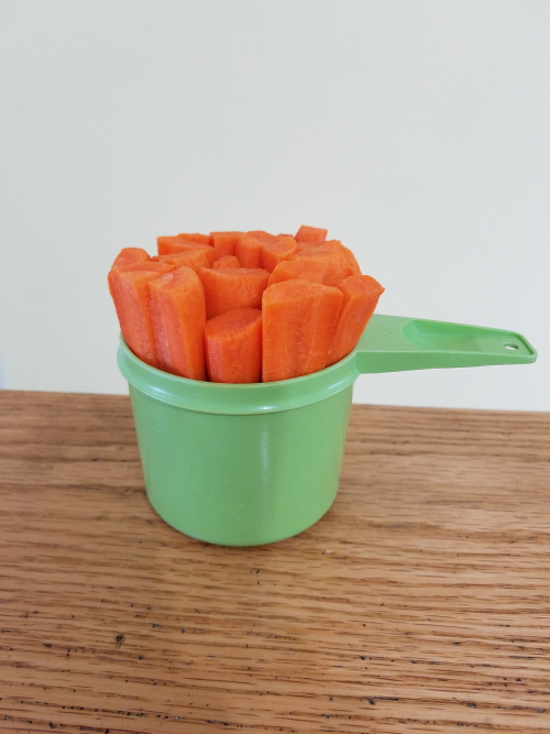 Recently I tried out a recipe for a stew and it called for one cup of carrots. Hmm. Did that mean diced, or sliced, or cut into rounds? Apparently, that detail was left up to the cook. So this was my solution.