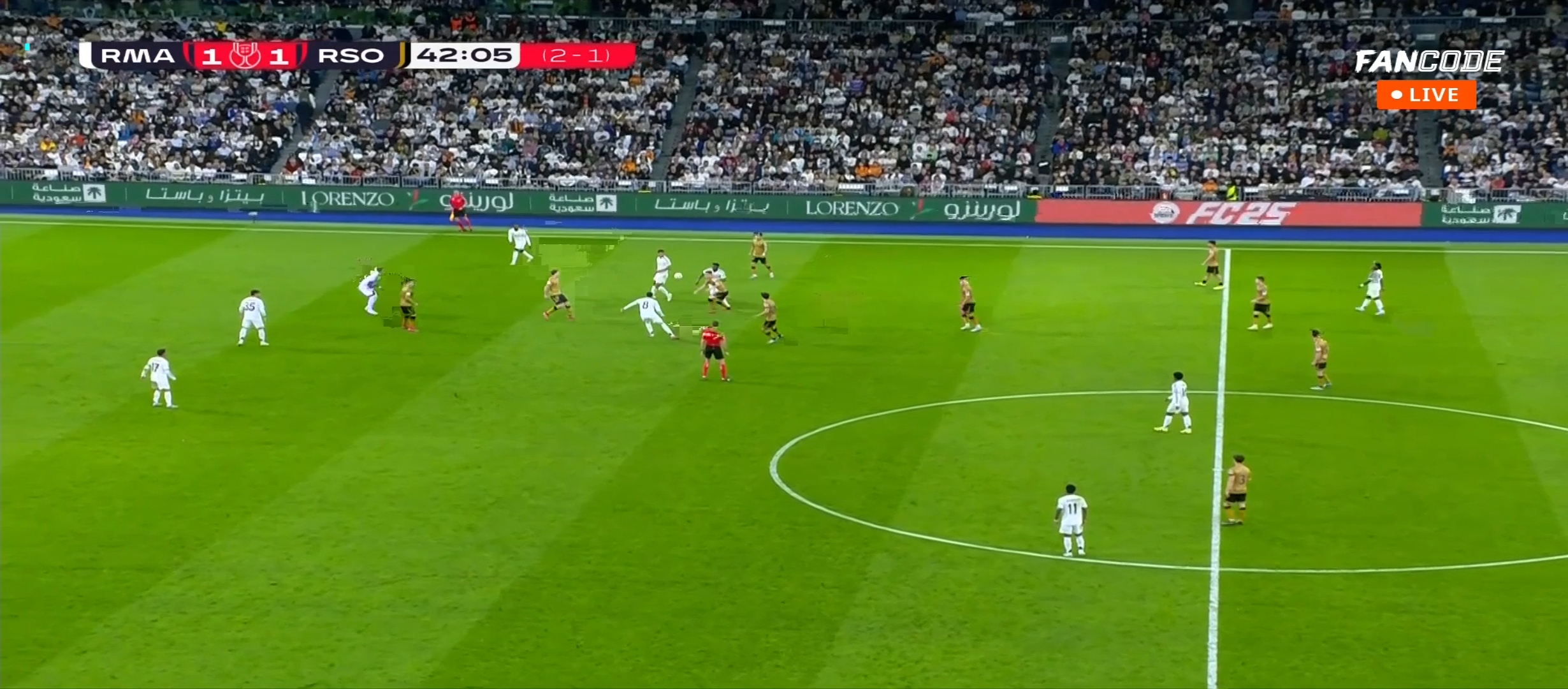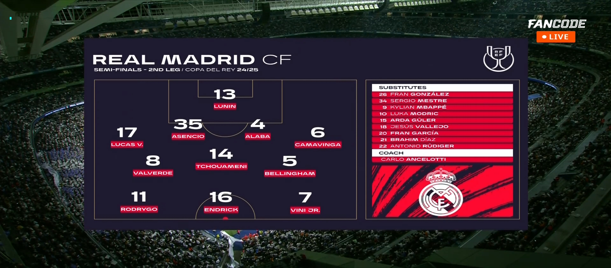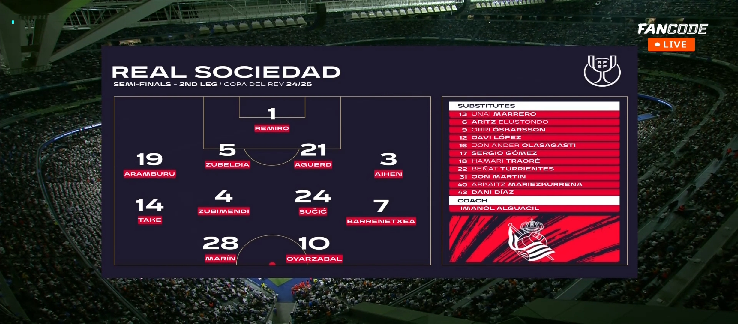 কোপা দেল রে গুরুত্বপূর্ণ একটা ট্রফি। ট্রেবল জিততে হলে অবশ‍্যই এটা জিততে হবে। কোপা দেল রে এর সেমিফাইনালে রিয়াল মাদ্রিদের প্রতিপক্ষ ছিল রিয়াল সোসিয়েদাদ। প্রথম লেগ শেষে ১-০ তে এগিয়ে ছিল রিয়াল মাদ্রিদ। গতকাল দ্বিতীয় লেগে আবার মাঠে নেমেছিল দুইদল। যথারীতি আমি ভেবেছিলাম রিয়াল মাদ্রিদ সহজেই ম‍্যাচটা জিতে যাবে। কিন্তু সেটা মোটেই হয়নি। রিয়াল সোসিয়েদাদ কঠিন পরীক্ষা নিয়েছে রিয়াল মাদ্রিদের। গতকাল রিয়াল মাদ্রিদের শুরুর একাদশে ছিল আঠারো বছর বয়সী তরুণ এন্ড্রিক। কোপা দেল রে এর ৪ ম‍্যাচে এন্ড্রিক চারটা গোল করেছে ইতিমধ্যে। এইজন্যই কার্লো আনচেলওি তাকে শুরুর একাদশে রাখে। অন‍্যদিকে সোসিয়েদাদ মাঠে নামে ৪-৩-৩ ফর্মেশনে।