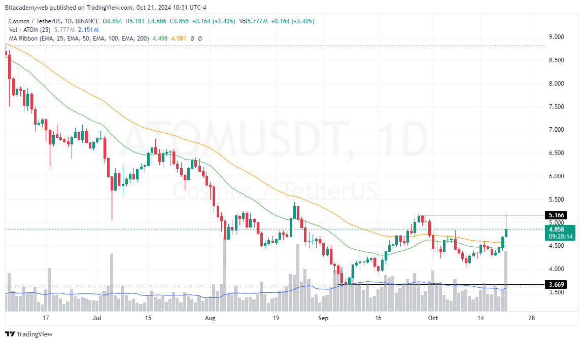 The ATOM token, a fundamental pillar of the Cosmos network, has experienced remarkable consolidation in recent weeks, leaving behind the downward trend that began in March 2024. After finding support at $3.66, ATOM is showing signs of recovery, although it is still 26.85% below its highs from a year ago.