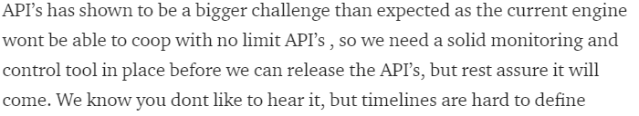 Most of you won't like this news but it's actually hidden good news: Rune is stating that actually the API is implemented, they simply don't have a tool to monitor it yet. to say it diffrently : the road is built, but there is no way yet to regulate the speed limit yet. So API could be pushed live as soon as they have the tools for controlling it.