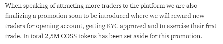 New traders! => more traders = more volume if they actually trade. it would benefit COSS if the 0% fee is instated first so the orderbooks could fill up a bit.