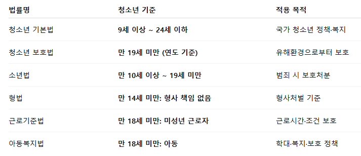 청소년이라는 단어는 우리가 일상에서 흔히 쓰는 표현이지만, 법적으로는 “청소년”의 나이 범위가 법률마다 다르게 정의되어 있다. 청소년기본법에서는 예를 들어, 9세에서 24세, 다른 법에서는 19세 미만을 청소년으로 보기도 한다.