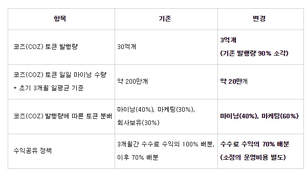 코즈 출시 기념 페이백 및 거래왕 에어드랍: 변경된 발행량 기준에 따라 기존 지급기준 수량을 10%로 비율을 조정하여 지급합니다.